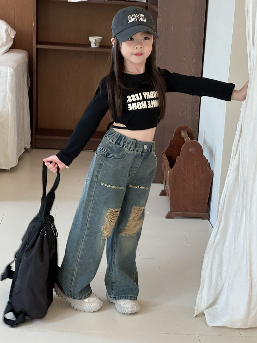 소녀 청바지 가을 새로운 한국 팬 복고풍 오래된 구멍 스트레이트 바지 넓은 다리 바지 어린이 머리카락 세대