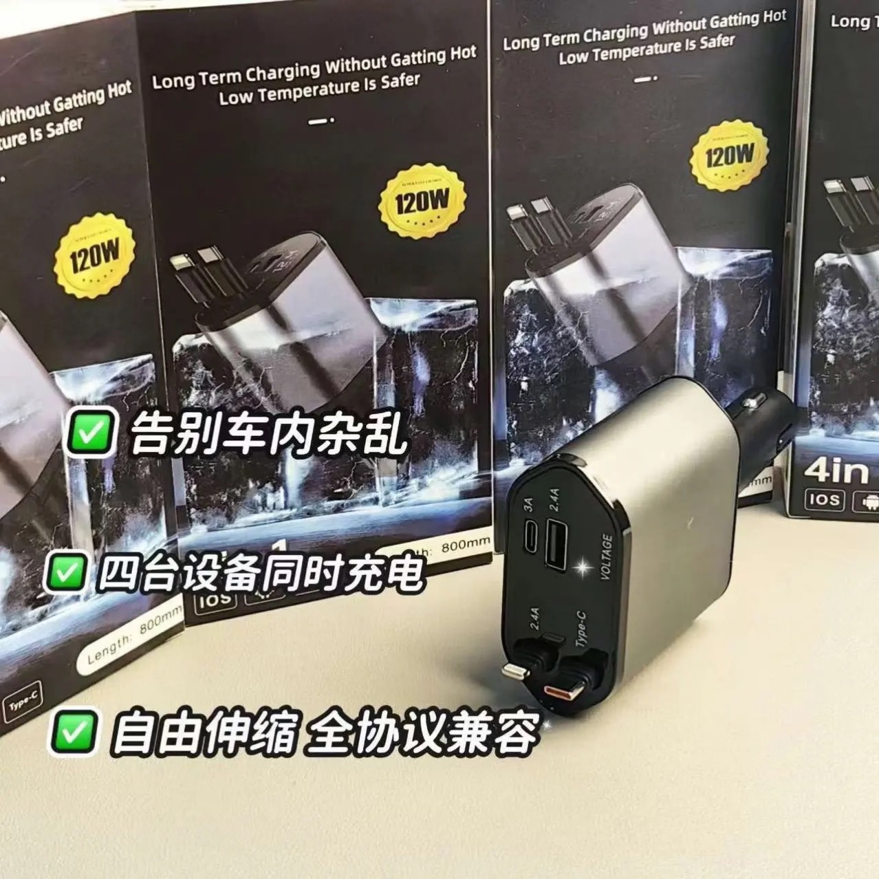 신형 120W 차량용 고속 충전기, 차량용 4-in-1 텔레스코픽 케이블, 휴대폰 인터페이스, 시가 라이터, 신축형