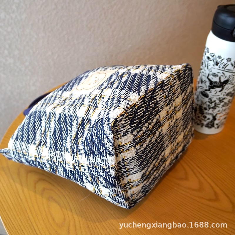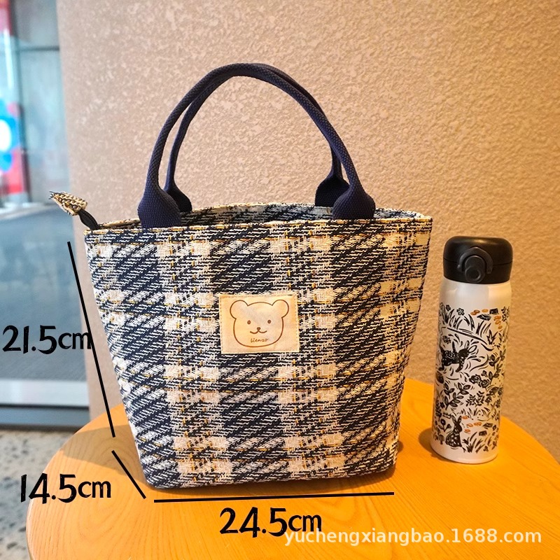 패션 체크 패턴 대용량 학생 캔버스 가방 휴대용 도시락 가방 두껍게 간단한 올 매치 캐주얼 지퍼 점심 가방