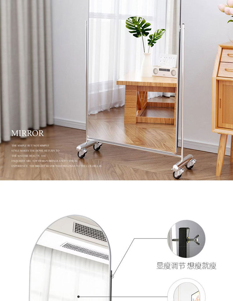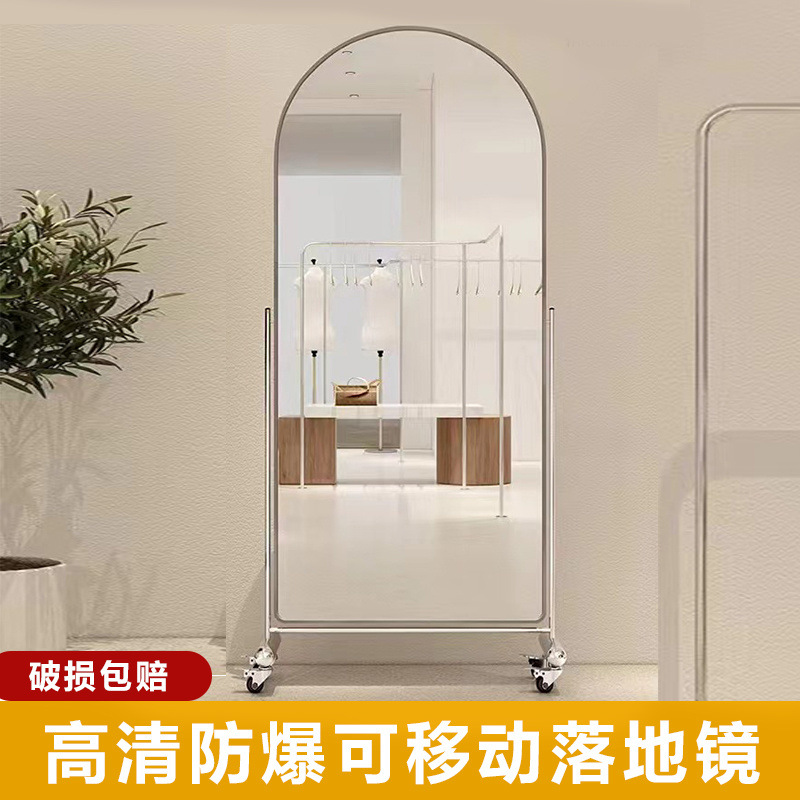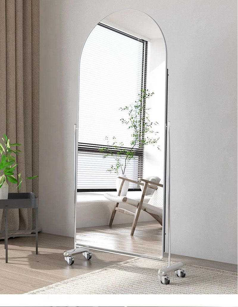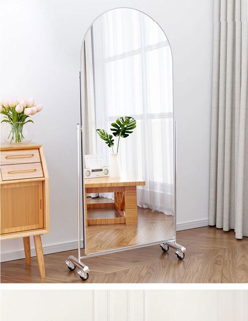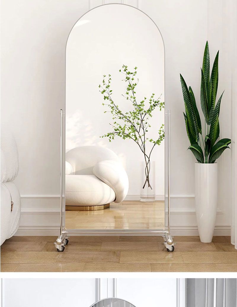 스테인레스 스틸 아치 전체 길이 거울 슈퍼 화이트 미러 모바일 전체 길이 거울 비 변형 바닥 거울 의류 매장 용 바퀴