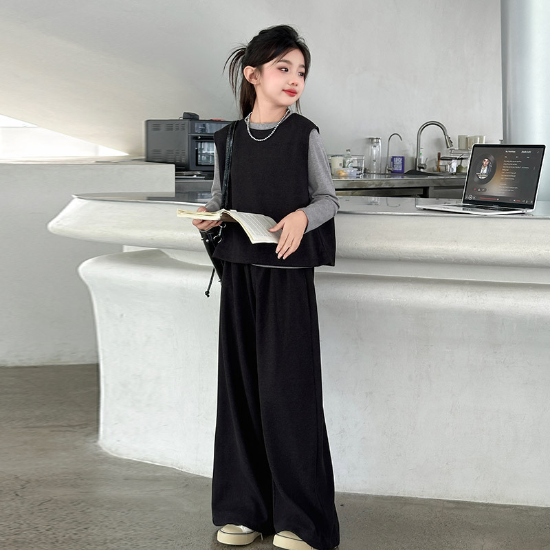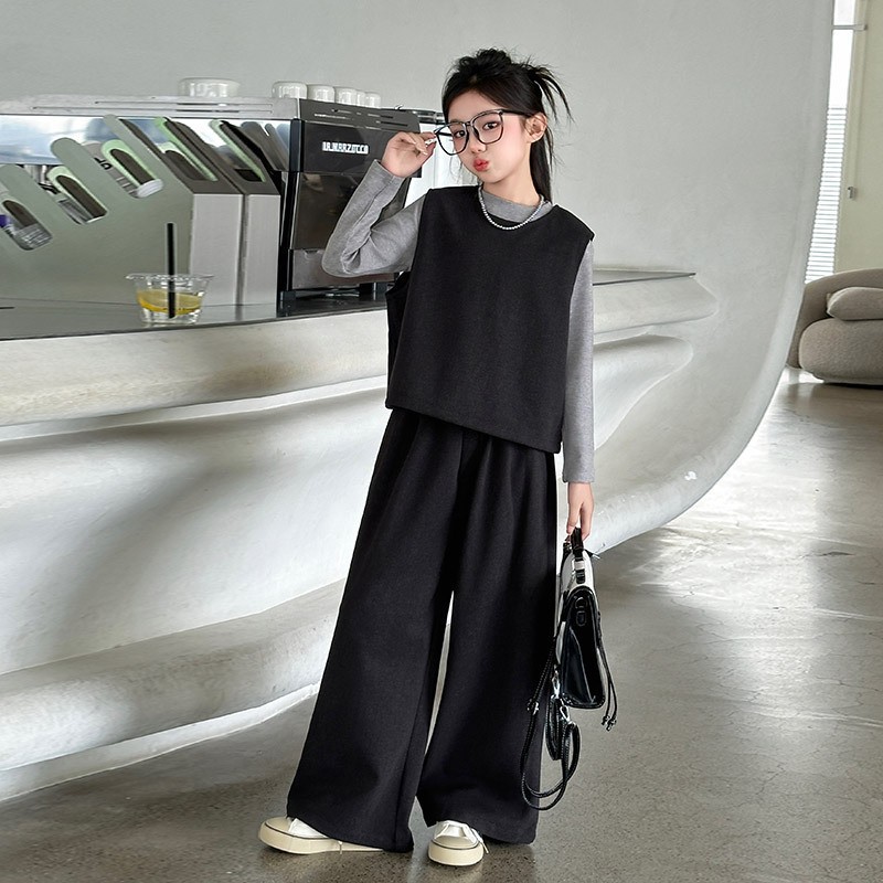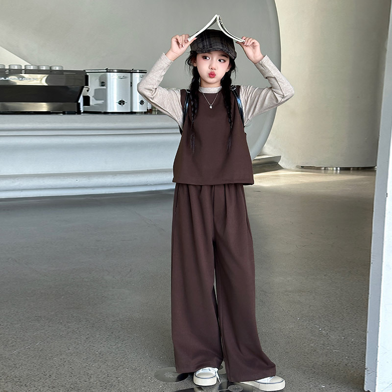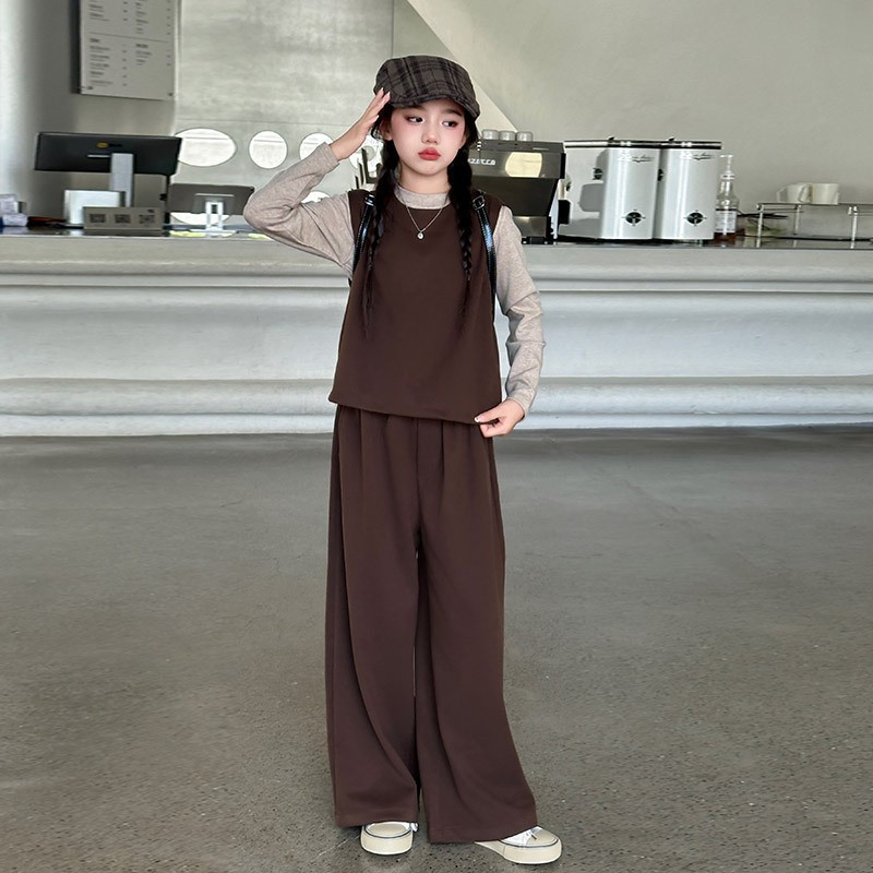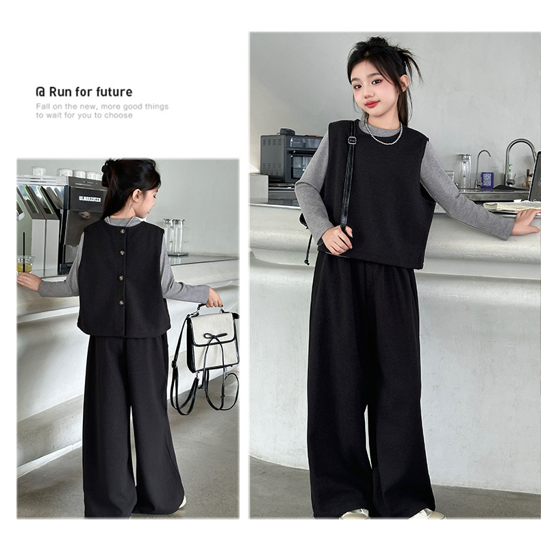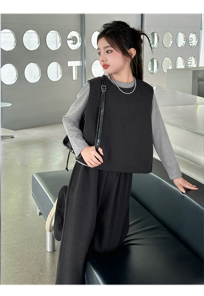 여아용 하의 셔츠, 조끼, 와이드 팬츠 3종 세트 2025년 늦가을 스타일 중대형 아동용 긴팔 모직 조끼와 스트레이트 팬츠스토어 가기