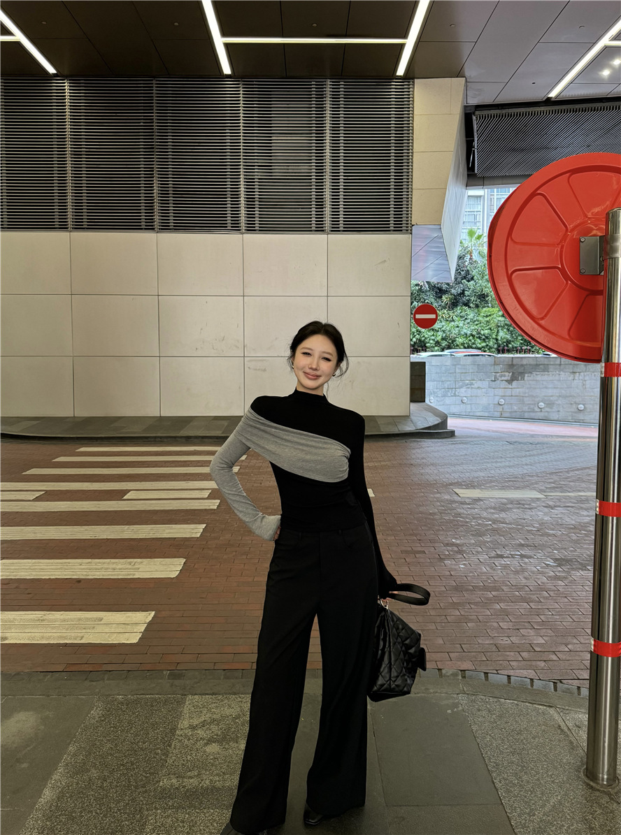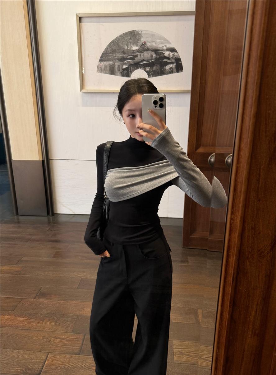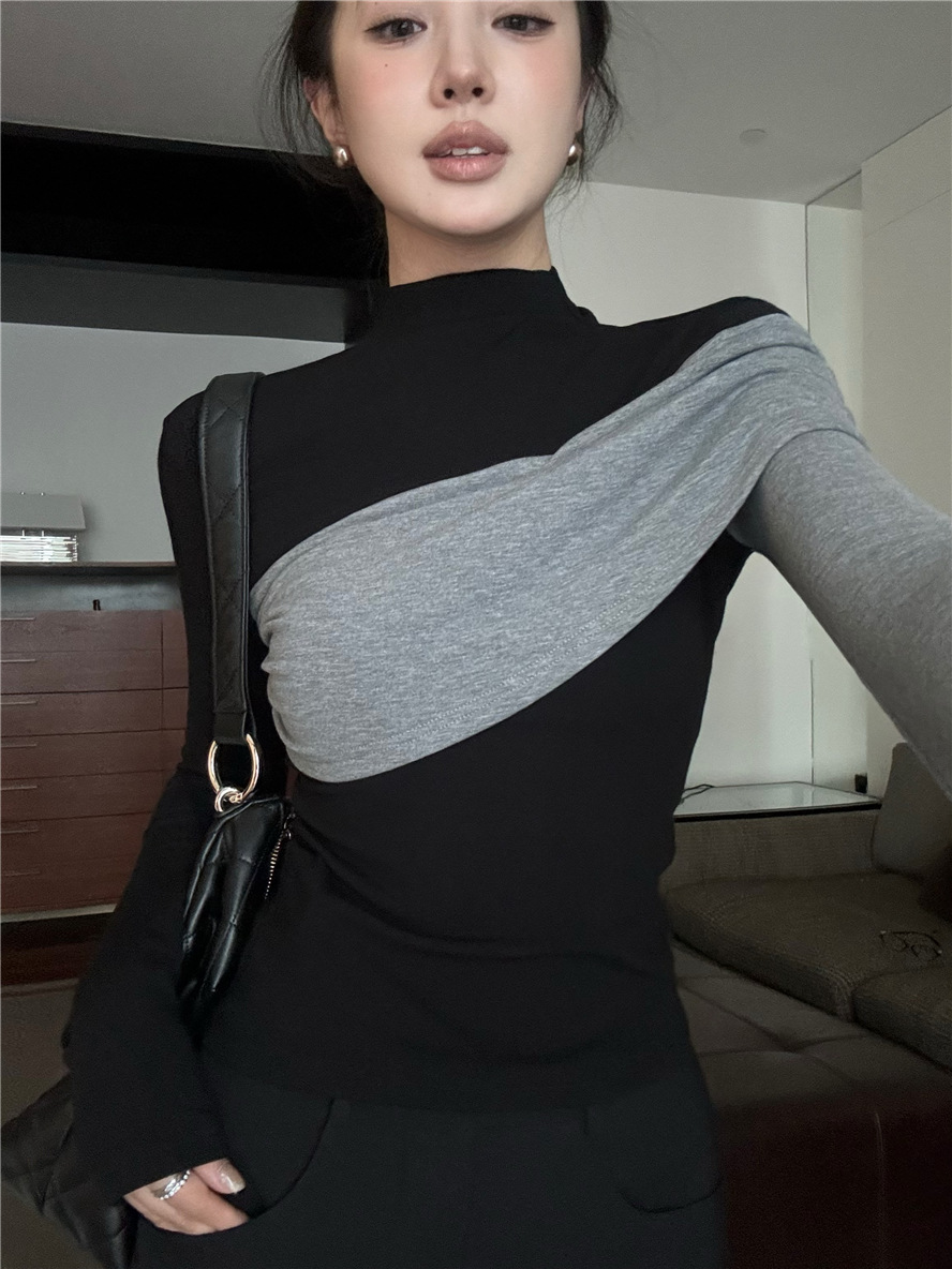 한국 스타일 디자인 센스 콘트라스트 컬러 세미 하이 칼라 긴팔 티셔츠 여성 가을 겨울 세련된 우아한 스티칭 슬림 핏 이너 탑