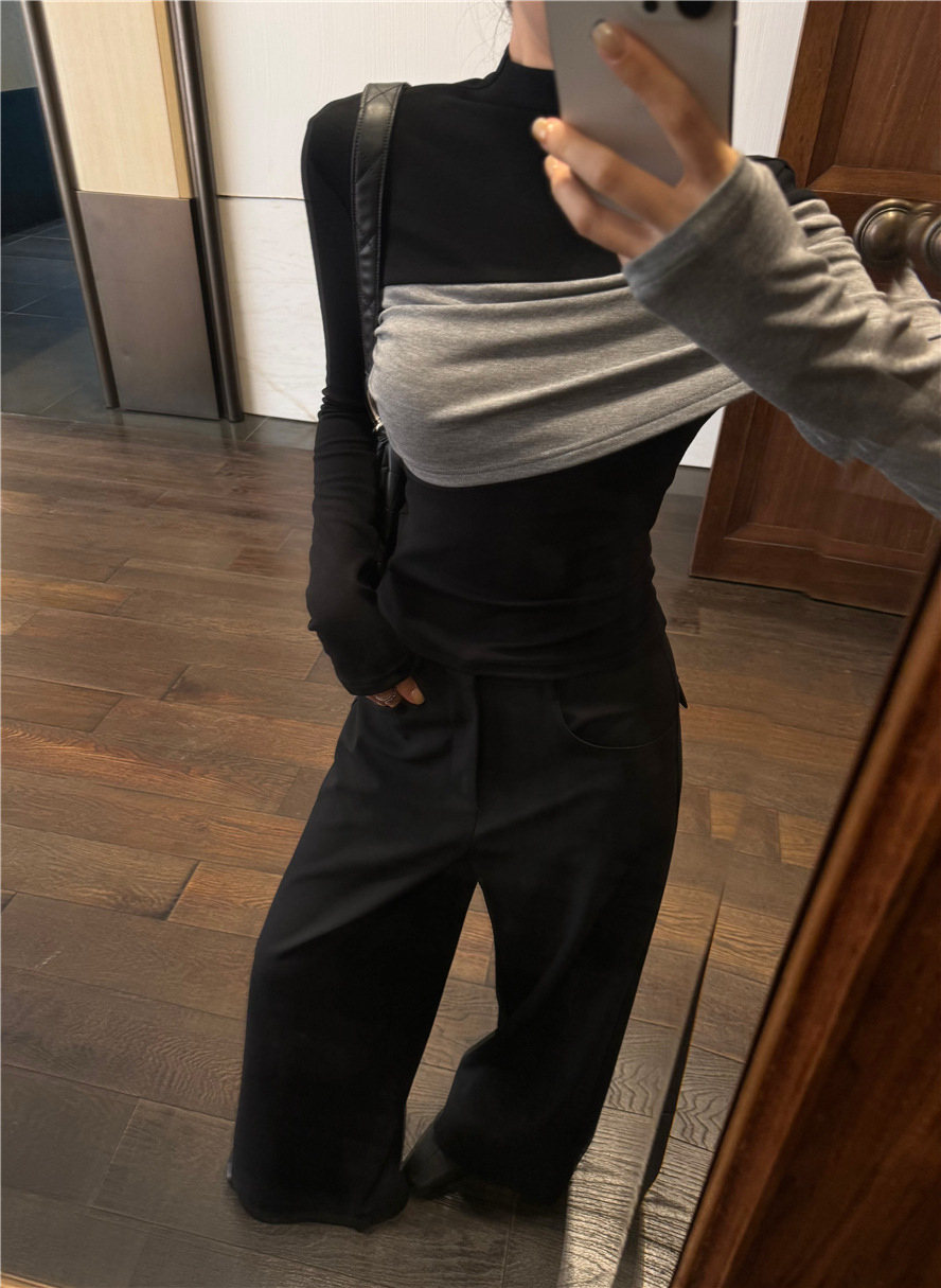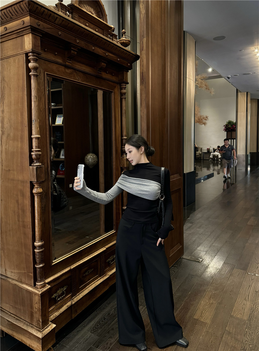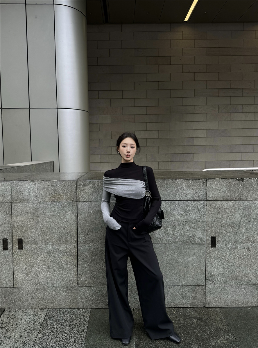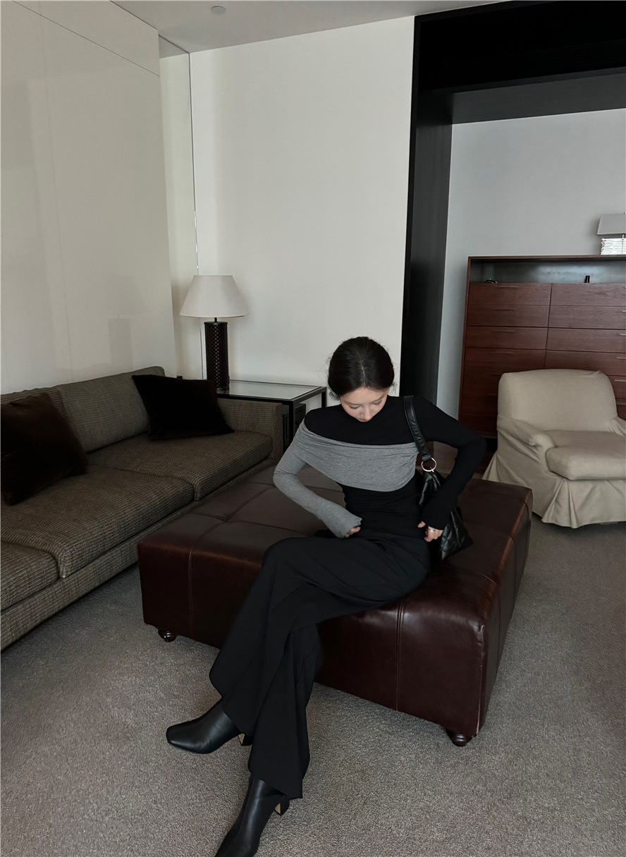 한국 스타일 디자인 센스 콘트라스트 컬러 세미 하이 칼라 긴팔 티셔츠 여성 가을 겨울 세련된 우아한 스티칭 슬림 핏 이너 탑