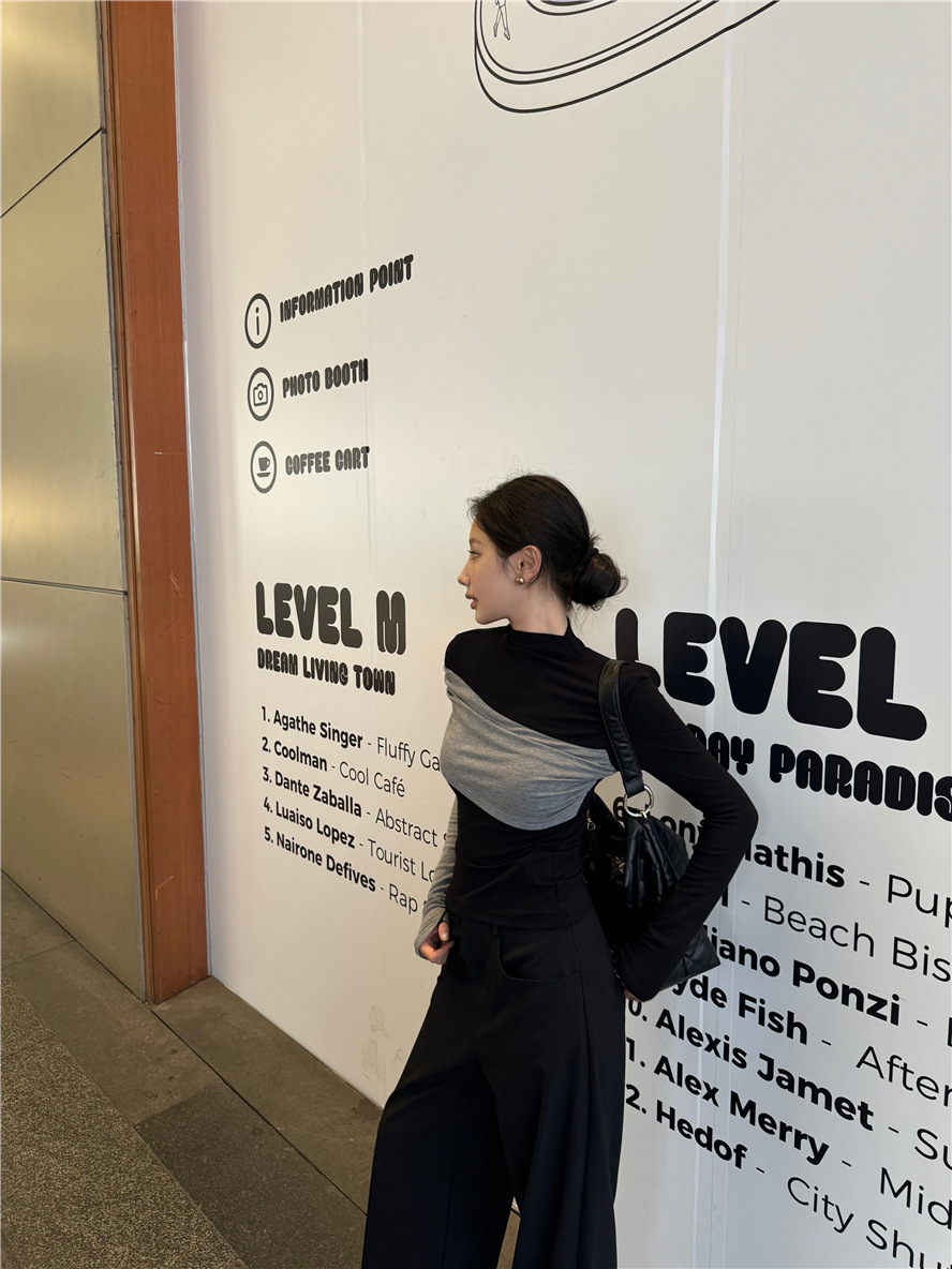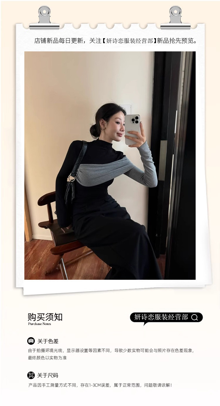 한국 스타일 디자인 센스 콘트라스트 컬러 세미 하이 칼라 긴팔 티셔츠 여성 가을 겨울 세련된 우아한 스티칭 슬림 핏 이너 탑스토어 가기