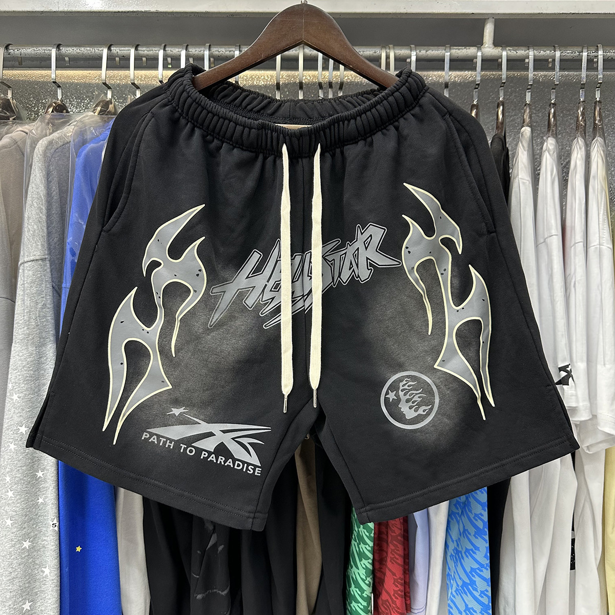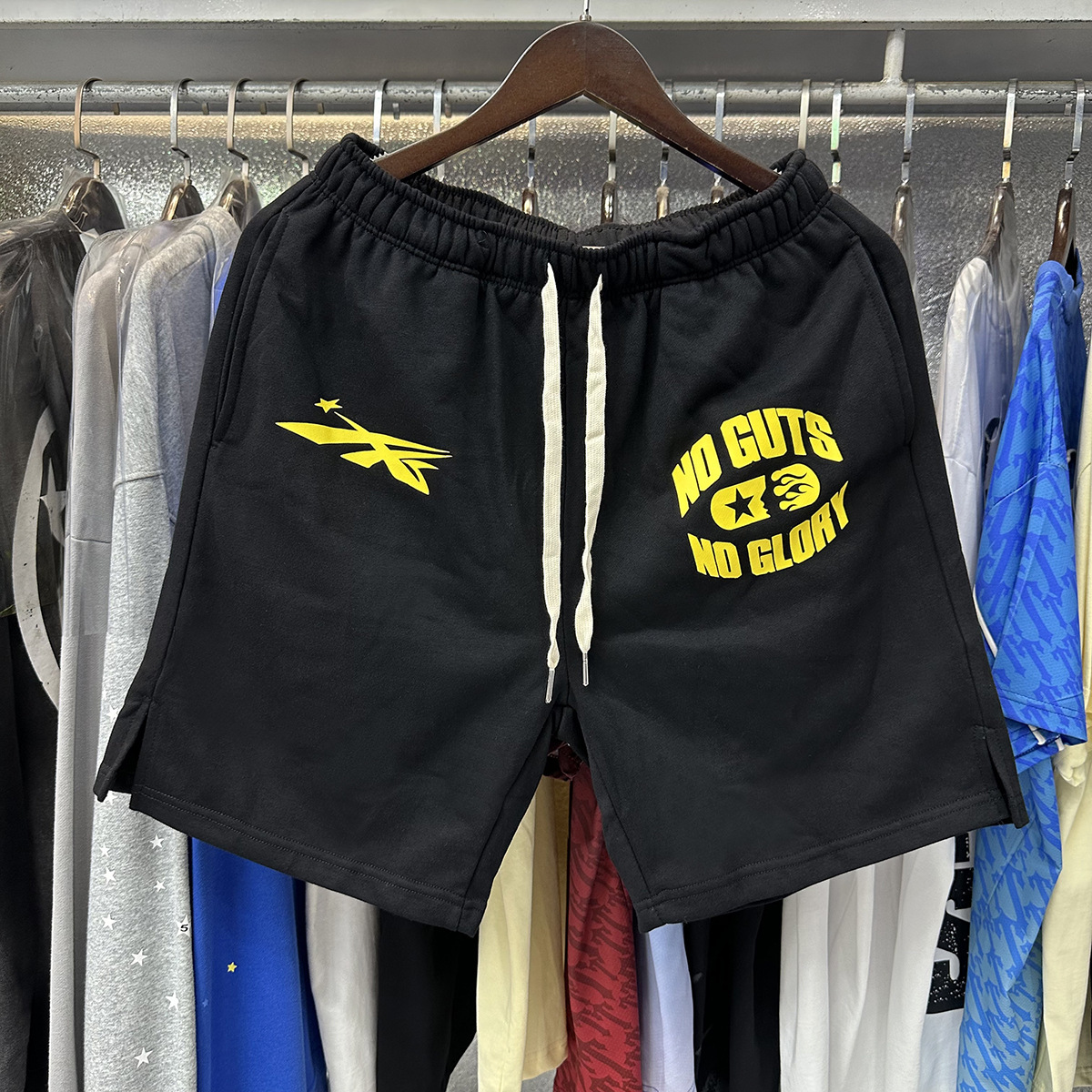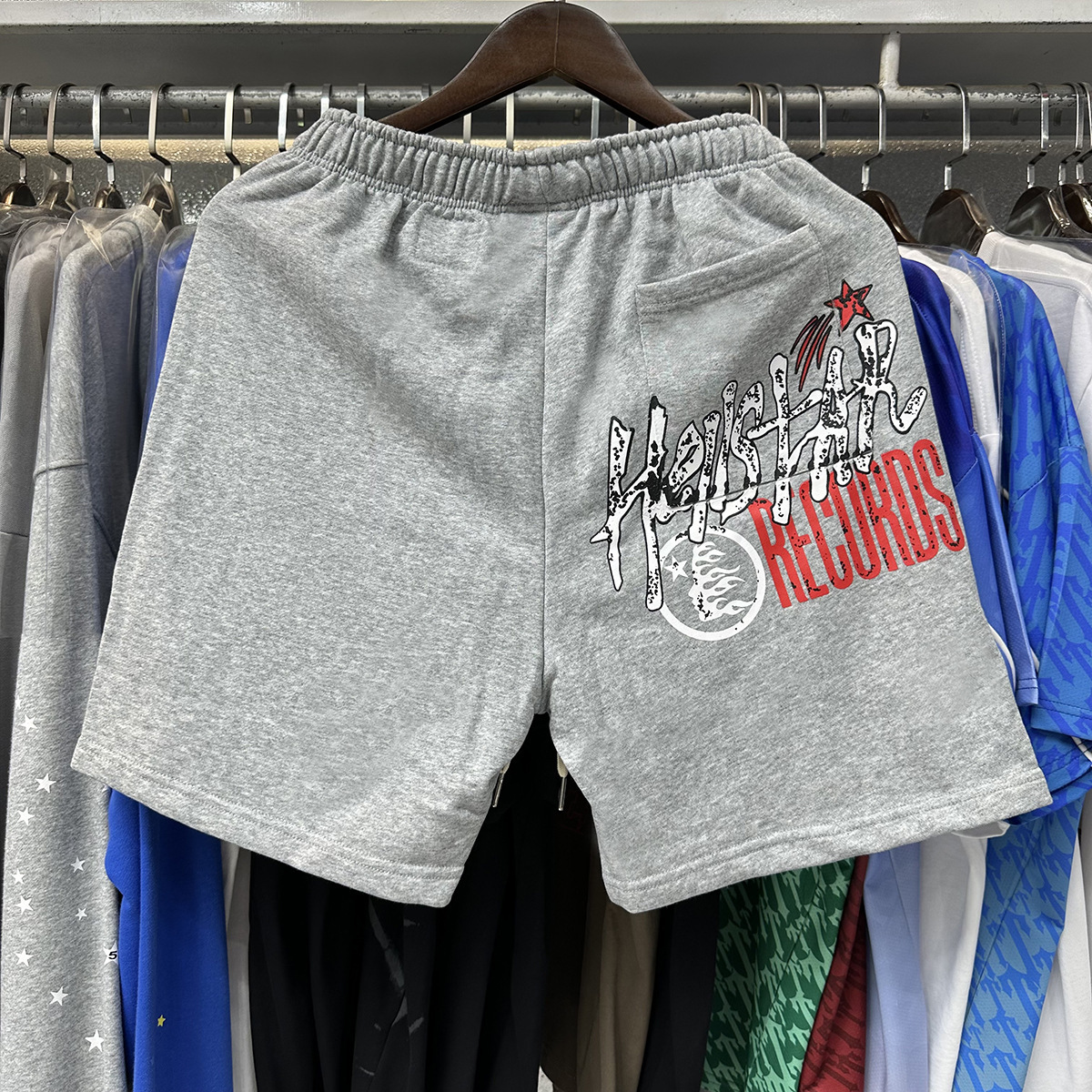 미국 스타일 패션 브랜드 스타 레코드 재미 웃는 인쇄 트랩 캐주얼 루즈 반바지 남성용 세탁 재킷스토어 가기