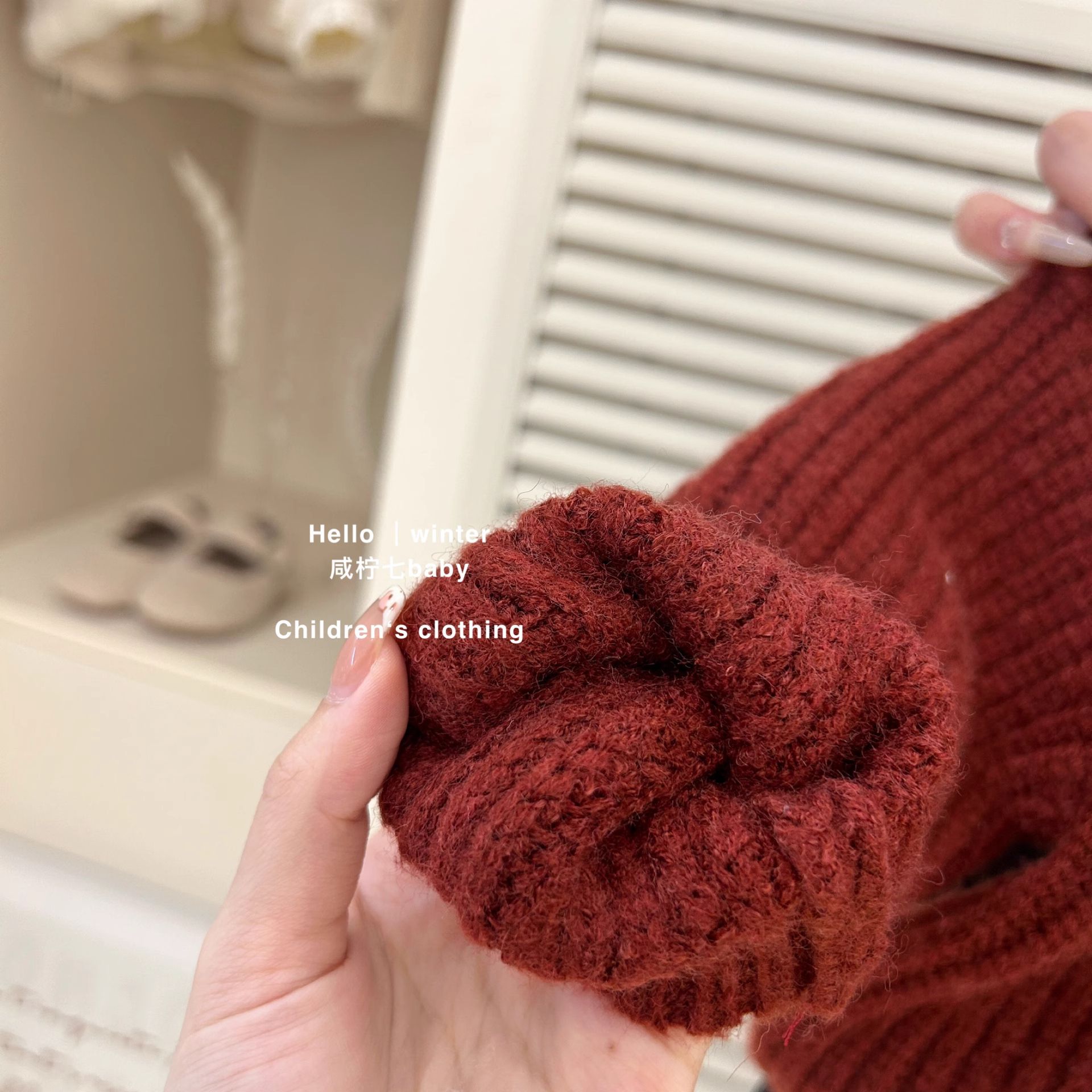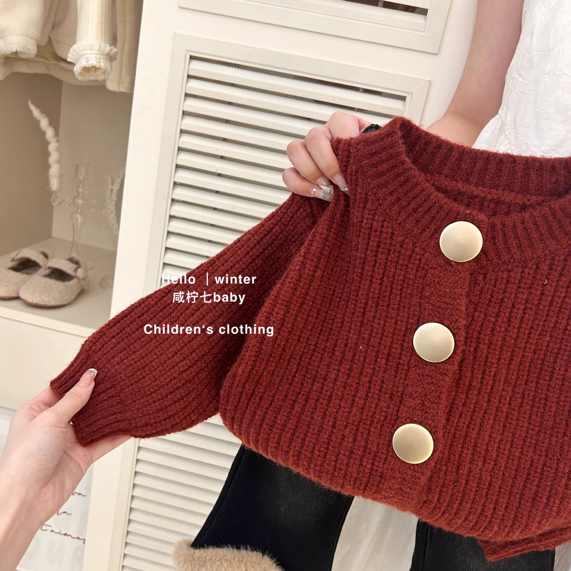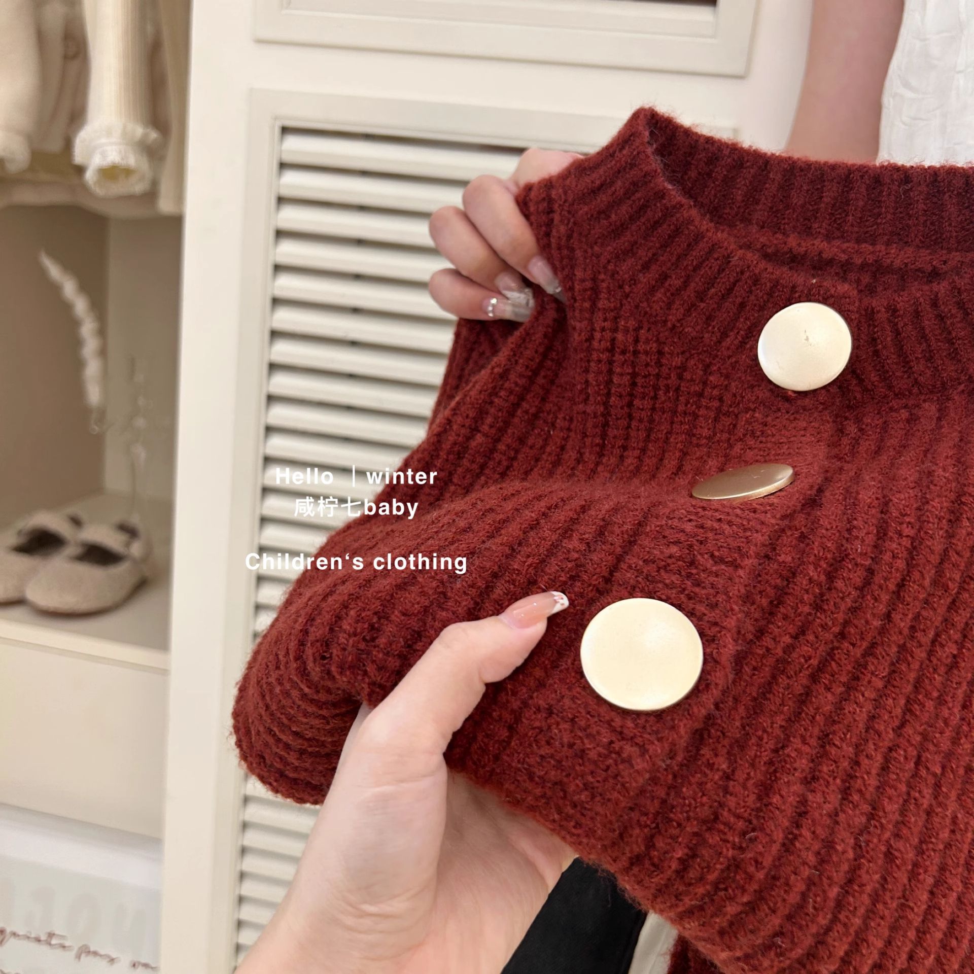 여자 니트 카디건 2024 새로운 어린이 서양식 스웨터 코트 여성의 가을과 겨울 레드 탑 세트스토어 가기