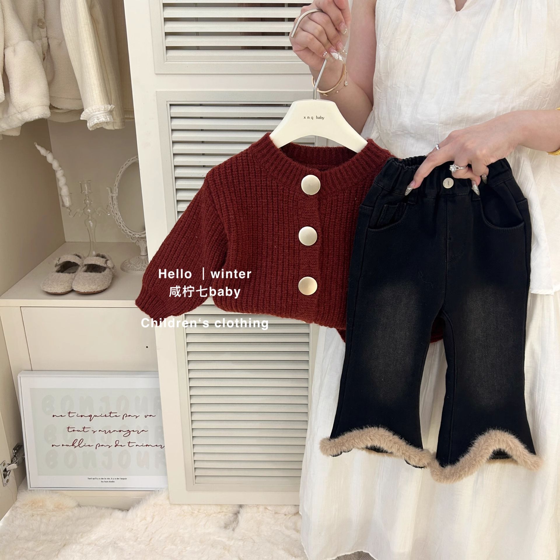 여자 니트 카디건 2024 새로운 어린이 서양식 스웨터 코트 여성의 가을과 겨울 레드 탑 세트