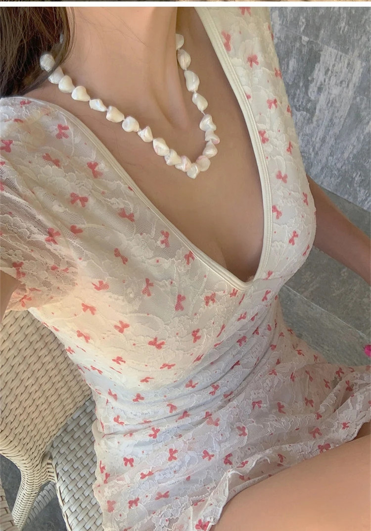 한국 뉴 플로랄 프렌치 V 넥 원피스 스커트 수영복 여성 하이 엔드 육식 슬리밍 수영복 여신 스타일
