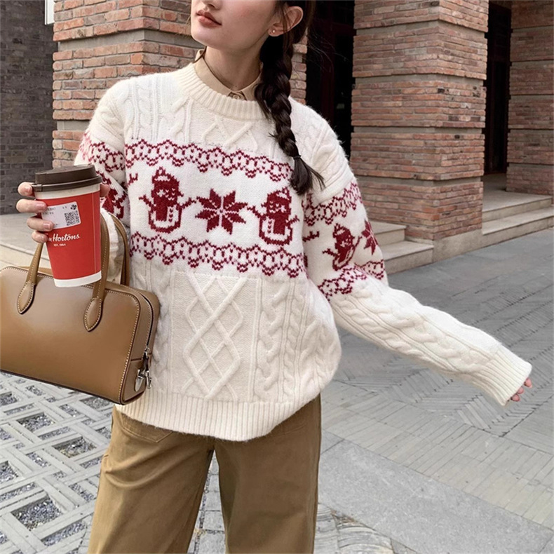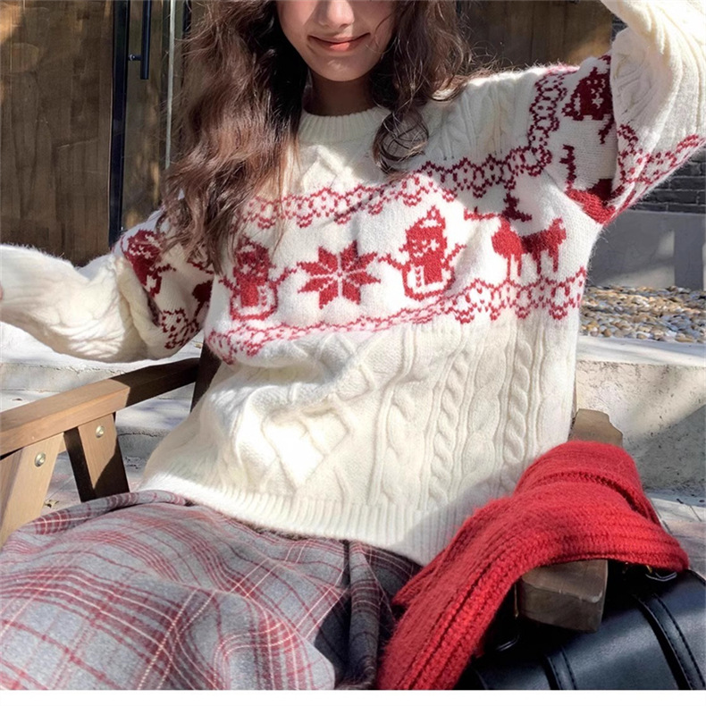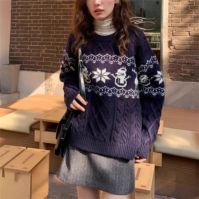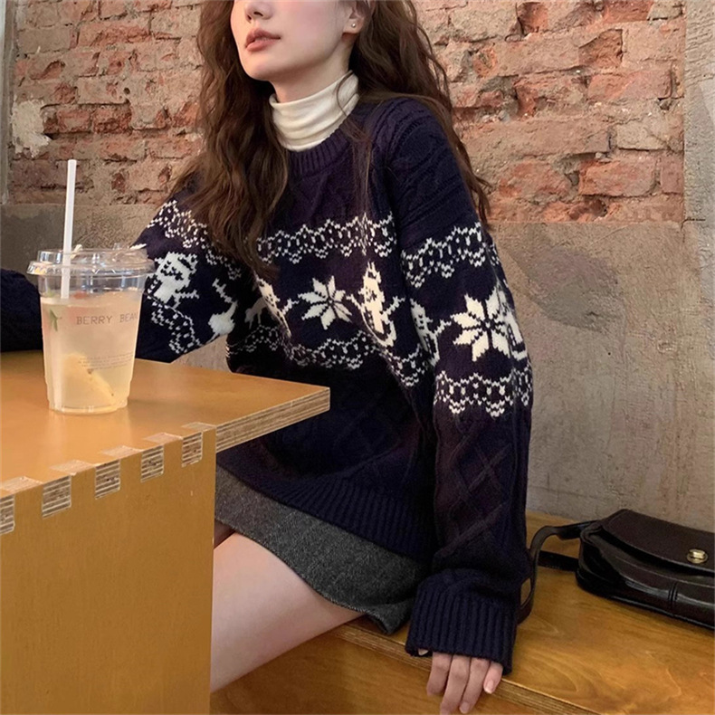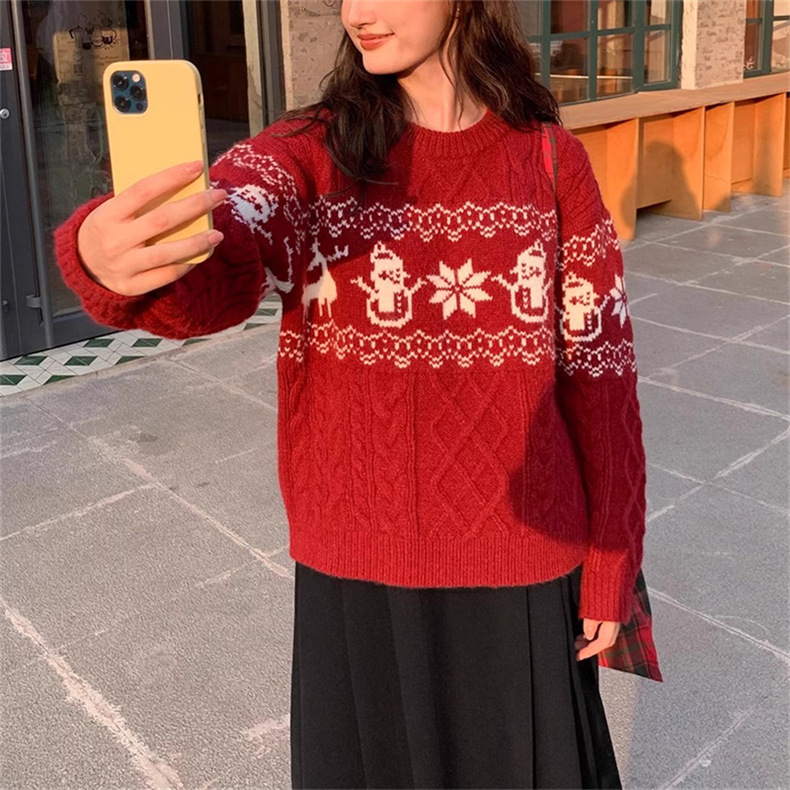 한국식 복고풍 크리스마스 분위기 자카드 스웨터 여성의 가을과 겨울 느슨한 따뜻한 크루 넥 풀오버 스웨터 탑스토어 가기