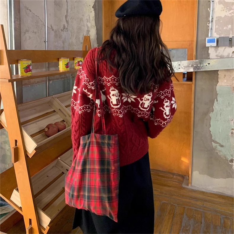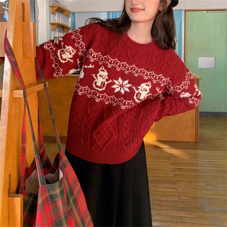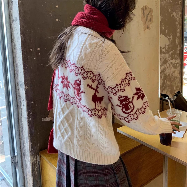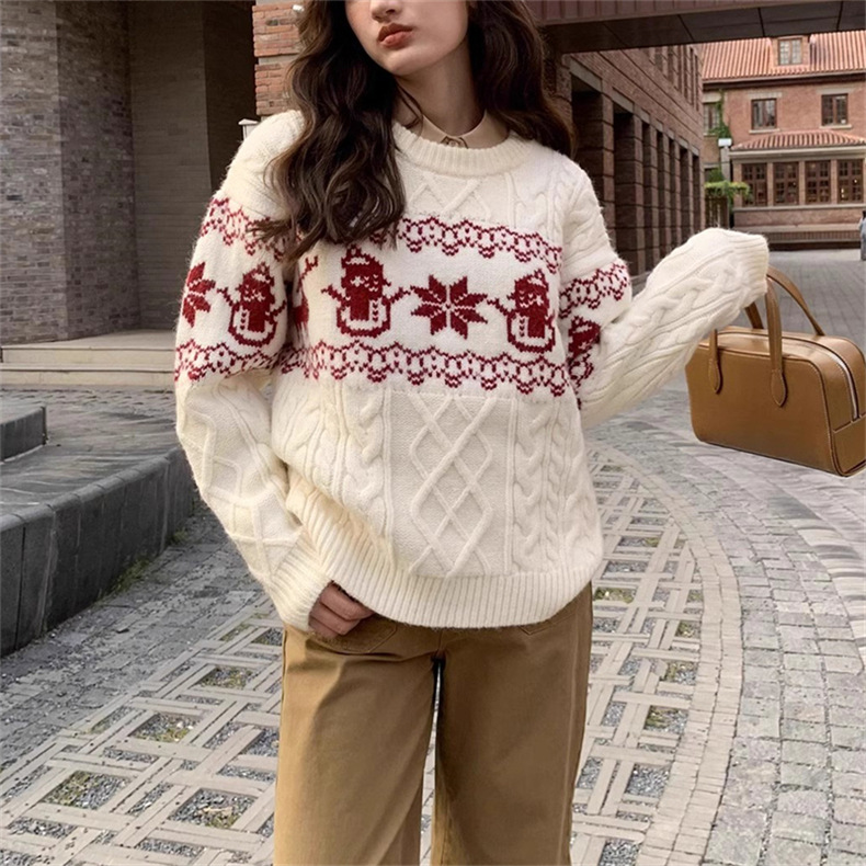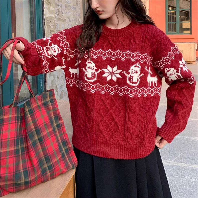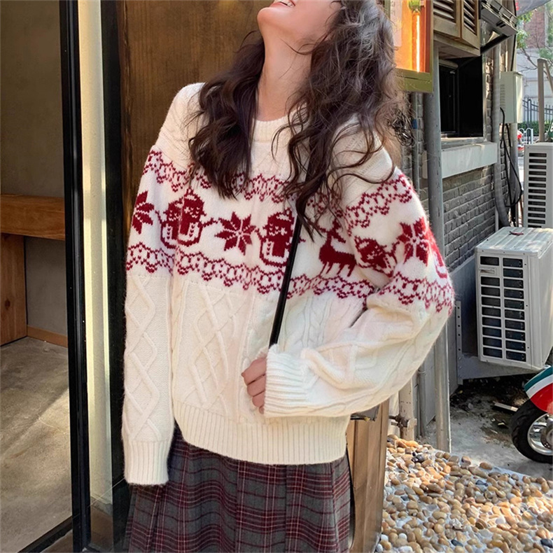 한국식 복고풍 크리스마스 분위기 자카드 스웨터 여성의 가을과 겨울 느슨한 따뜻한 크루 넥 풀오버 스웨터 탑스토어 가기