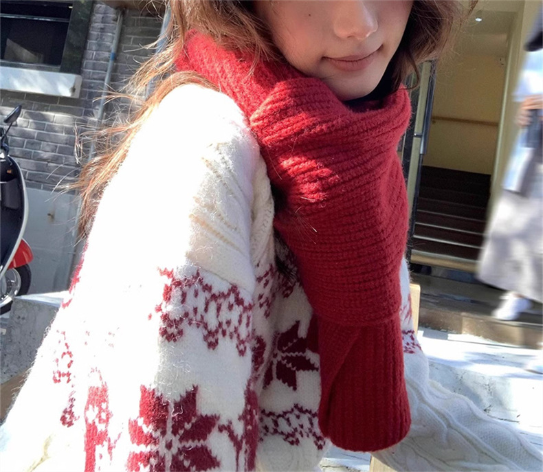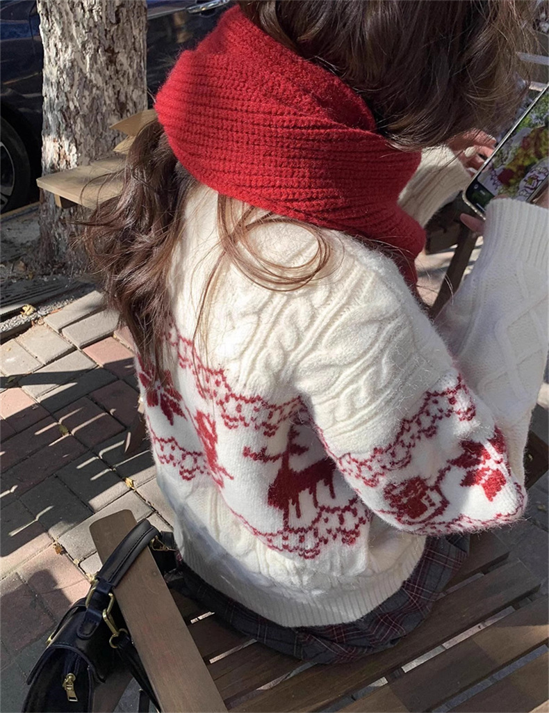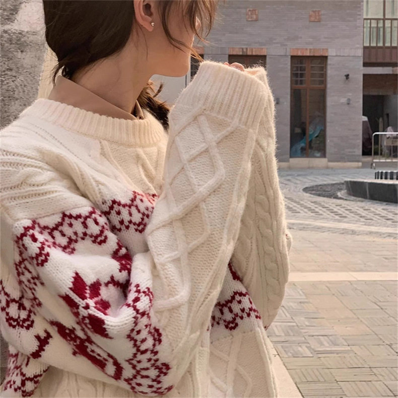 한국식 복고풍 크리스마스 분위기 자카드 스웨터 여성의 가을과 겨울 느슨한 따뜻한 크루 넥 풀오버 스웨터 탑
