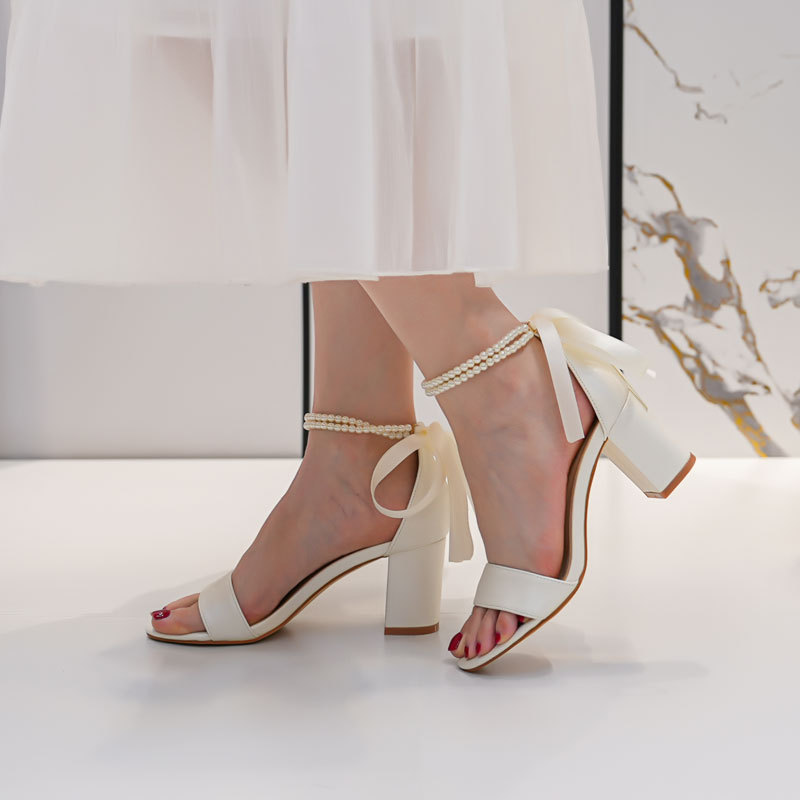 플러스 사이즈 하이힐 샌들 여성 오픈 발가락 섹시 화이트 리본 활 구슬 진주 여성 신발 클래식 패션 웨딩 슈즈