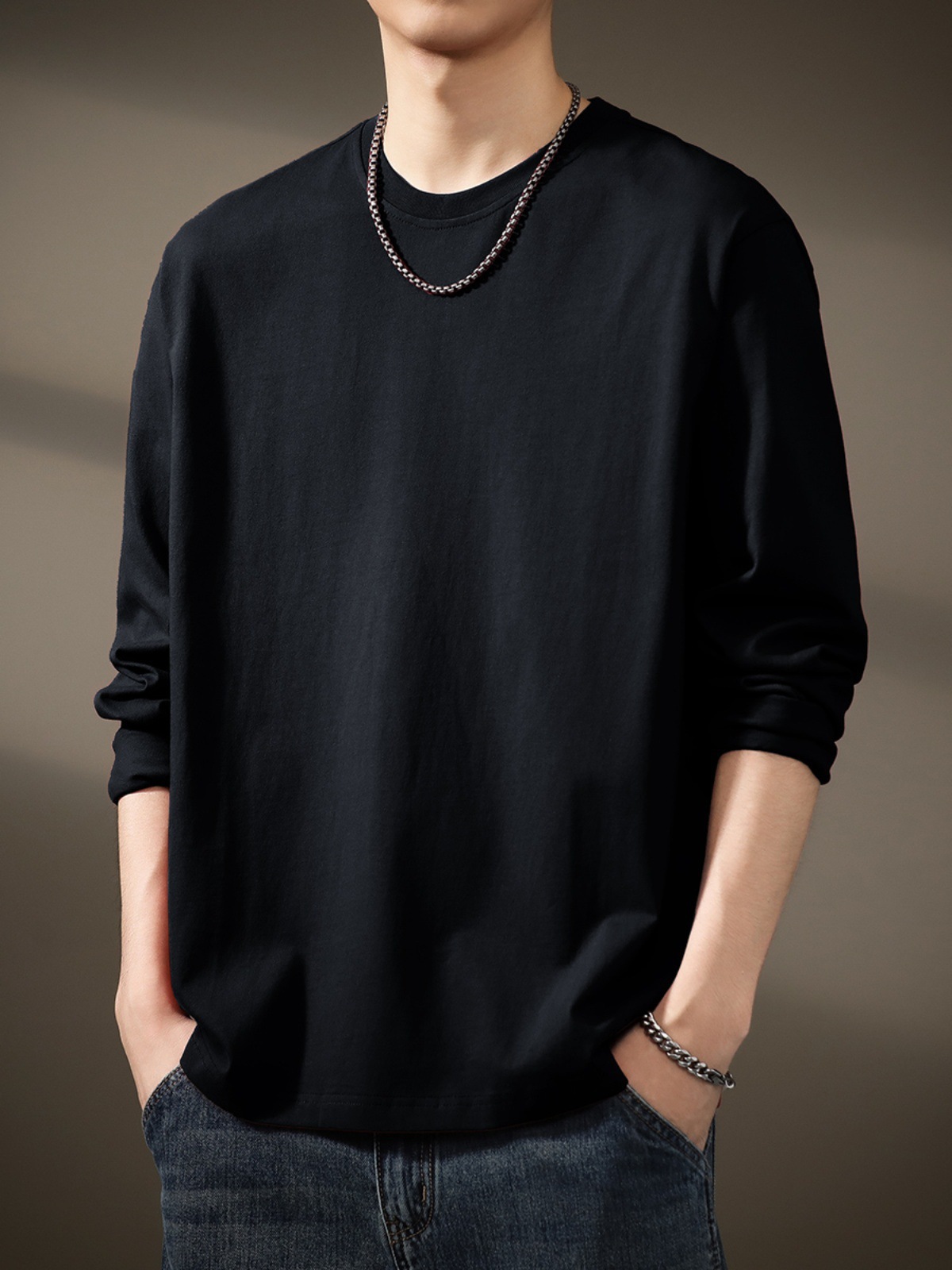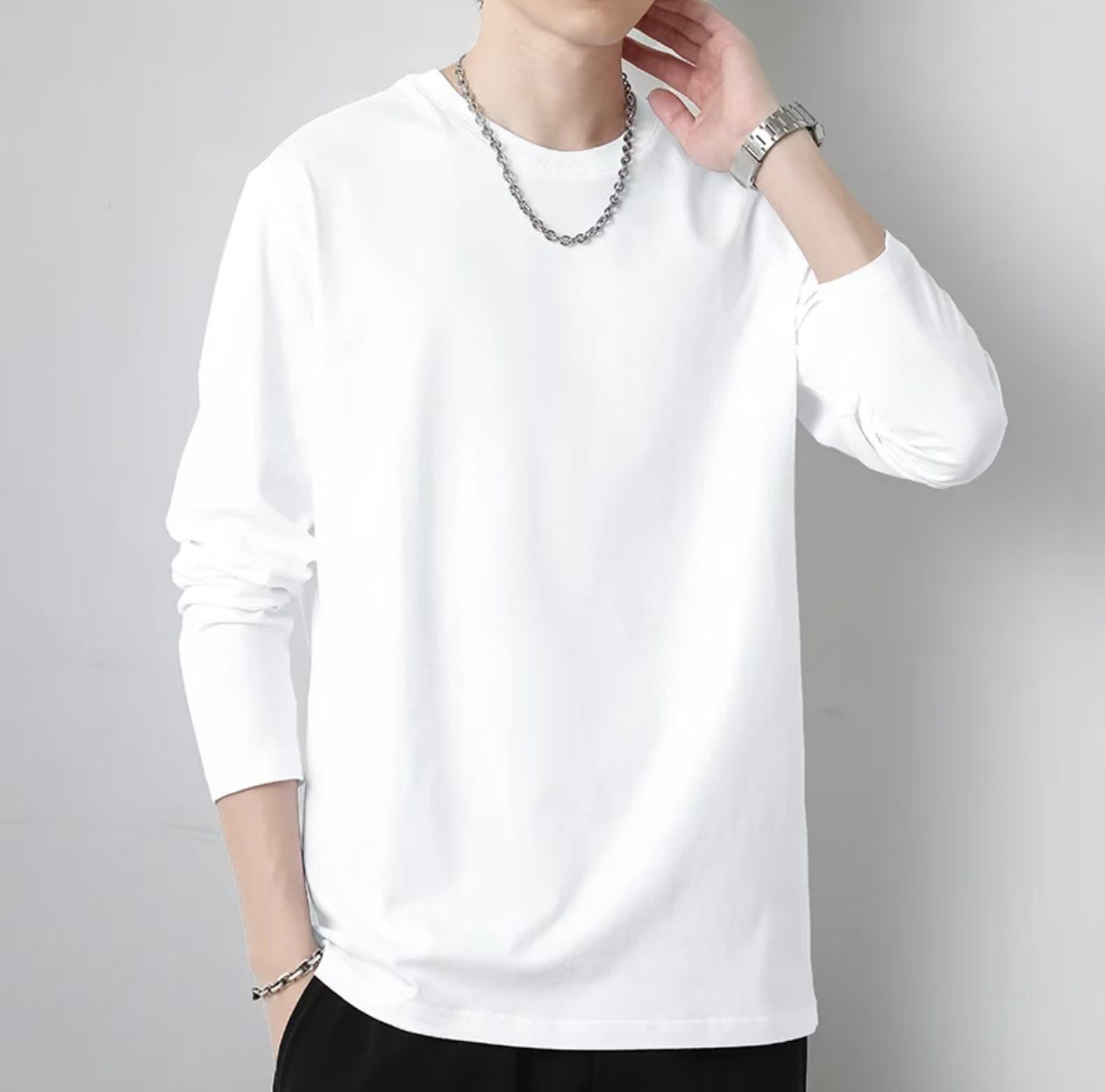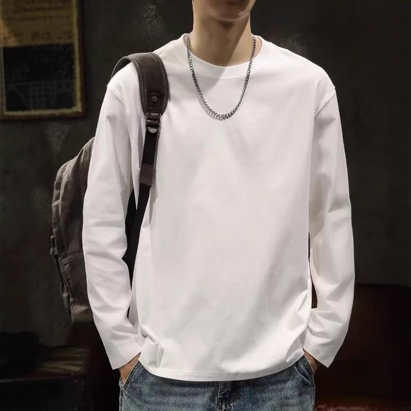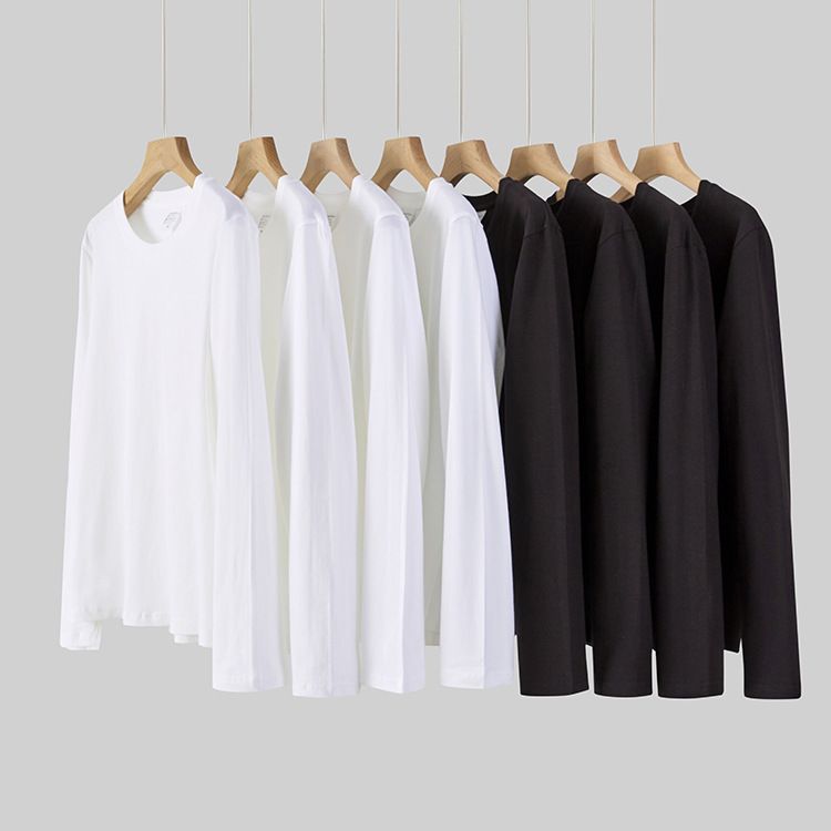 무거운 300g 면 흑백 긴 소매 티셔츠 남성베이스 셔츠 봄과 가을 내부 코트 둥근 목 느슨한 조커
