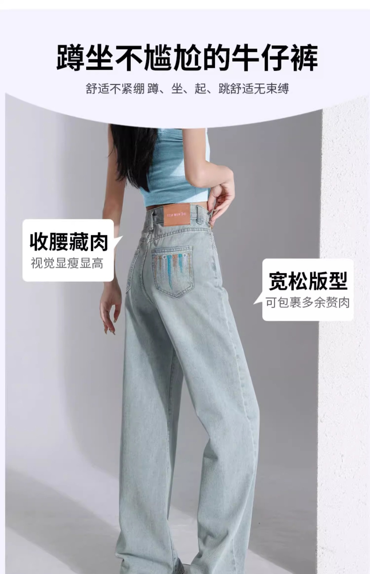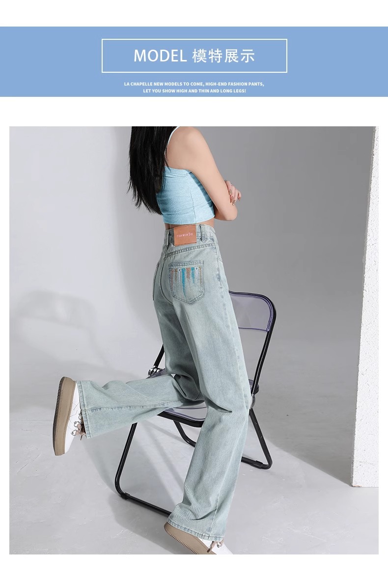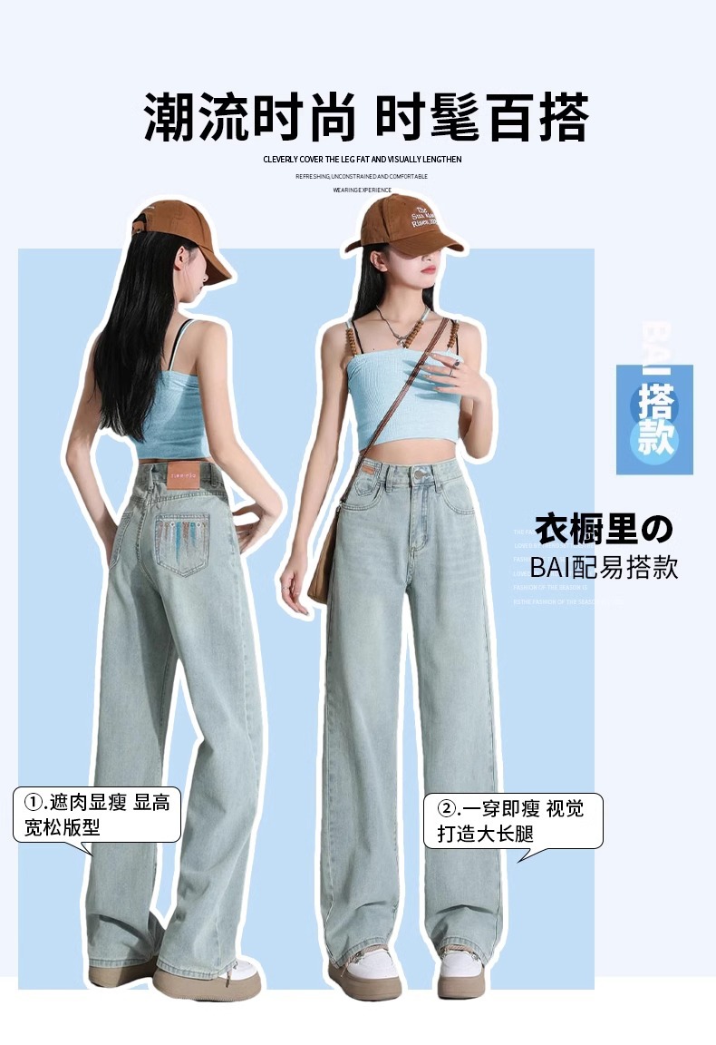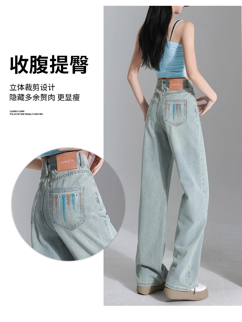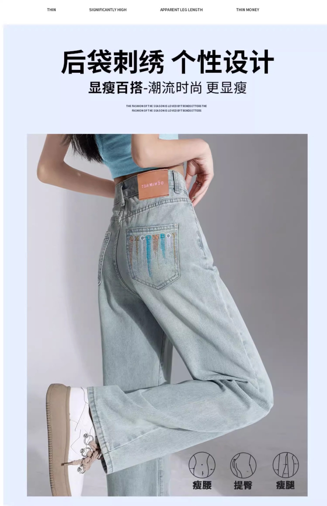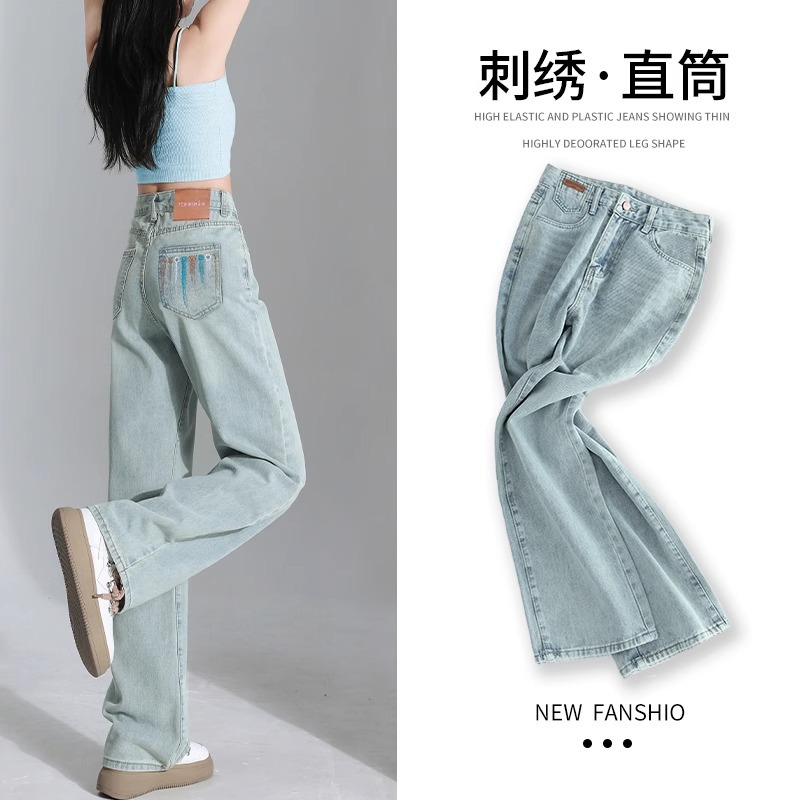 여성용 자수 스트레이트 청바지, 2025 봄 가을 신상 하이웨이스트 드레이프 라이트 컬러 디자인, 슬림핏 와이드 팬츠스토어 가기