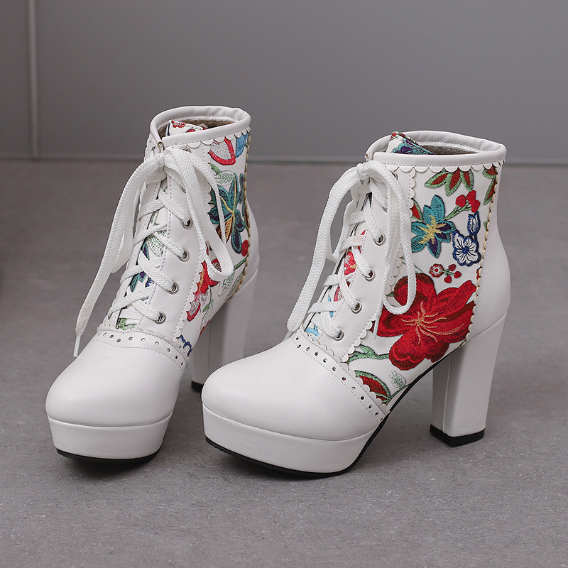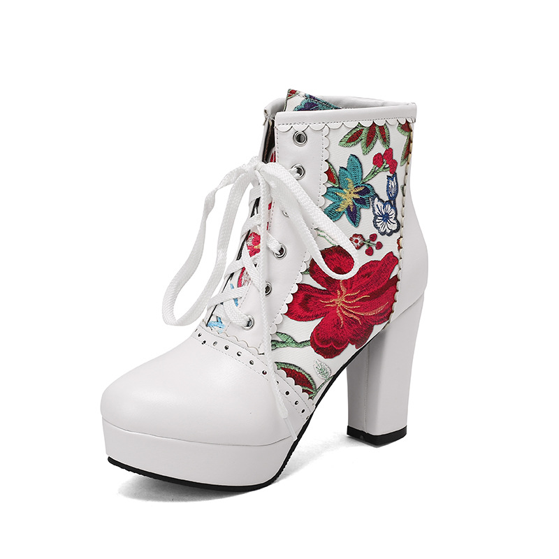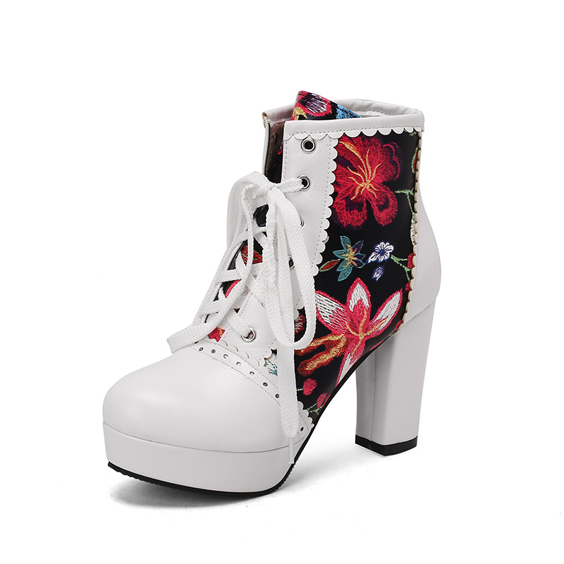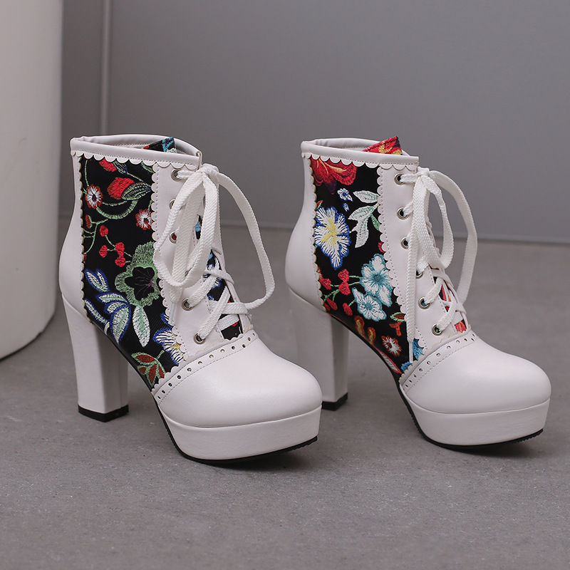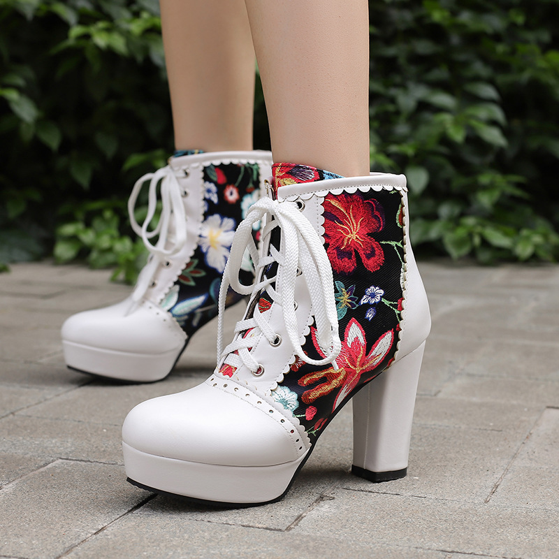 부츠 높은 굽 여성 신발 두꺼운 전면 레이스 업 마틴 부츠 짧은 배럴 컬러 블록 가죽 부츠 대외 무역 달콤한 인쇄 여성의 새로운 성인