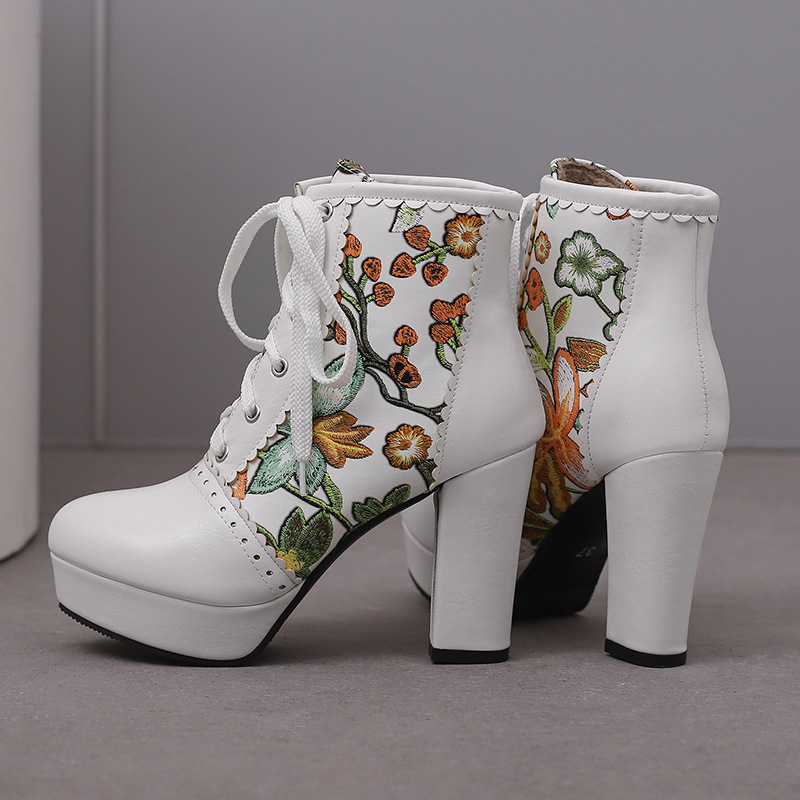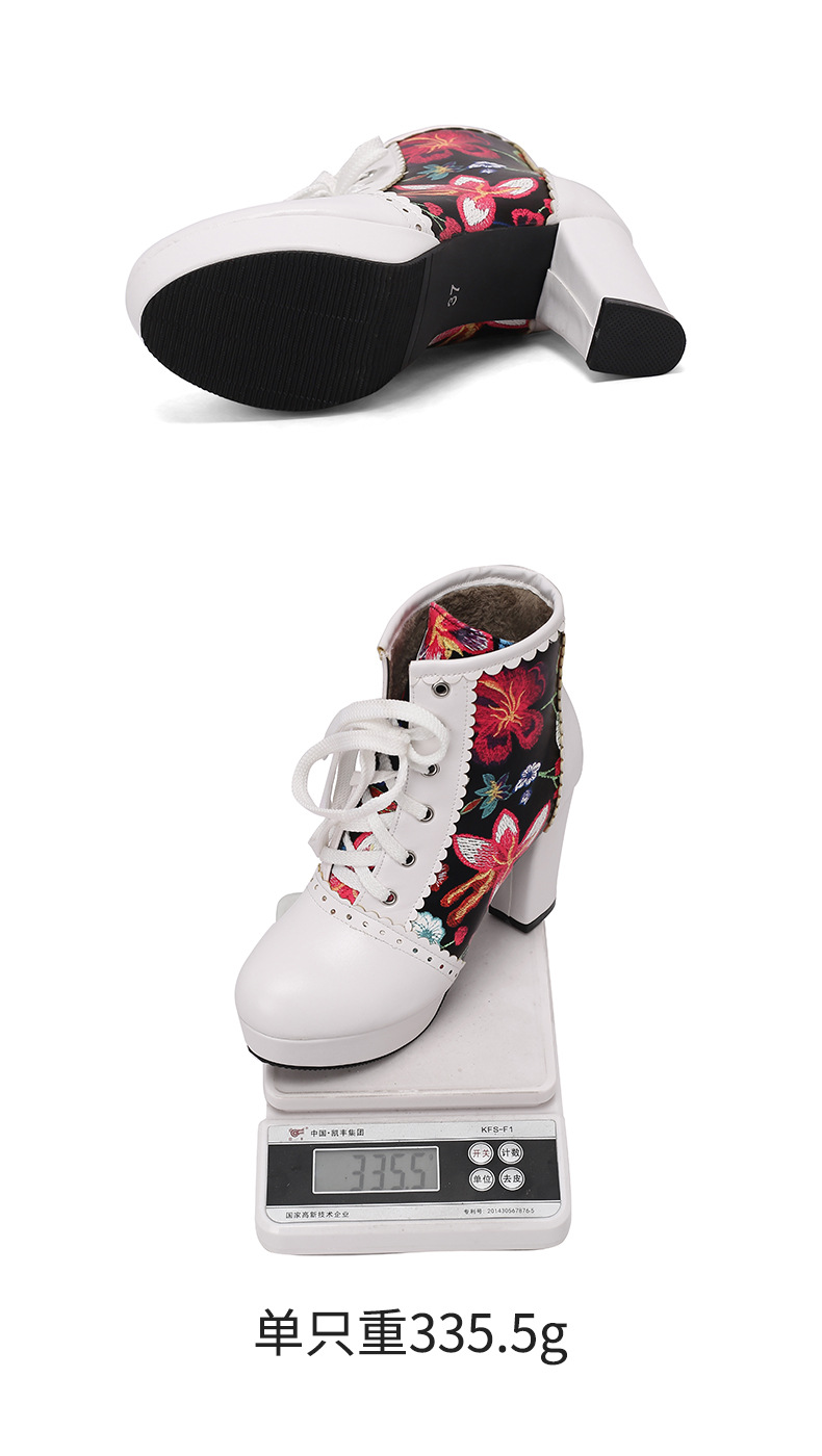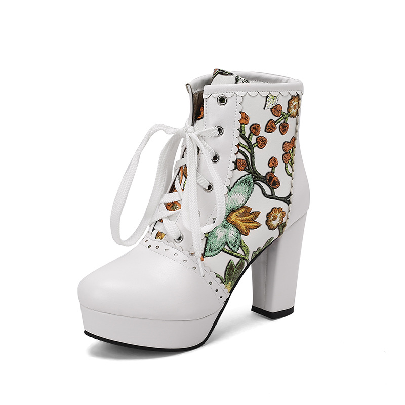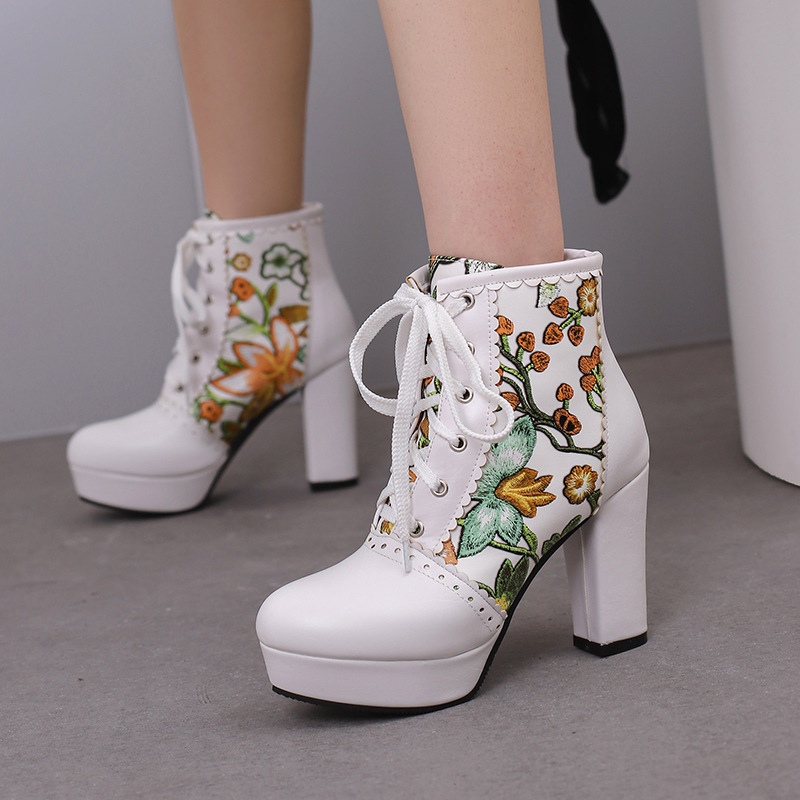 부츠 높은 굽 여성 신발 두꺼운 전면 레이스 업 마틴 부츠 짧은 배럴 컬러 블록 가죽 부츠 대외 무역 달콤한 인쇄 여성의 새로운 성인