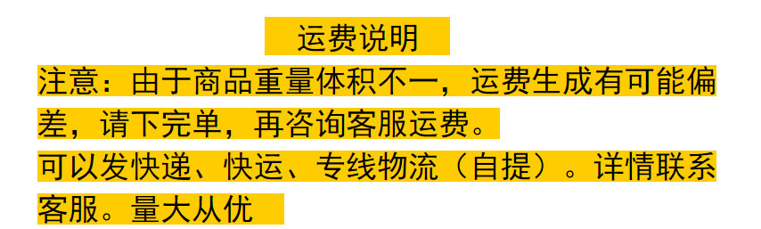 3、本厂产品价格均为出厂价,不含运费不含税。货款800-300建议发快运(有物流跟踪信息),货款3000元以上建议走物流专线,价格较为低廉,无派送跟踪记录需自提,详情咨询客服。