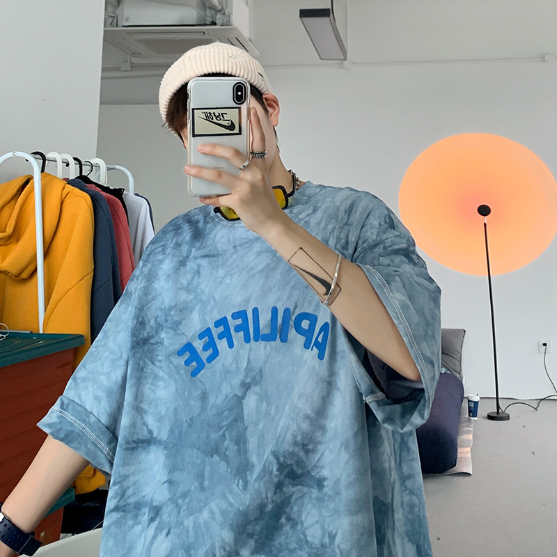 편지 타이-염료 반팔 티셔츠 남자의 여름 유행 브랜드 슈퍼 핫 느슨한 반소매 간단한 올매치 반소매 캐주얼 티셔츠스토어 가기