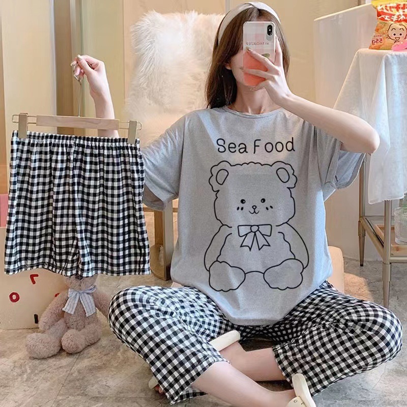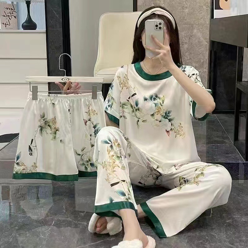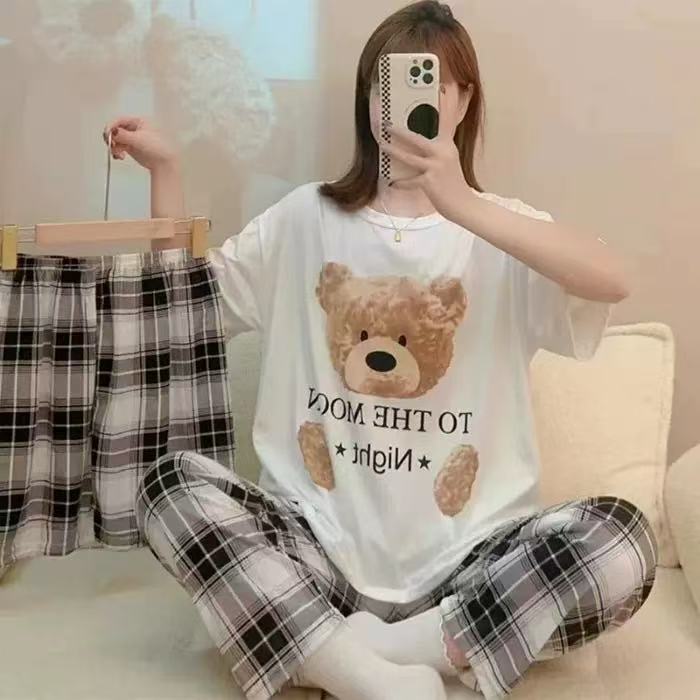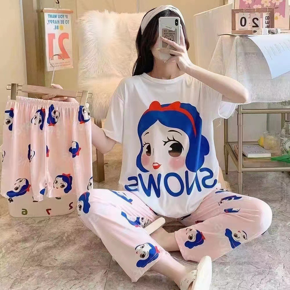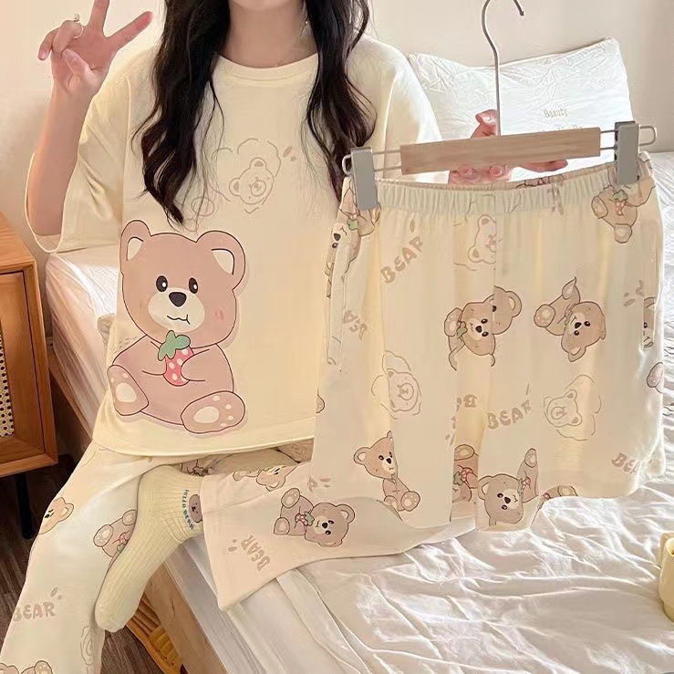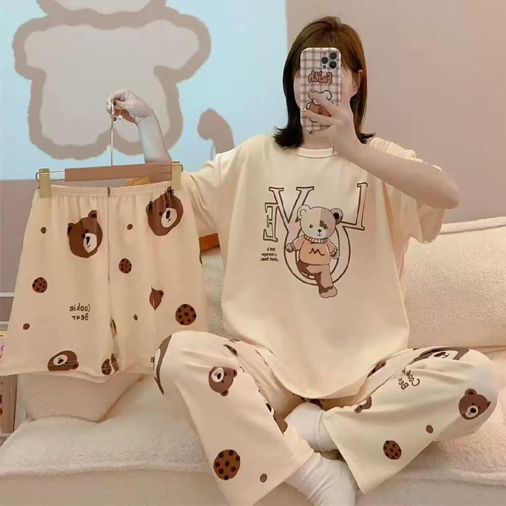 새로운 잠옷 여성 여름 얇은 반팔 바지 2025 달콤한 만화 3 피스 세트 홈 의류스토어 가기