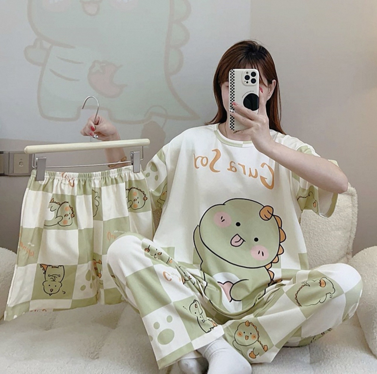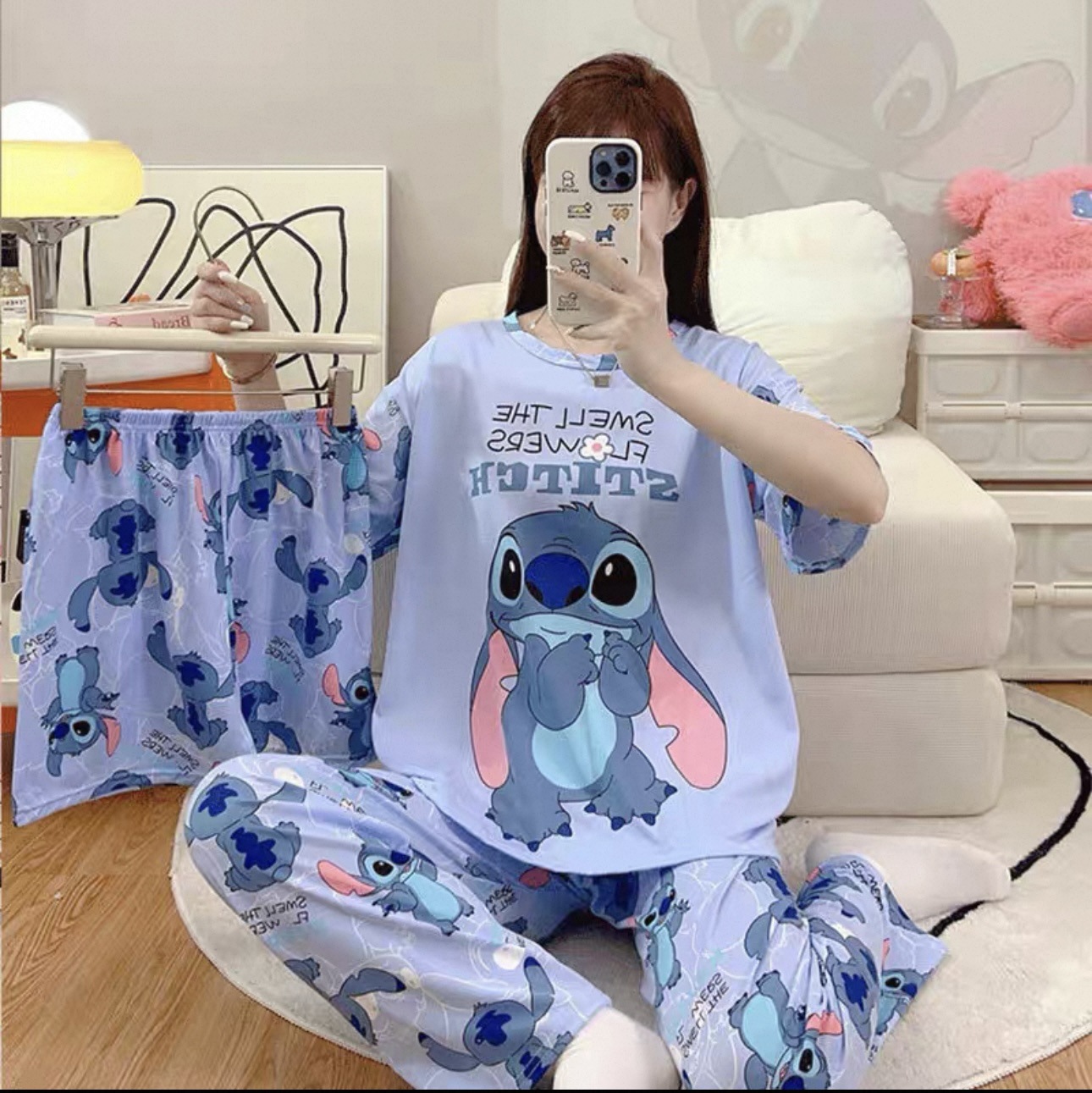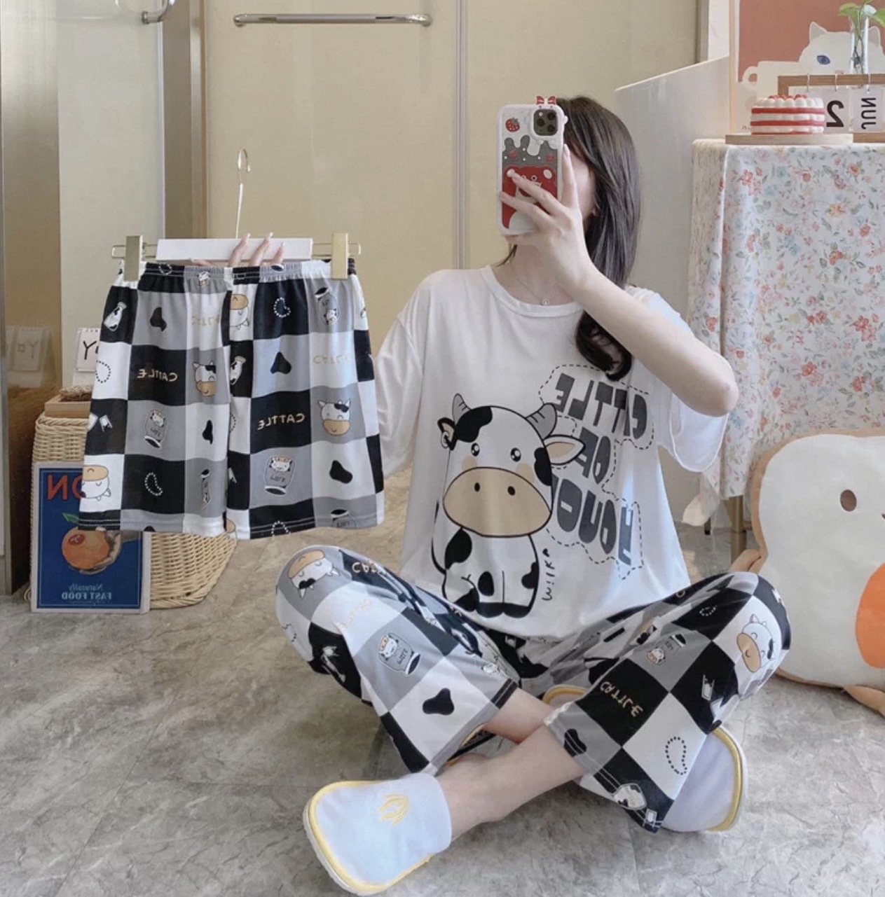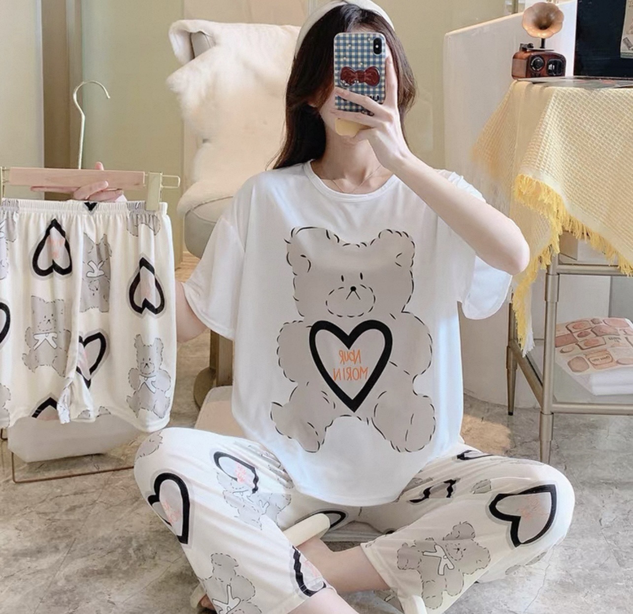 새로운 잠옷 여성 여름 얇은 반팔 바지 2025 달콤한 만화 3 피스 세트 홈 의류스토어 가기