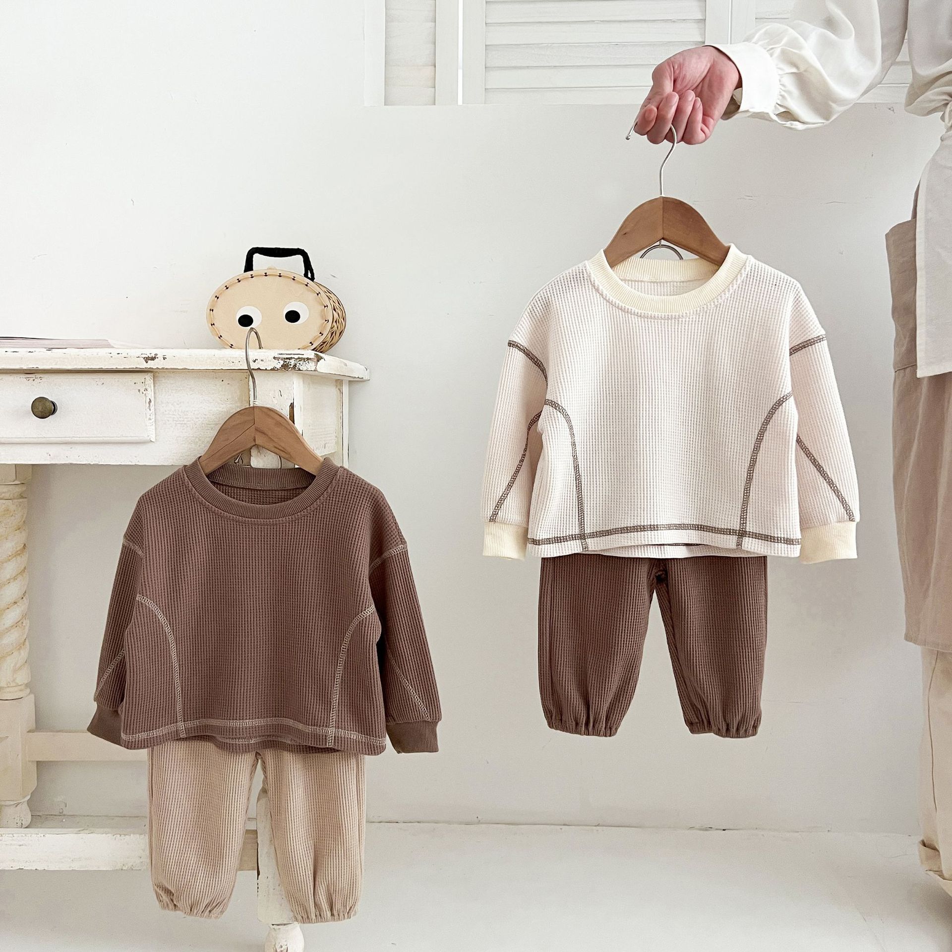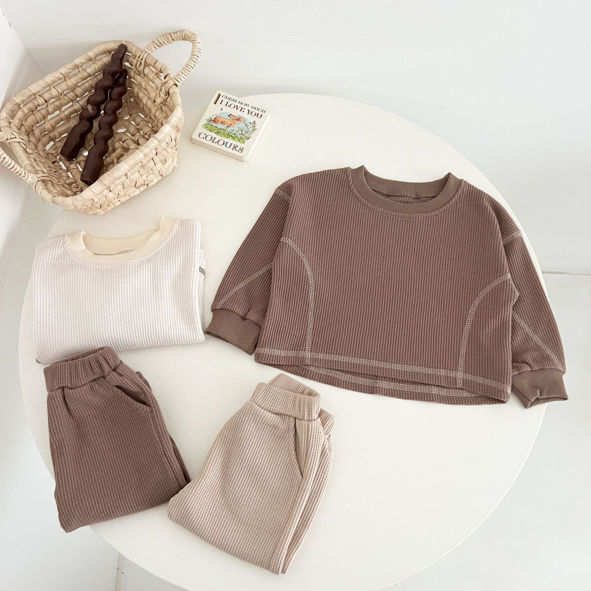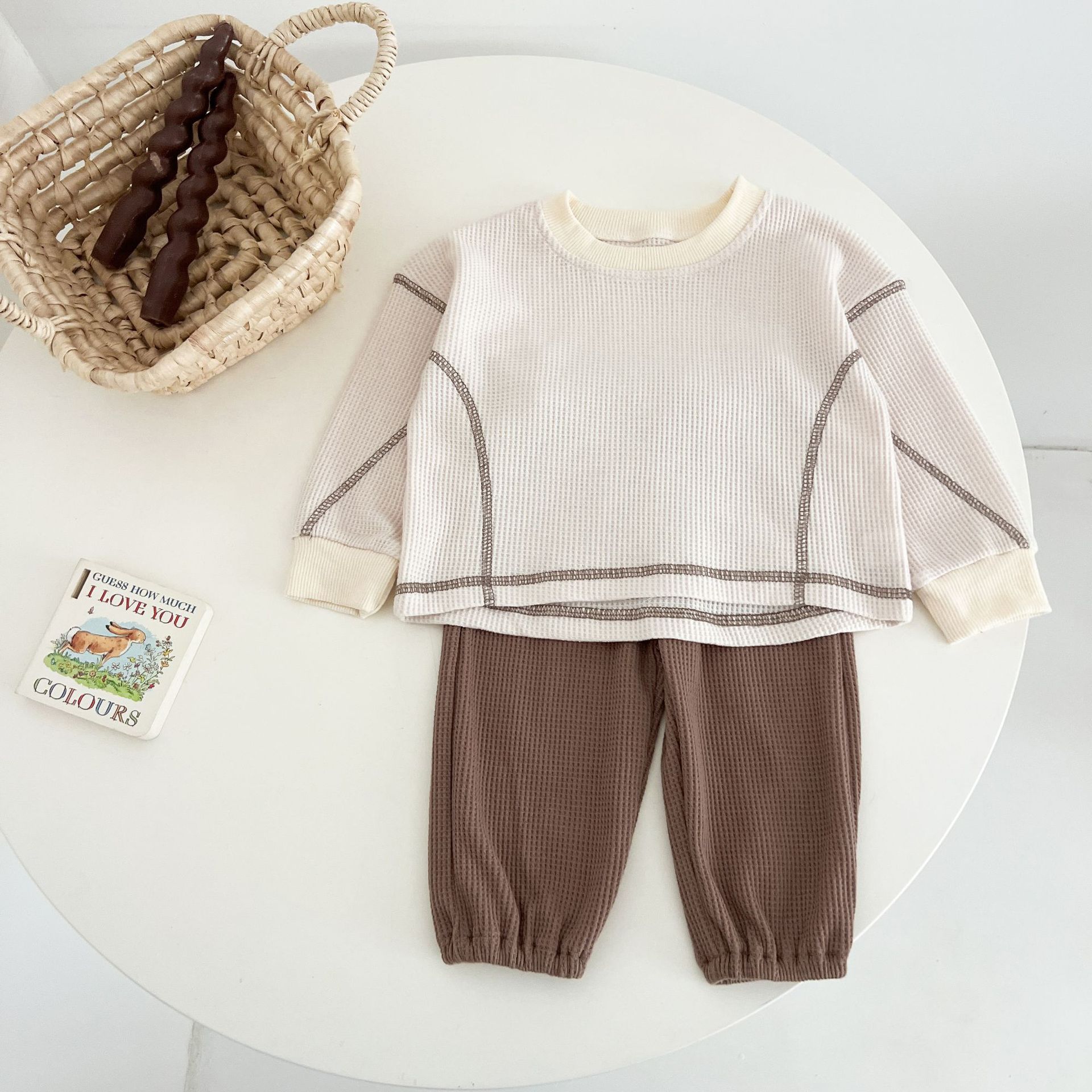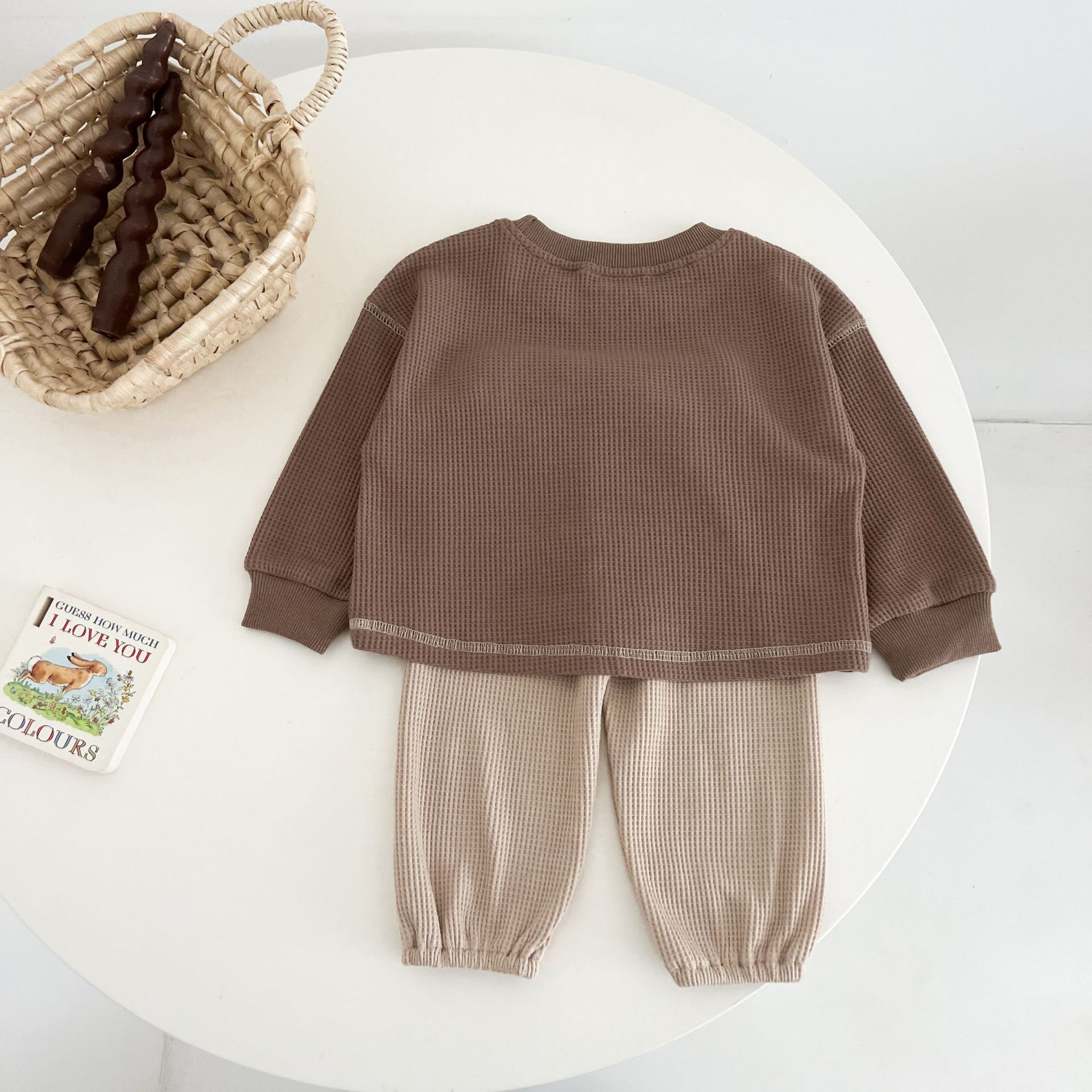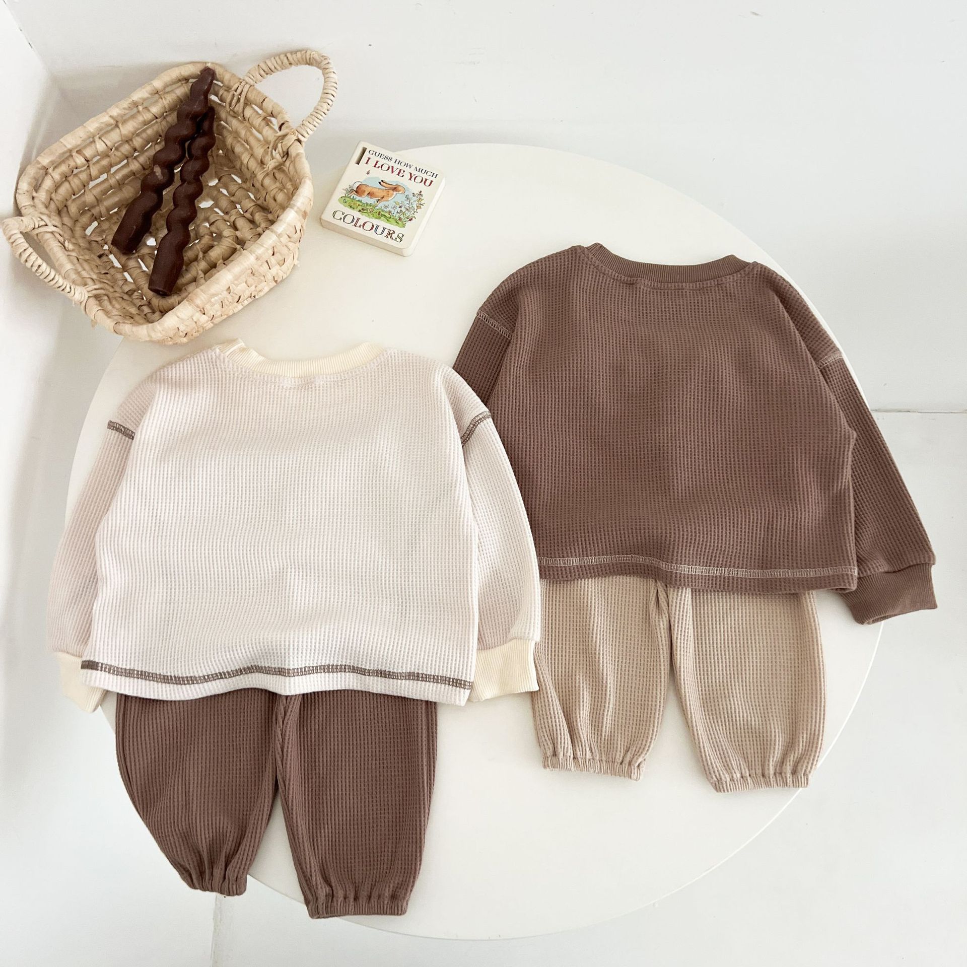 한국식 아동복 봄과 가을 아기 소년과 소녀 캐주얼 느슨한 와플 세트 긴 소매 티셔츠 바지 두 조각