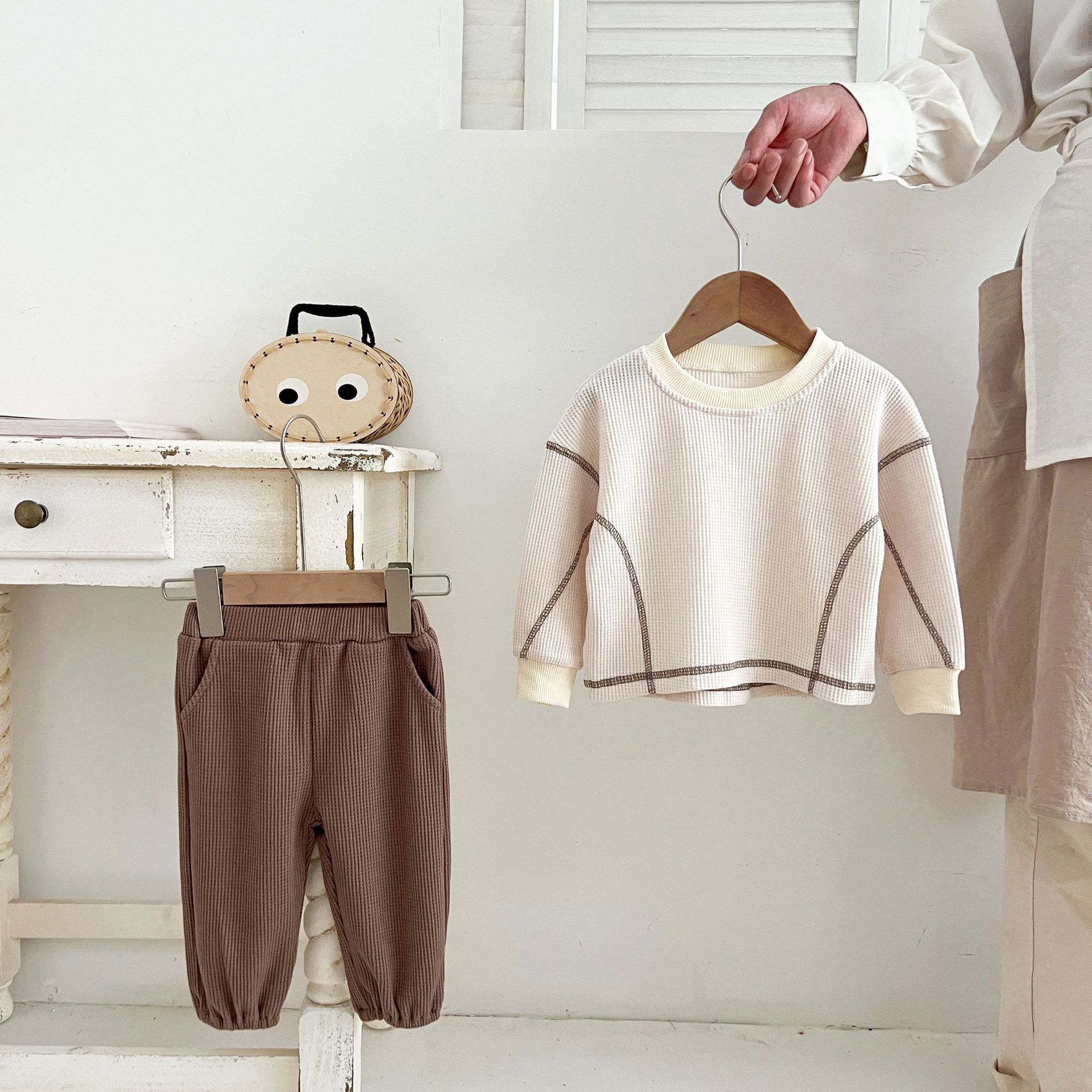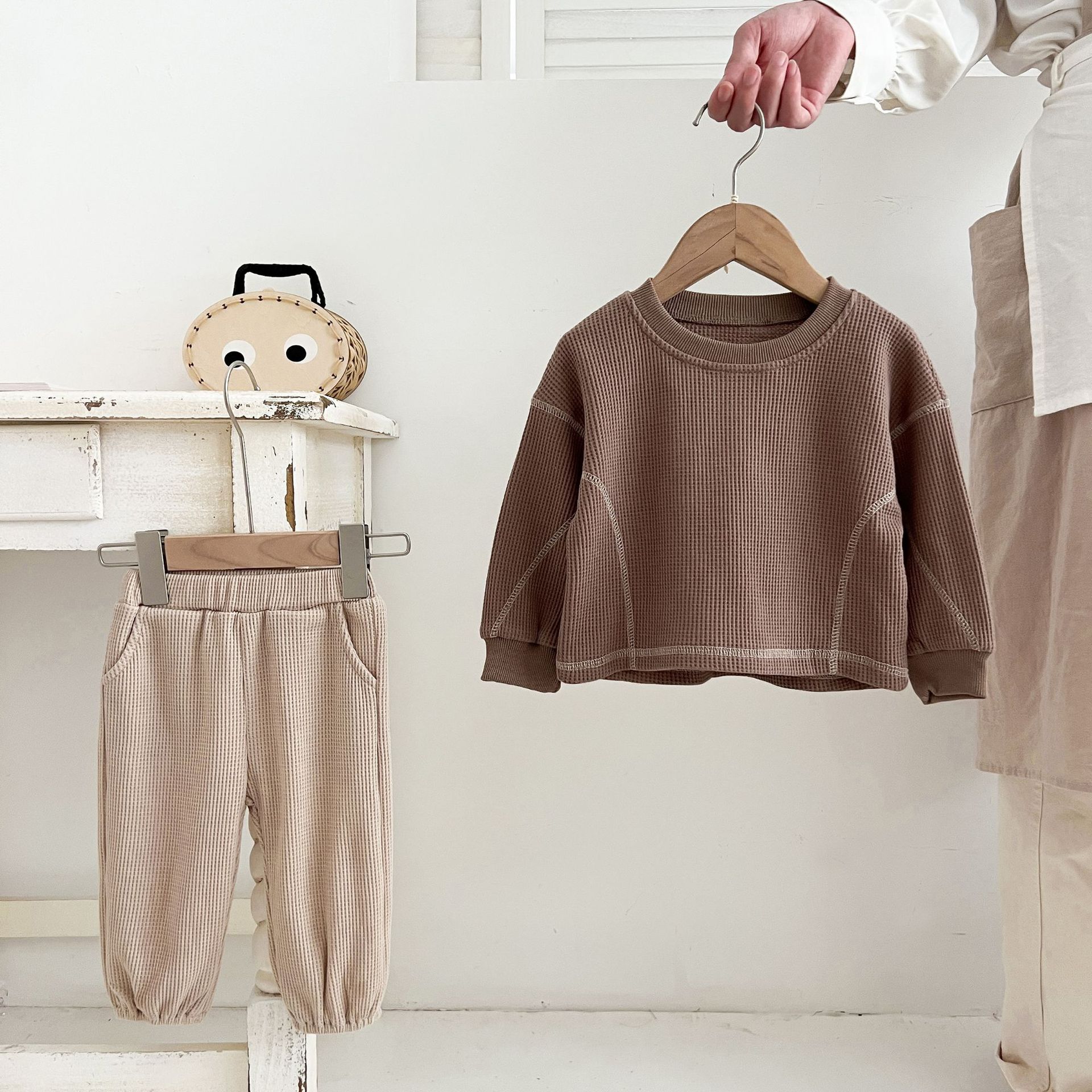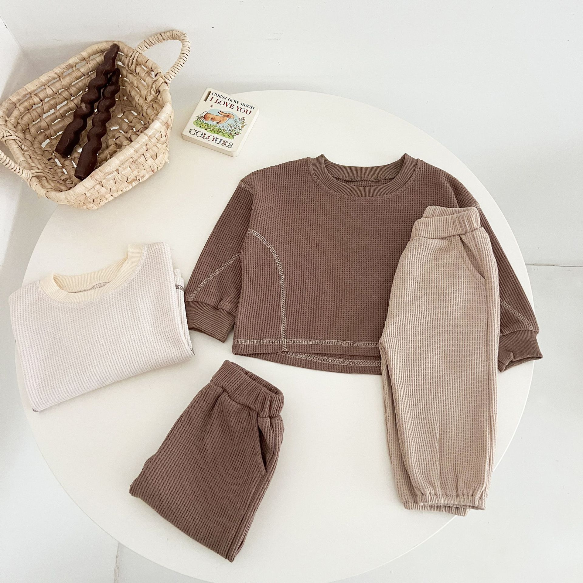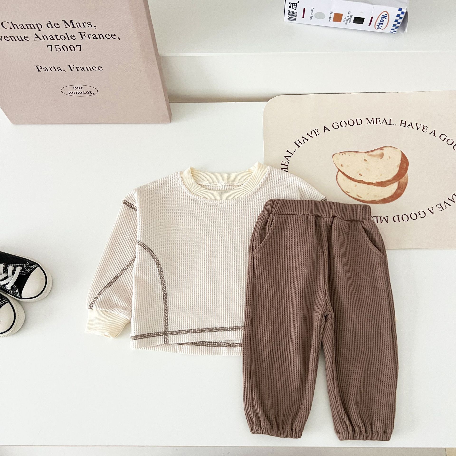 한국식 아동복 봄과 가을 아기 소년과 소녀 캐주얼 느슨한 와플 세트 긴 소매 티셔츠 바지 두 조각