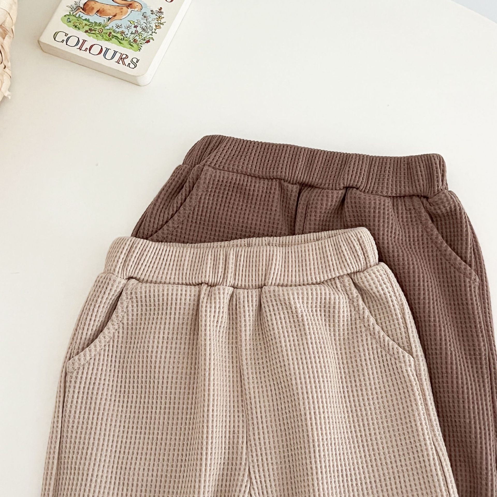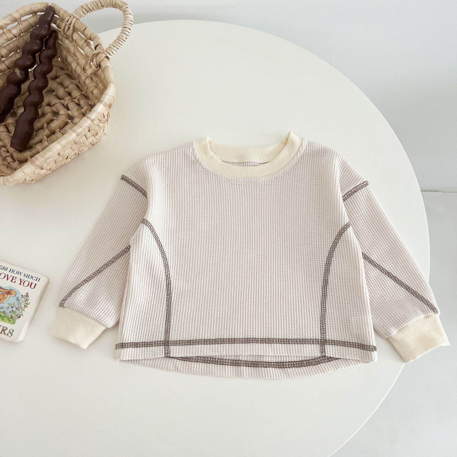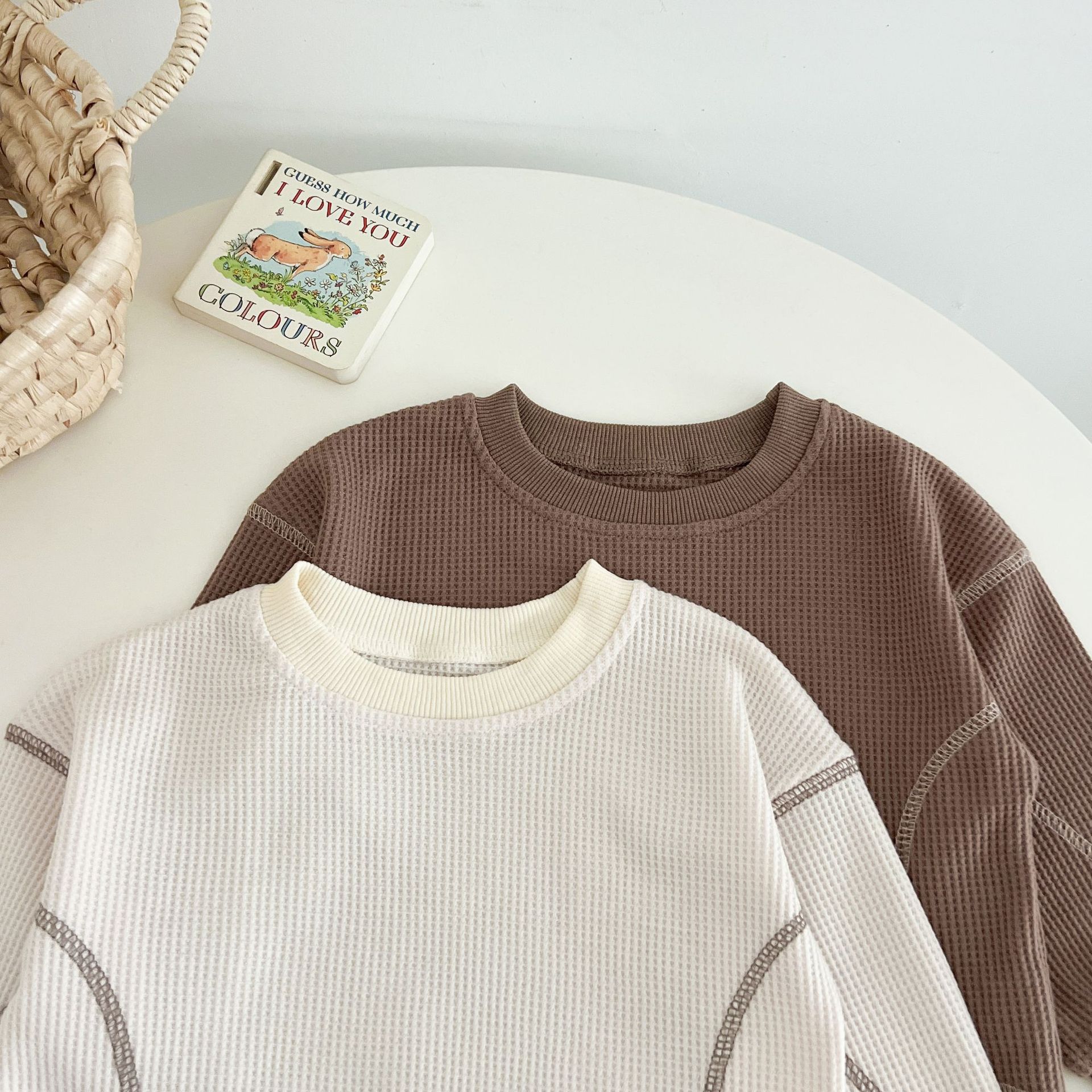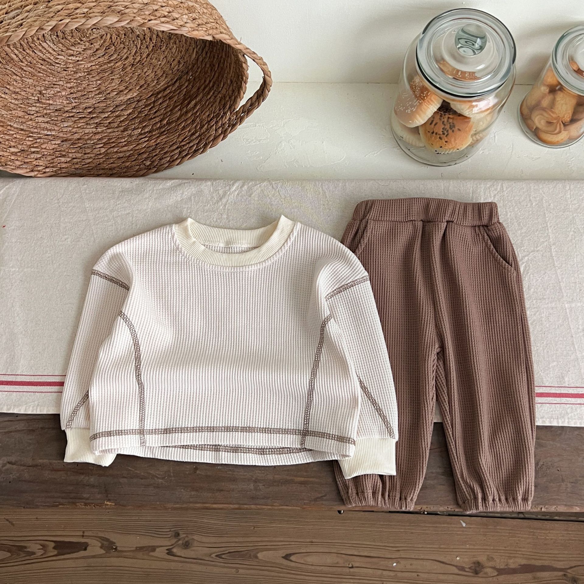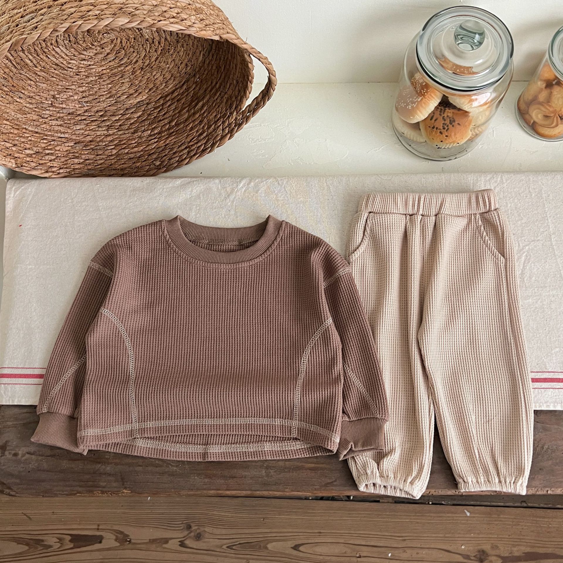 한국식 아동복 봄과 가을 아기 소년과 소녀 캐주얼 느슨한 와플 세트 긴 소매 티셔츠 바지 두 조각