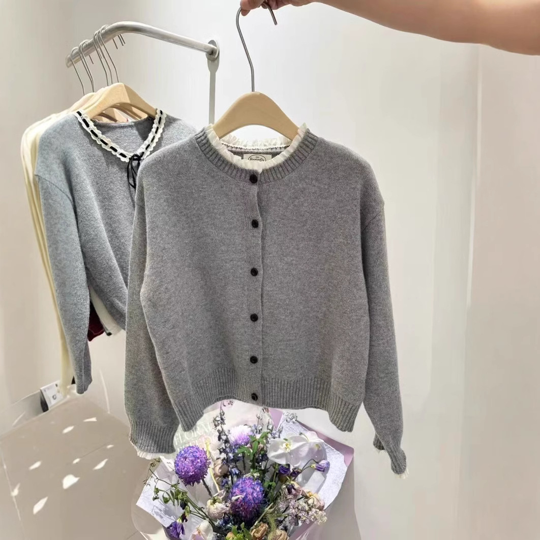 가을과 겨울 새로운 솔리드 컬러 레이스 트리밍 니트 스웨터 여성의 부드러운 게으른 양모 니트 올 매치 코트 탑