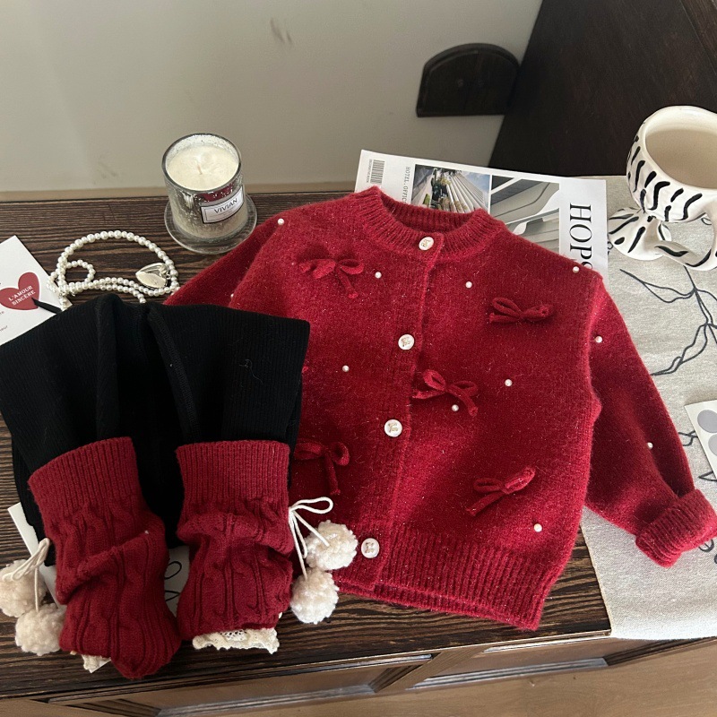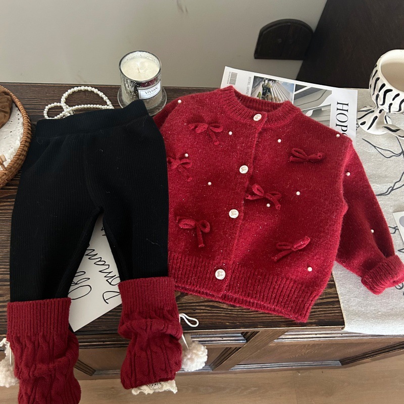 한국판 아동복 2024 새 겨울 소녀 두꺼운 스웨터 카디건 양말 기모 레깅스 세트