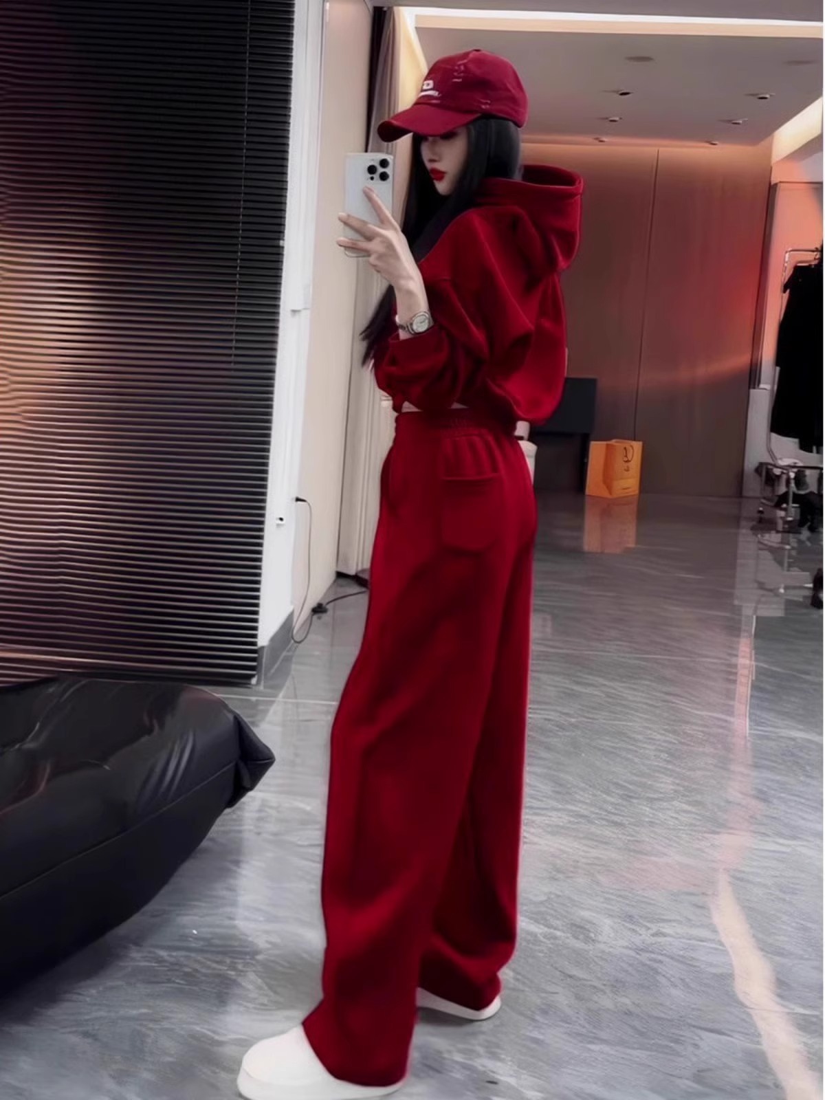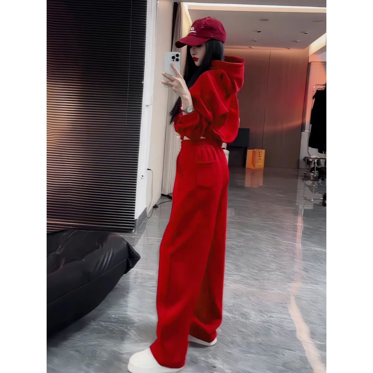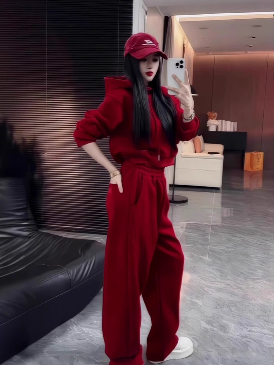 Ancora Red Sports 세트 여성의 가을과 겨울 새로운 느슨한 캐주얼 스웨터 와이드 다리 바지 패션 기모 투피스 세트스토어 가기