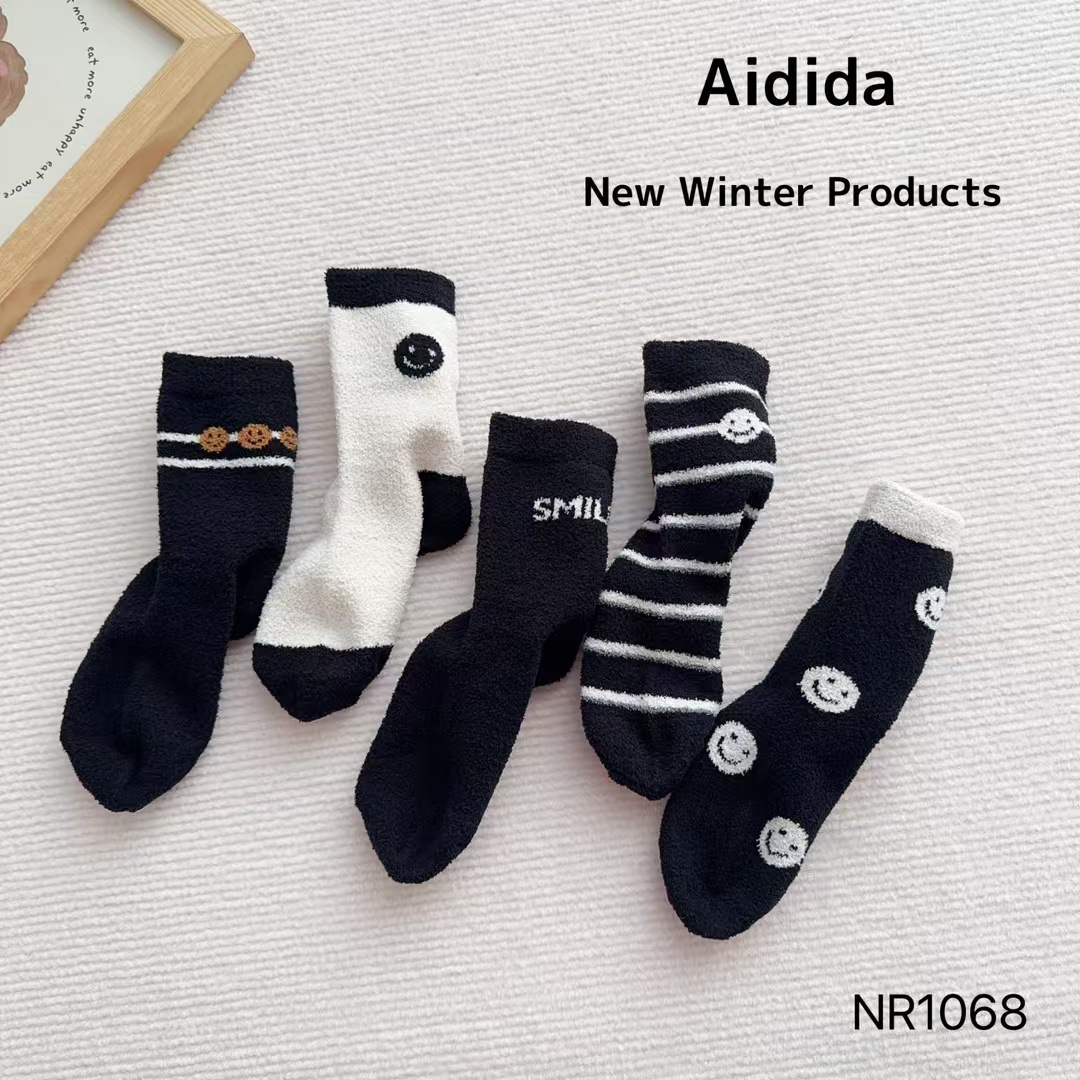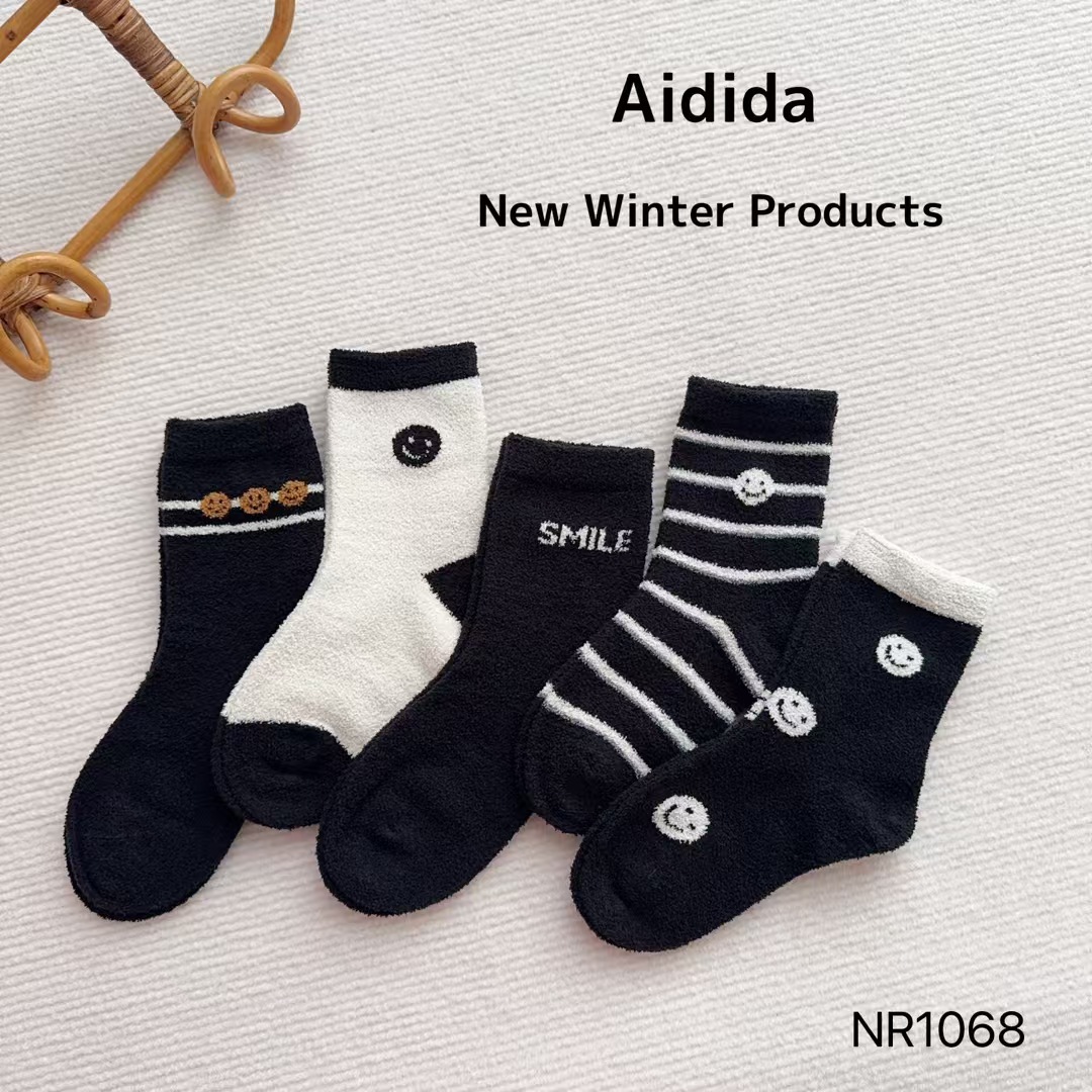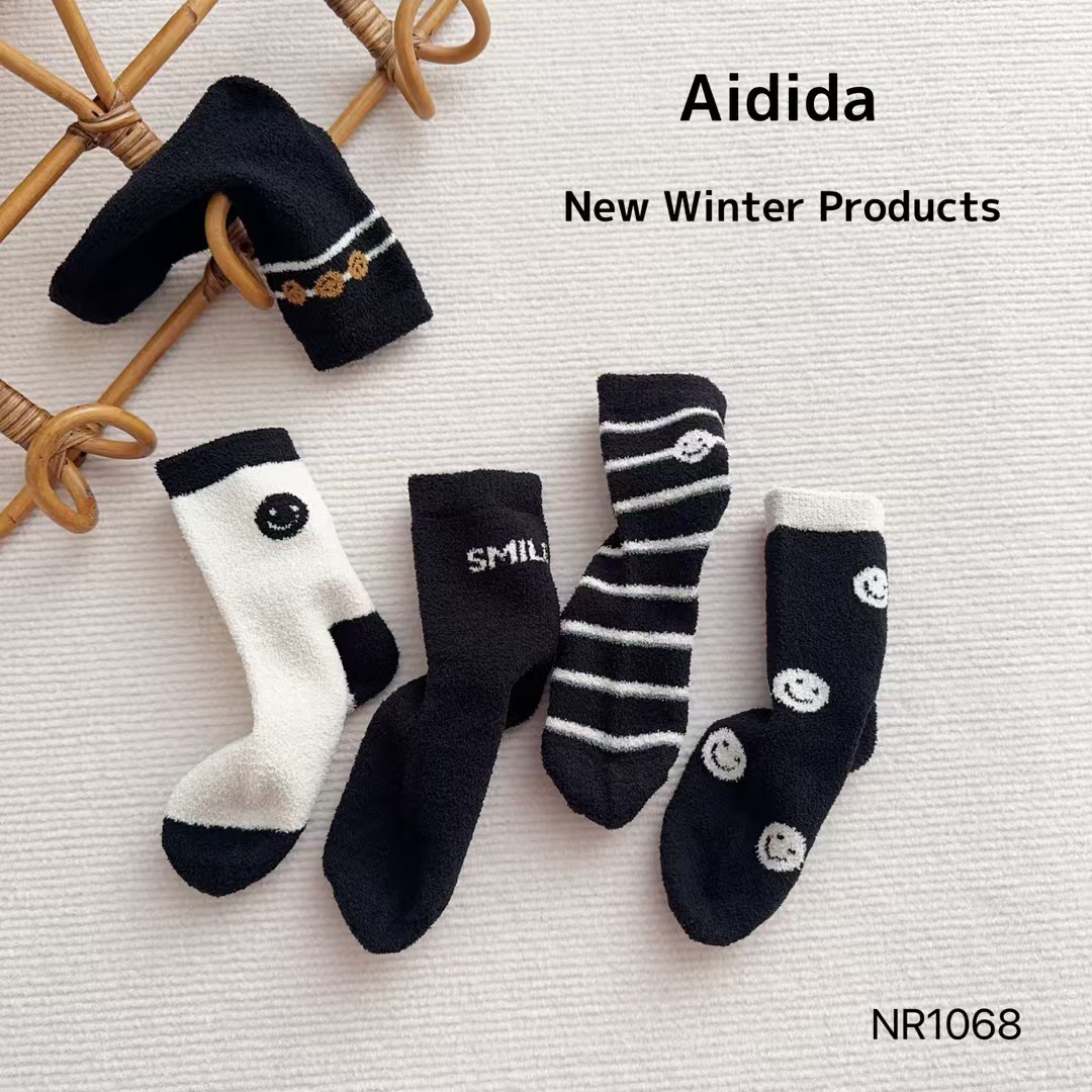 사랑의 진드기 안티 필링 어린이 양말 겨울 새로운 두꺼운 흑백 웃는 산호 양털 1-15 년 된 공장 도매