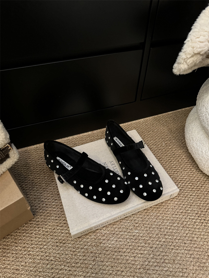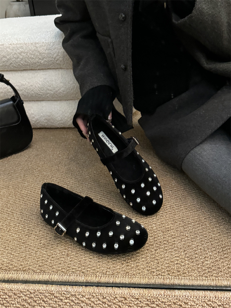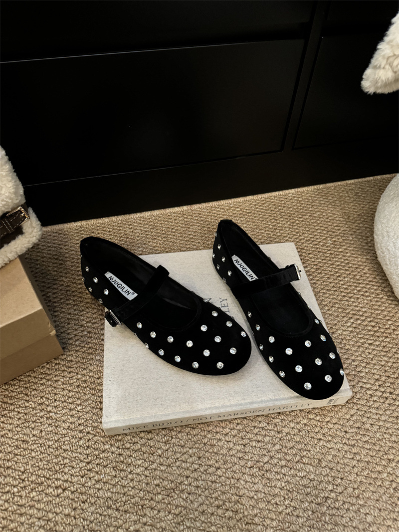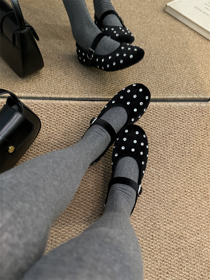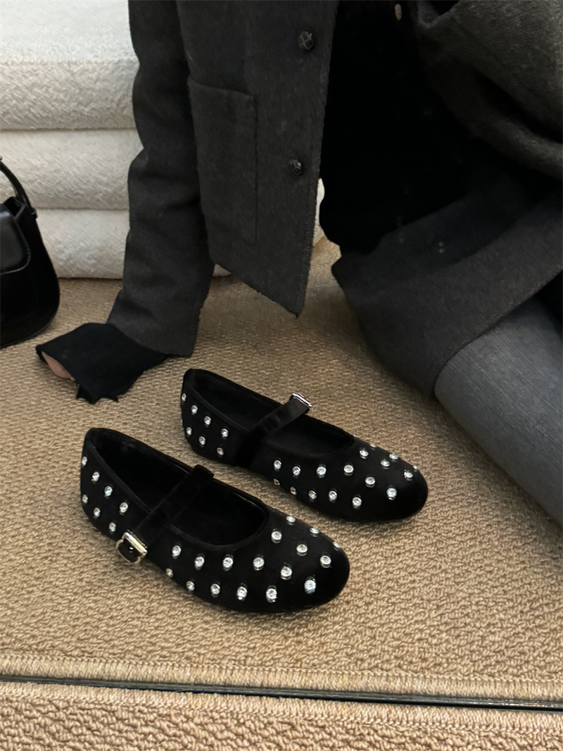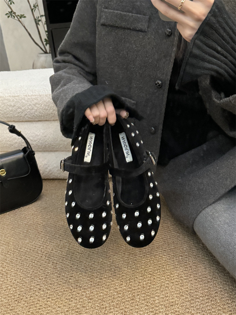 2025 봄과 여름 새로운 광장 머리 리벳 라인스톤 플랫 바닥 가죽 발레 신발 메리 신발 여성