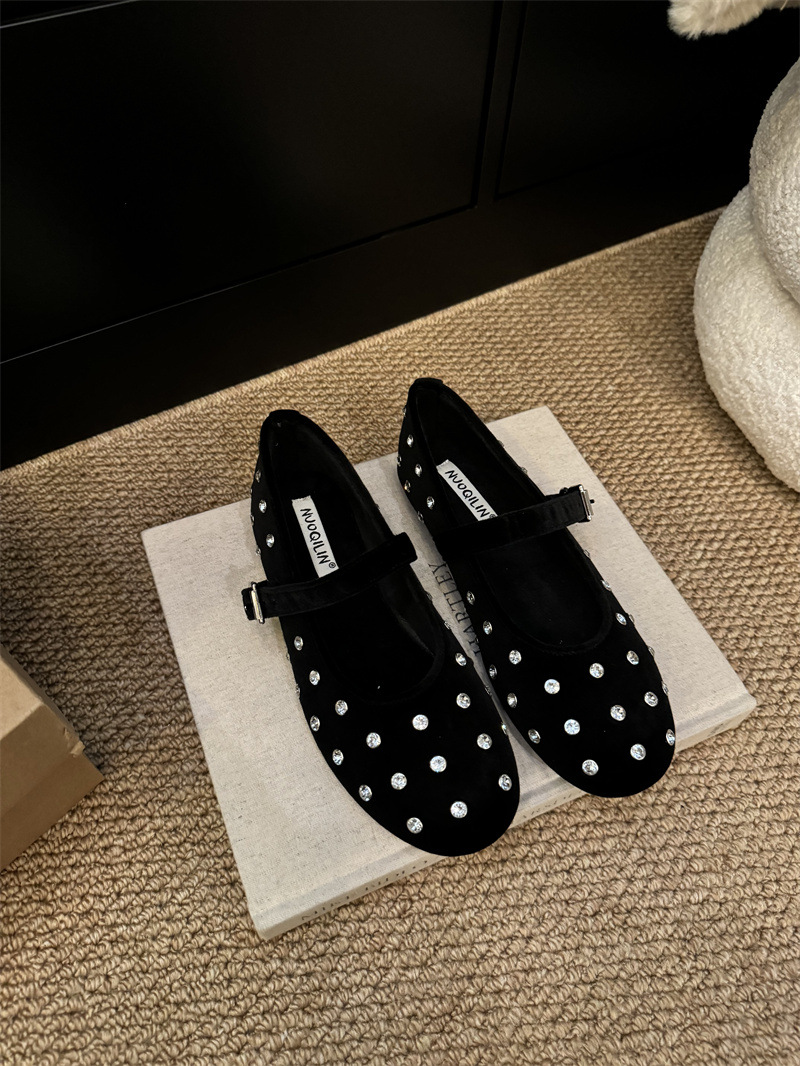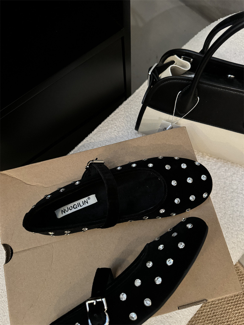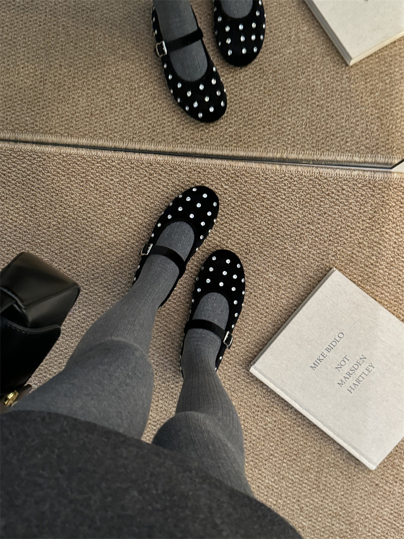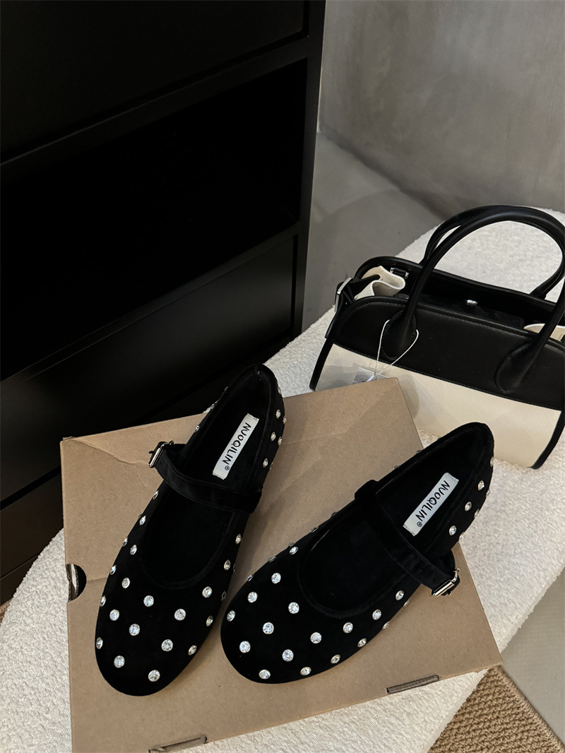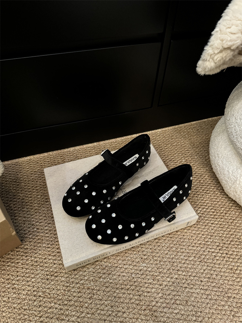 2025 봄과 여름 새로운 광장 머리 리벳 라인스톤 플랫 바닥 가죽 발레 신발 메리 신발 여성