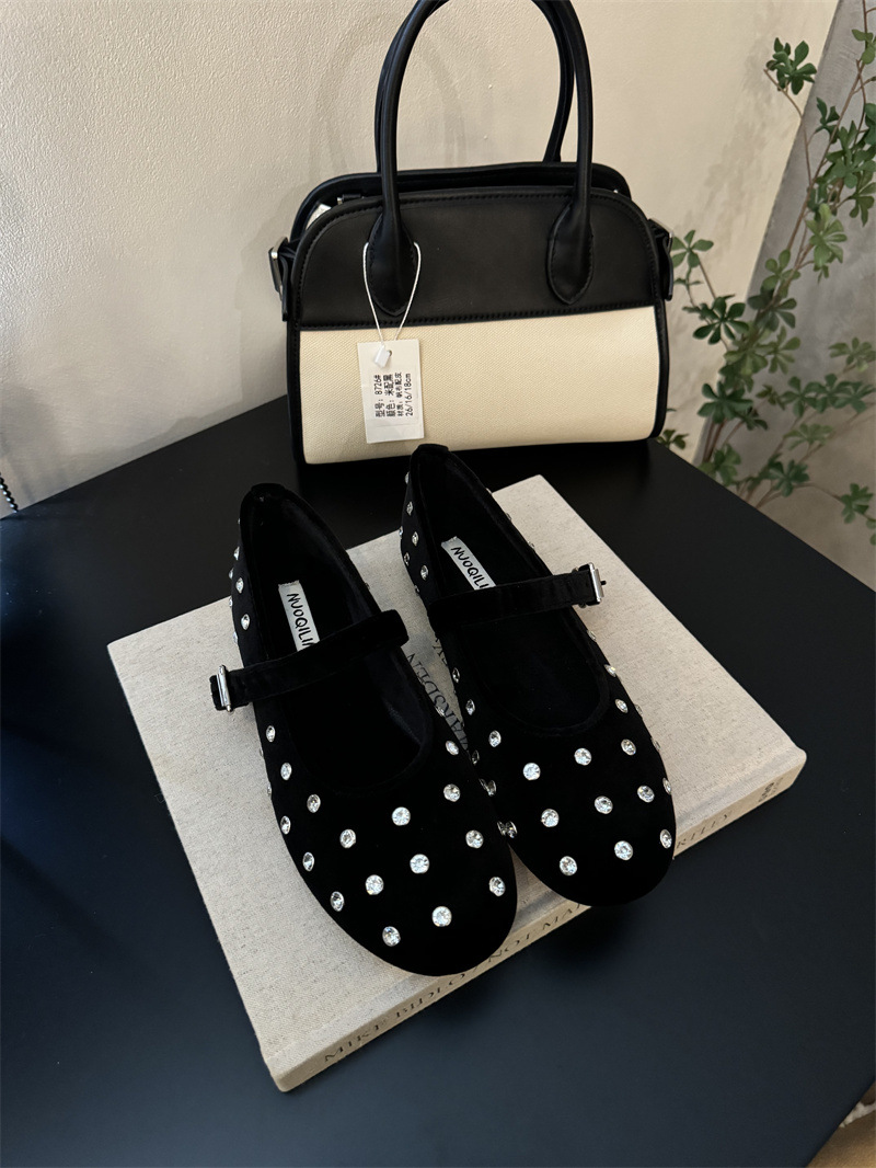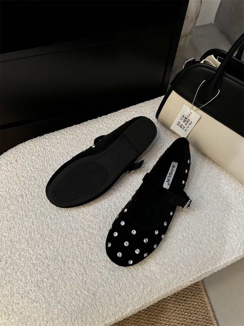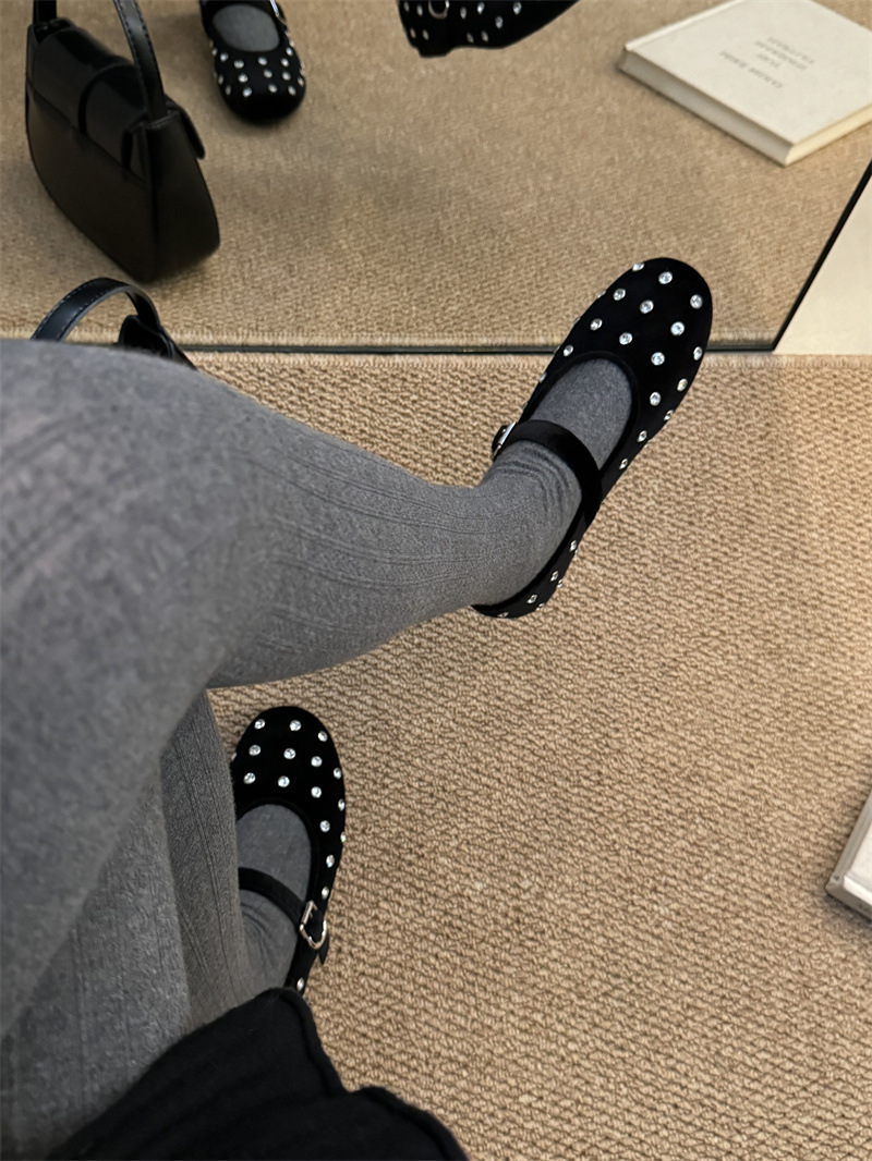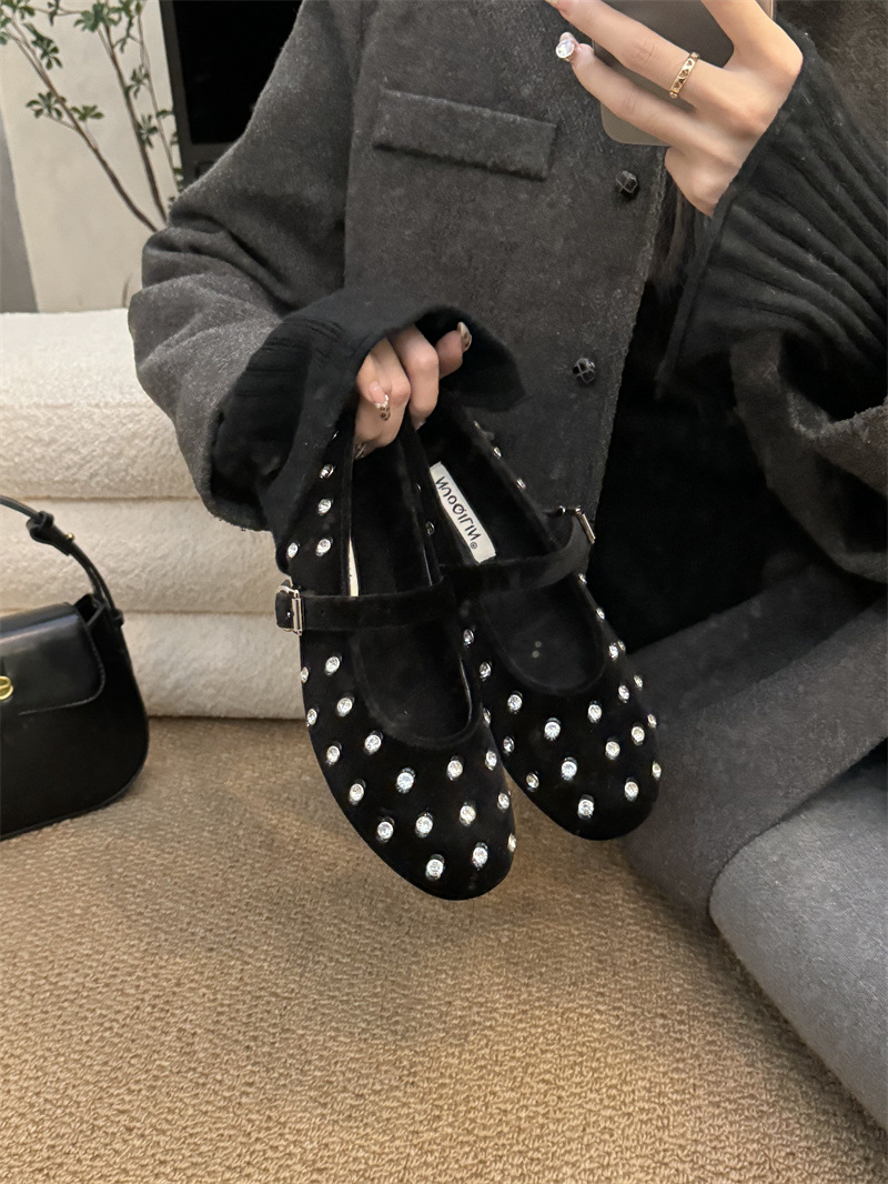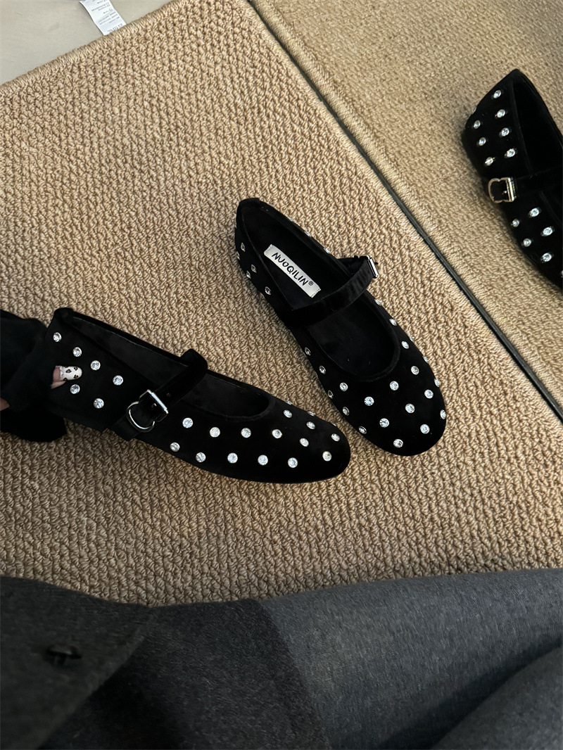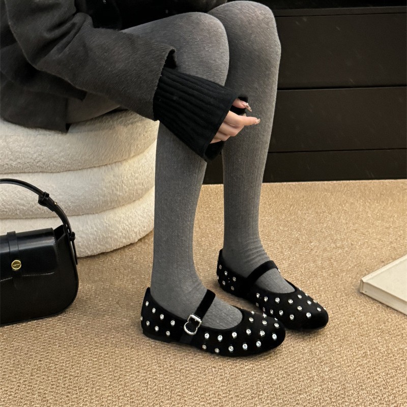 2025 봄과 여름 새로운 광장 머리 리벳 라인스톤 플랫 바닥 가죽 발레 신발 메리 신발 여성