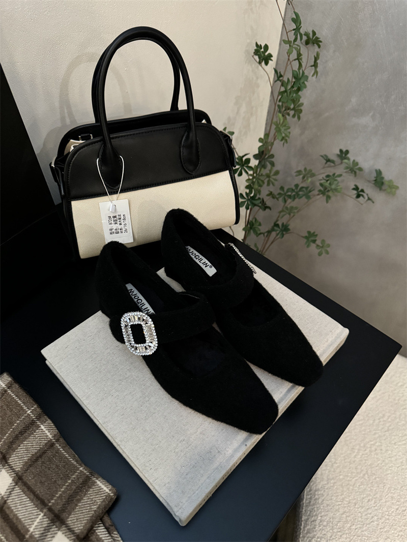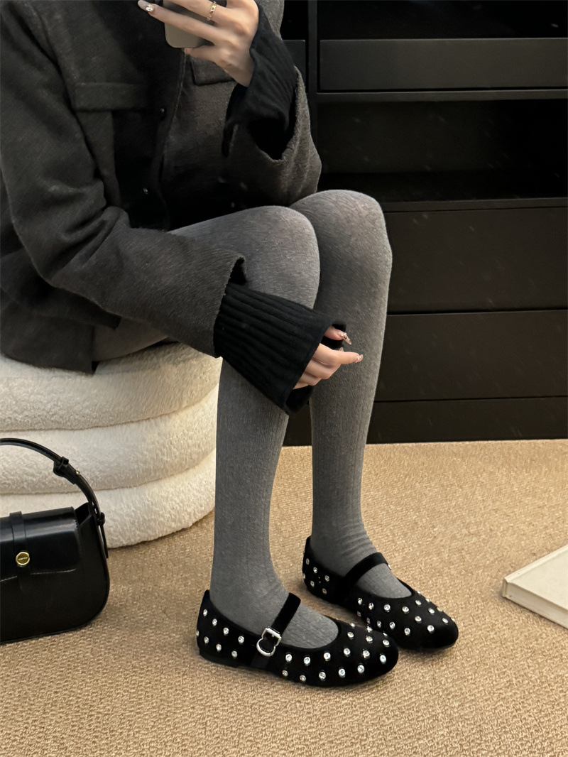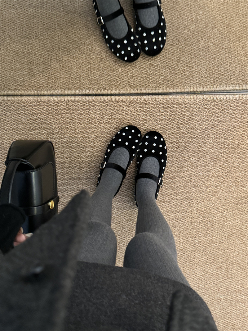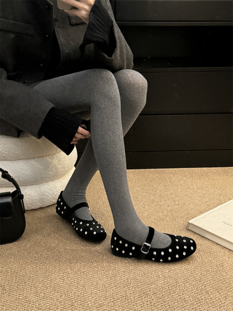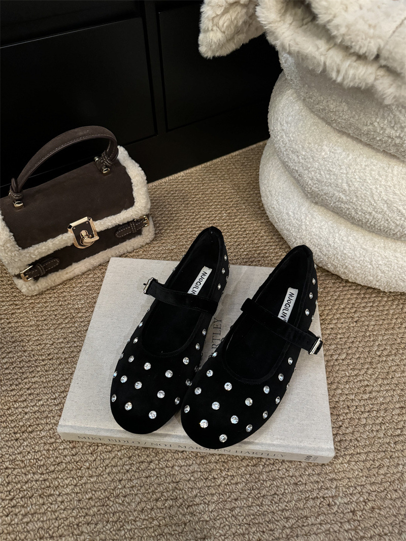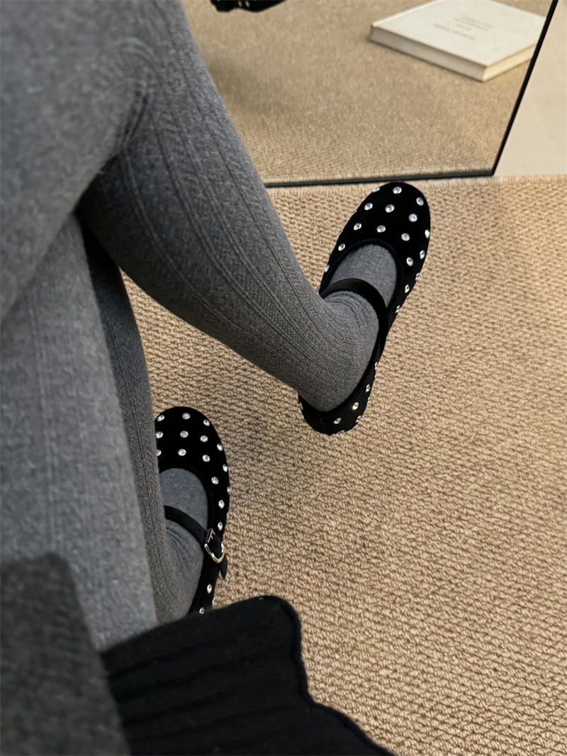 2025 봄과 여름 새로운 광장 머리 리벳 라인스톤 플랫 바닥 가죽 발레 신발 메리 신발 여성
