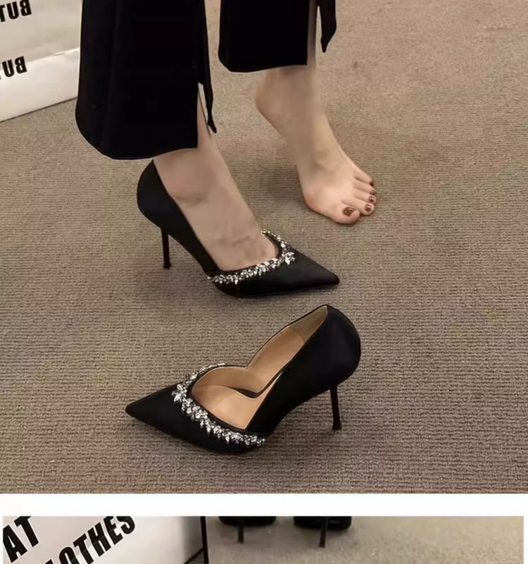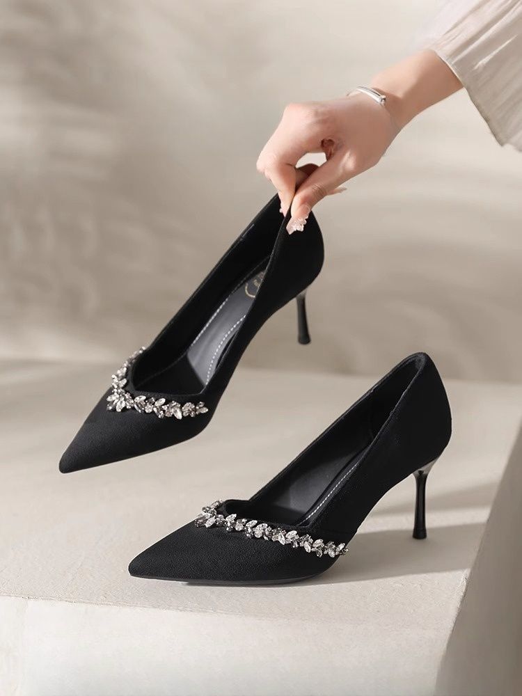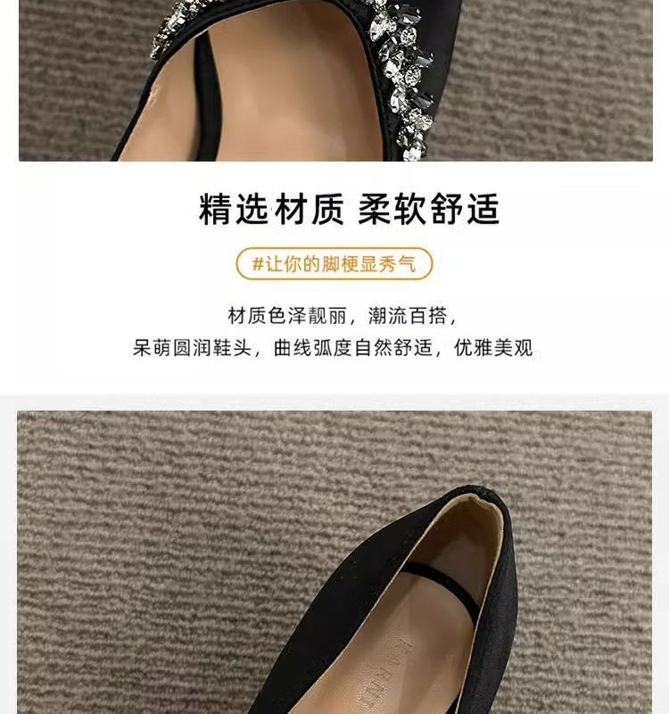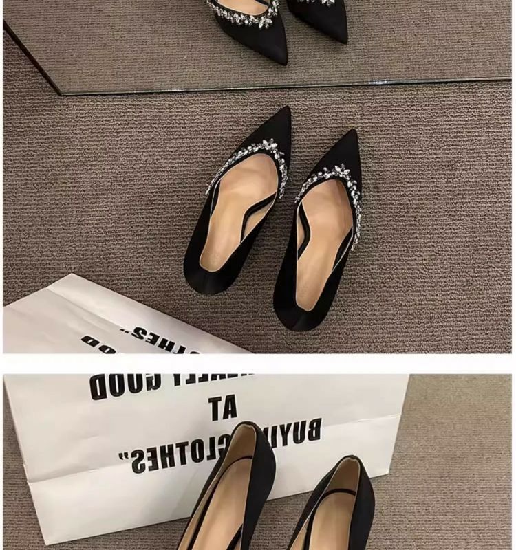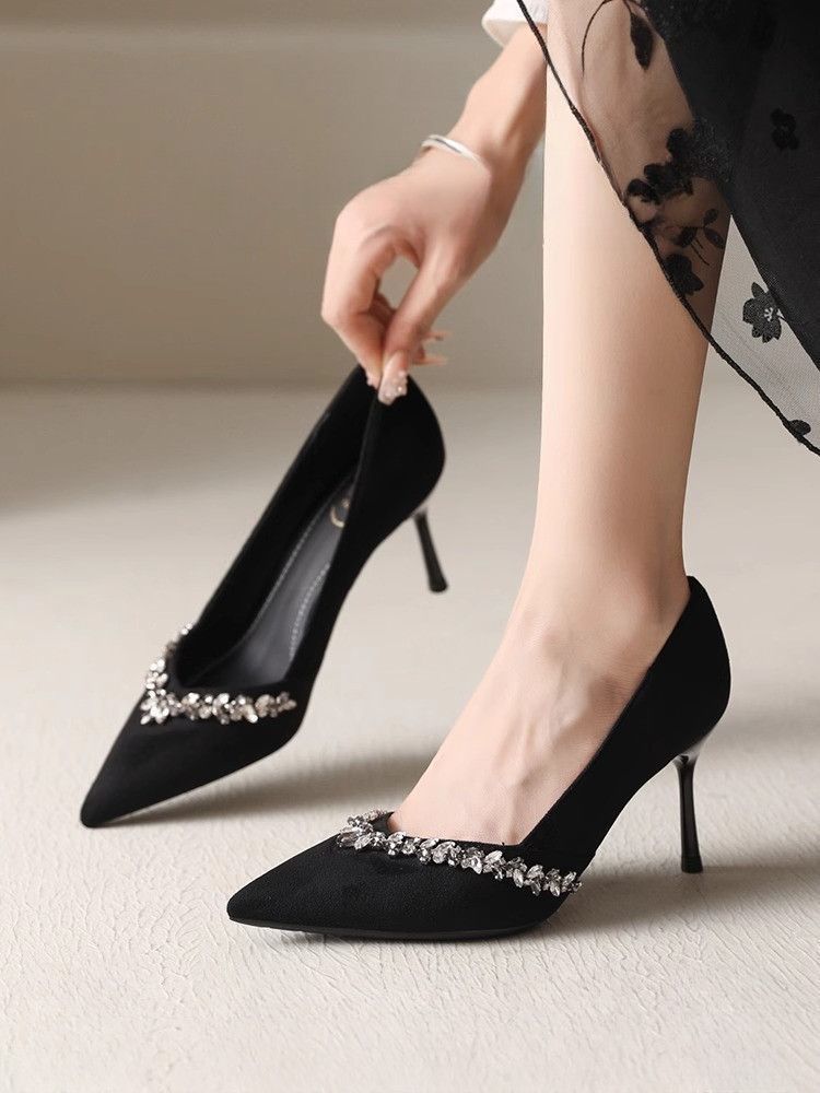 여성용 슬립 온 신발 얕은 탑 스틸레토 힐을 가리키는 프랑스 우아한 블랙 하이힐 다이아몬드 싱글 신발 여성의 2024 새로운 가을스토어 가기