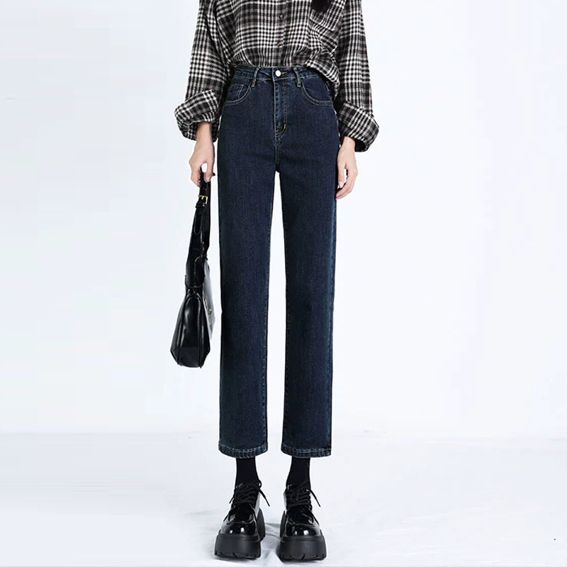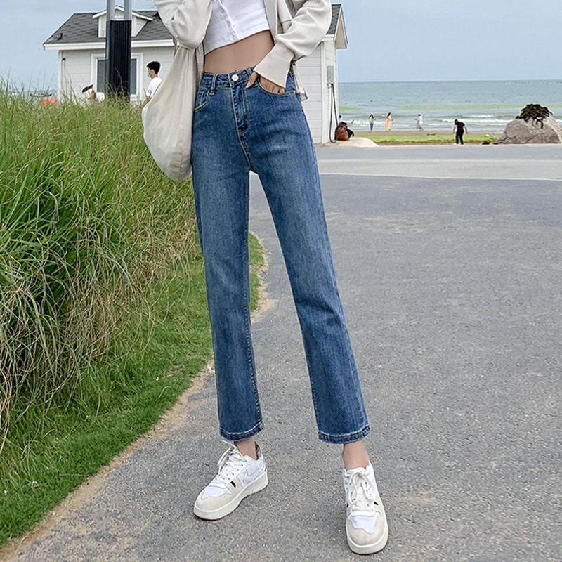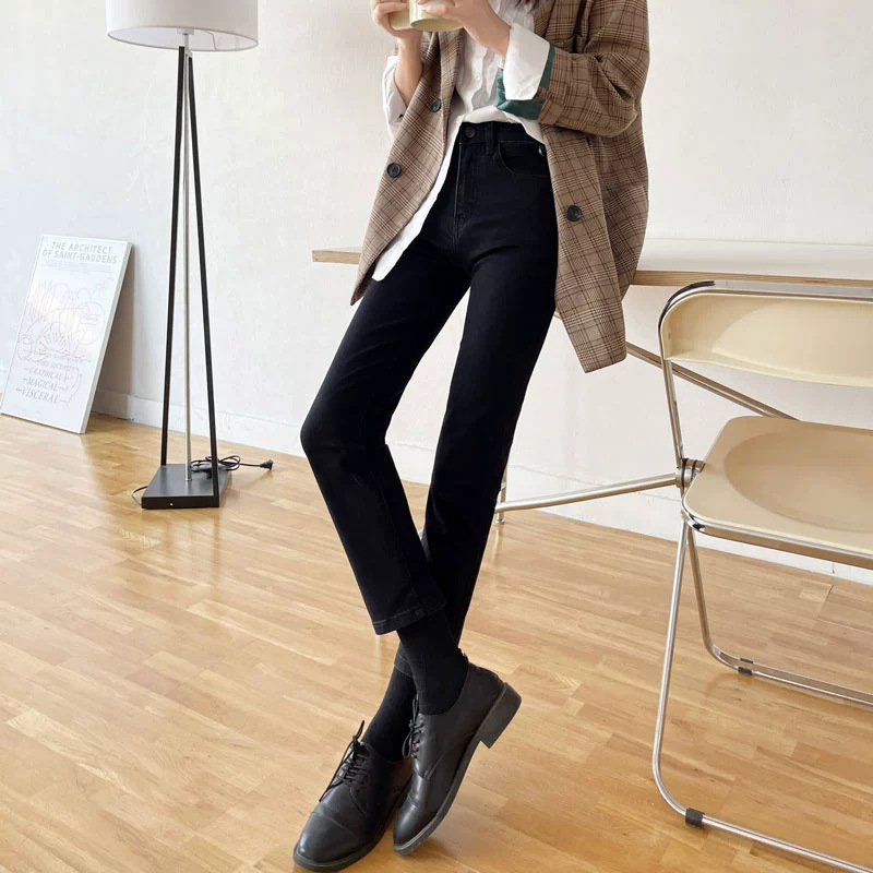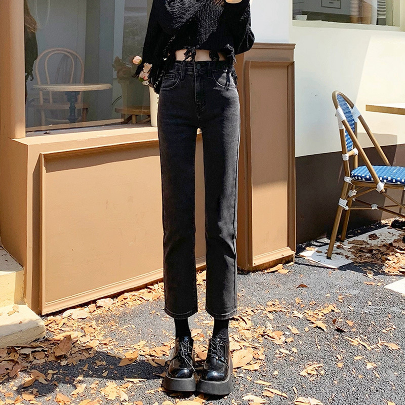 데님 작은 스트레이트 바지 여성의 유행 봄과 가을 슬림-적합 외부 착용 스트레치 통근 자른 검은 회색 높은 허리 연기 튜브 바지스토어 가기