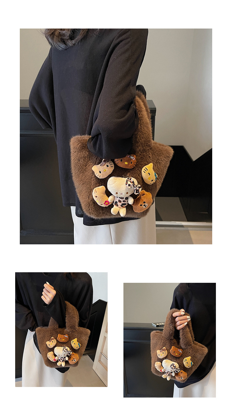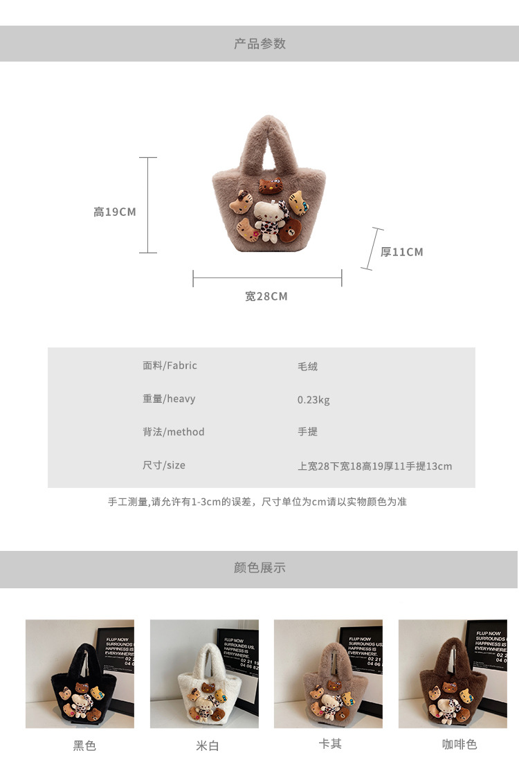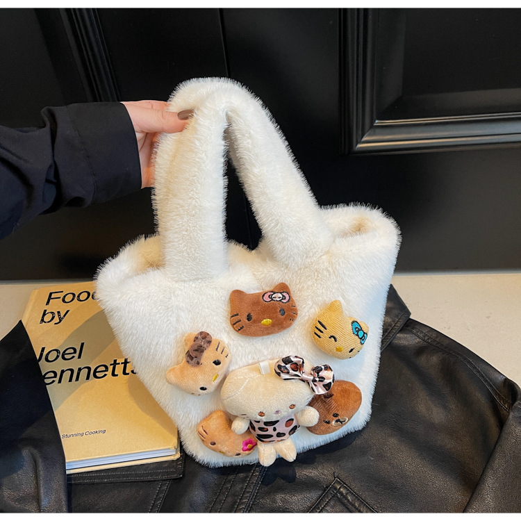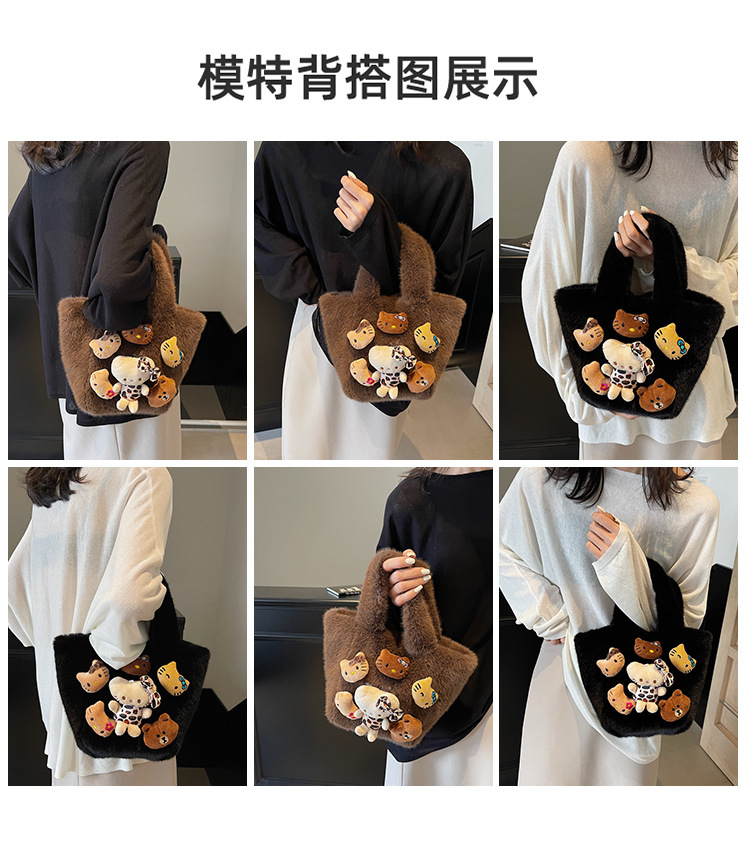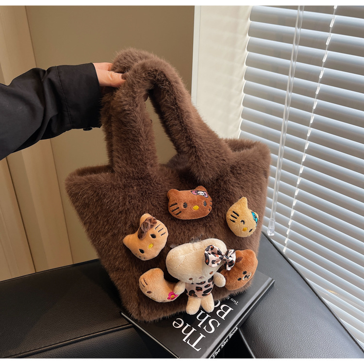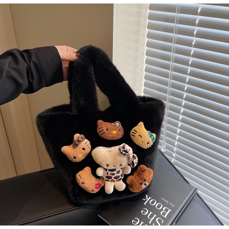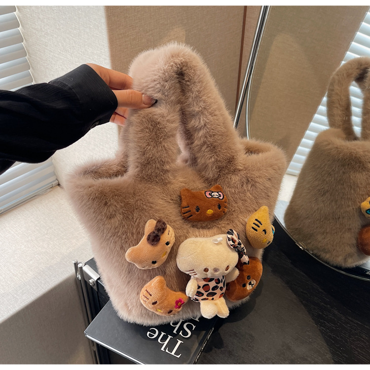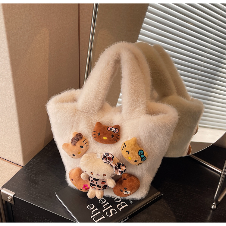 여성을위한 귀여운 플러시 버킷 가방 2024 새로운 가을, 겨울 외출 휴대용 모피 작은 가방 만화 모피 가방스토어 가기