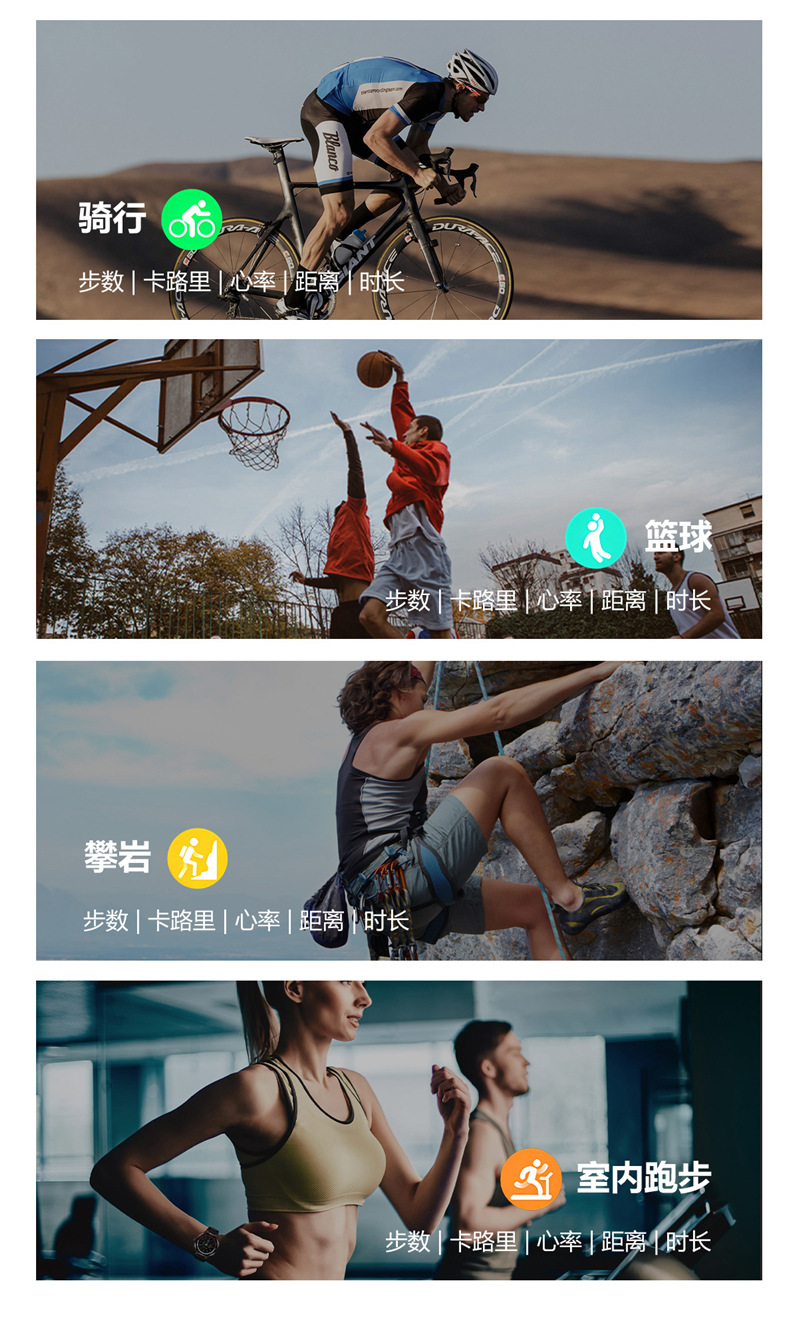 充电时间 | 1-2H | Exercise data (step count, distance, calories), indoor exercise (push ups, indoor running, plank, indoor cycling, jump rope, yoga, battle rope, sit ups, elliptical machines), outdoor exercise (outdoor walking, outdoor running, outdoor cycling, mountaineering, badminton, basketball, football) | |