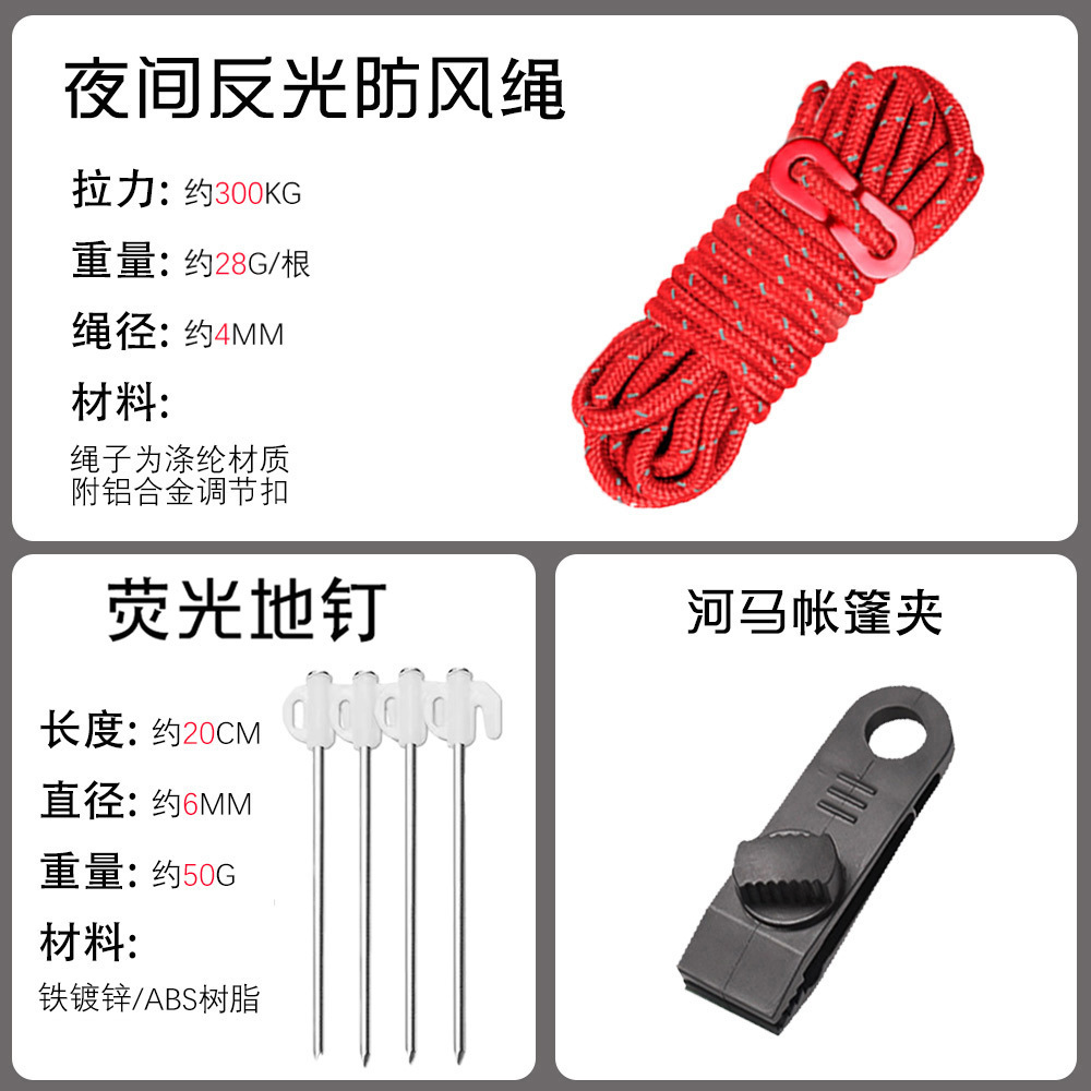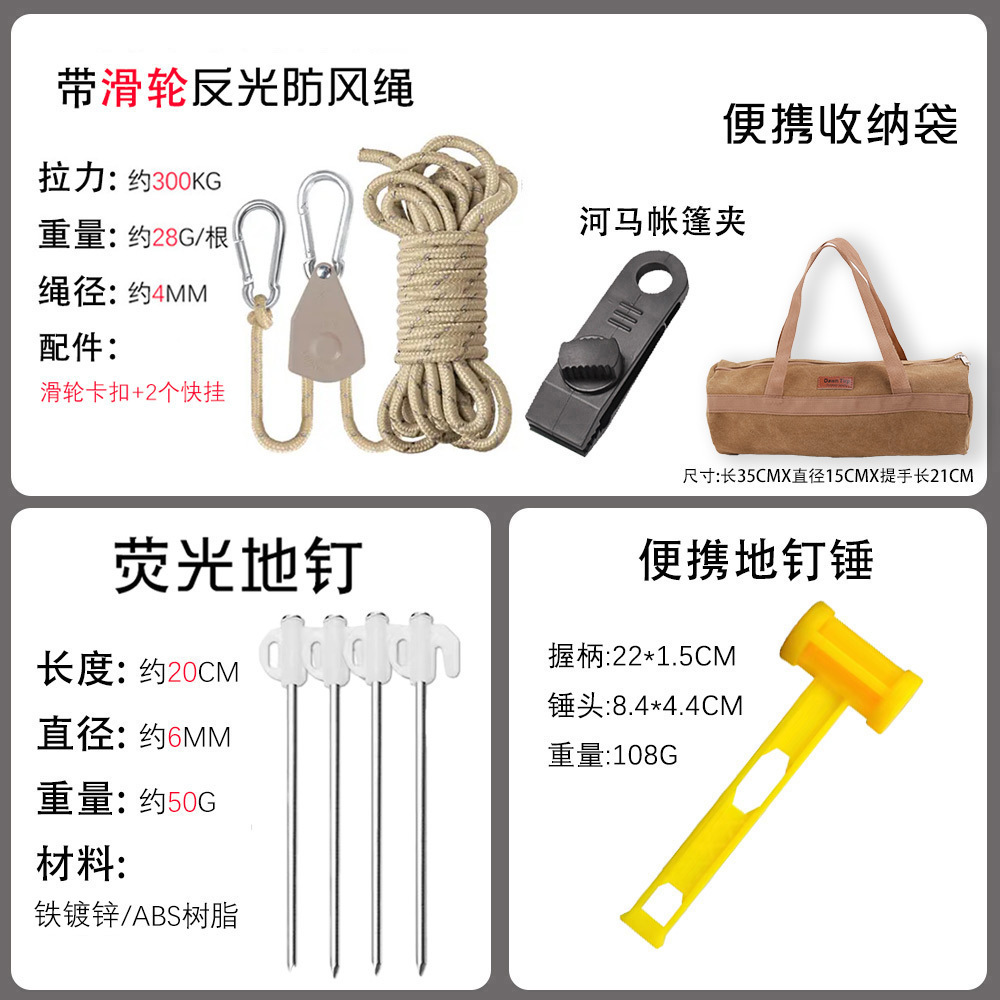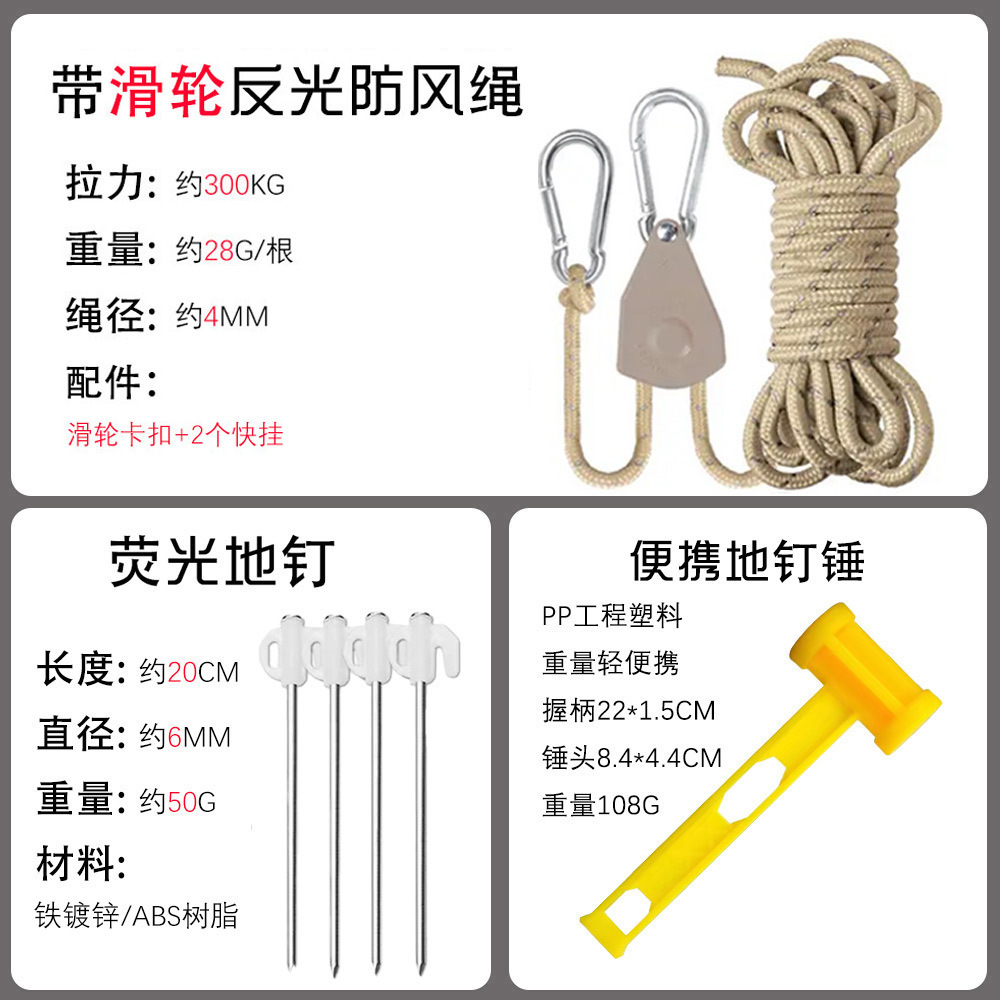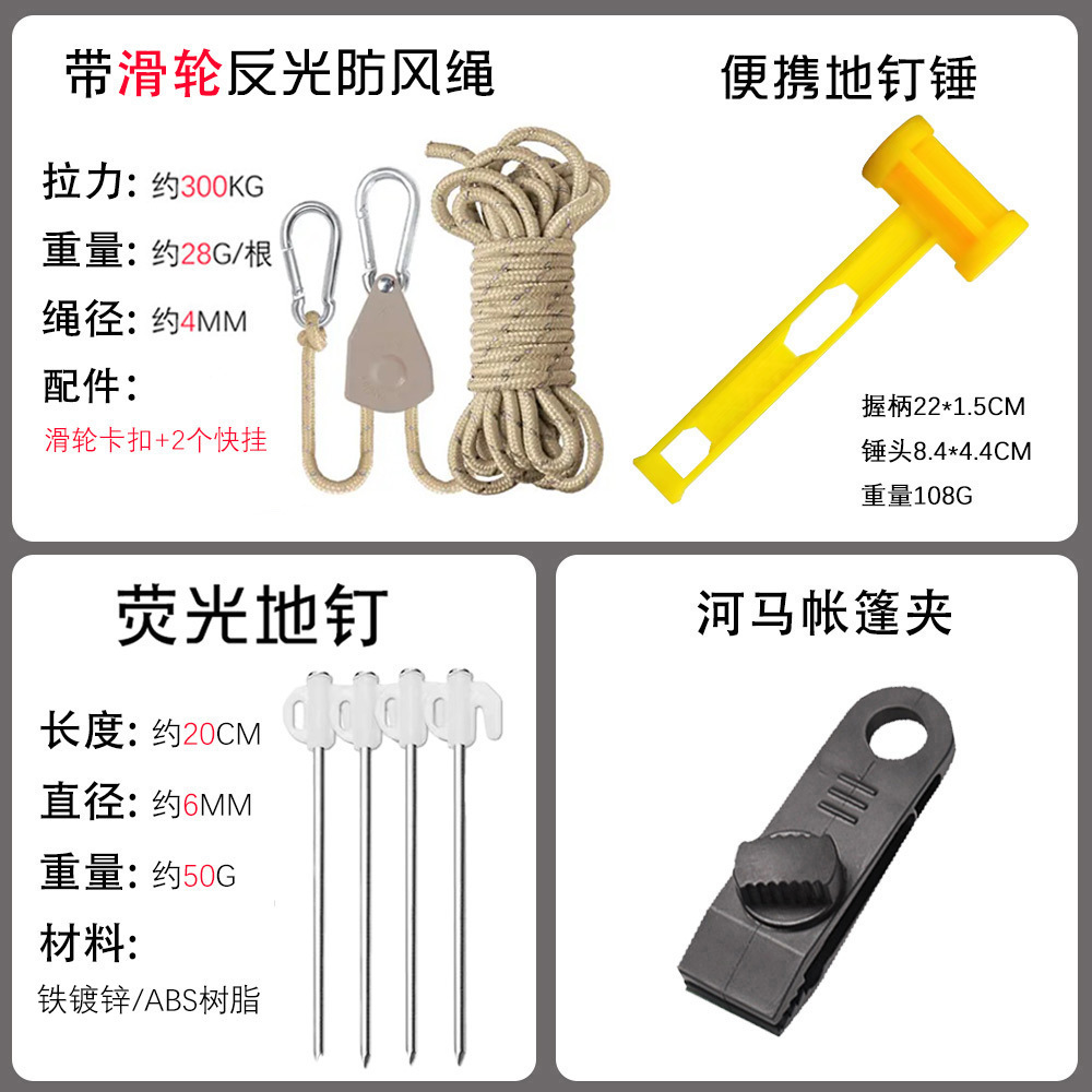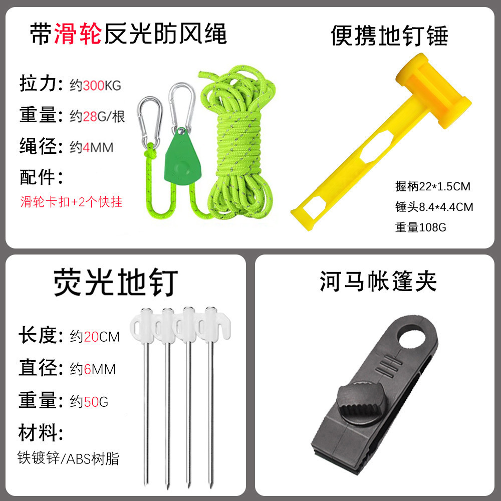 • 빨간색 롤러 스케이트 반사 방풍 로프 4개 + 접지 못 4개 + 클립 4개 + 망치 + 카키색 보관 가방