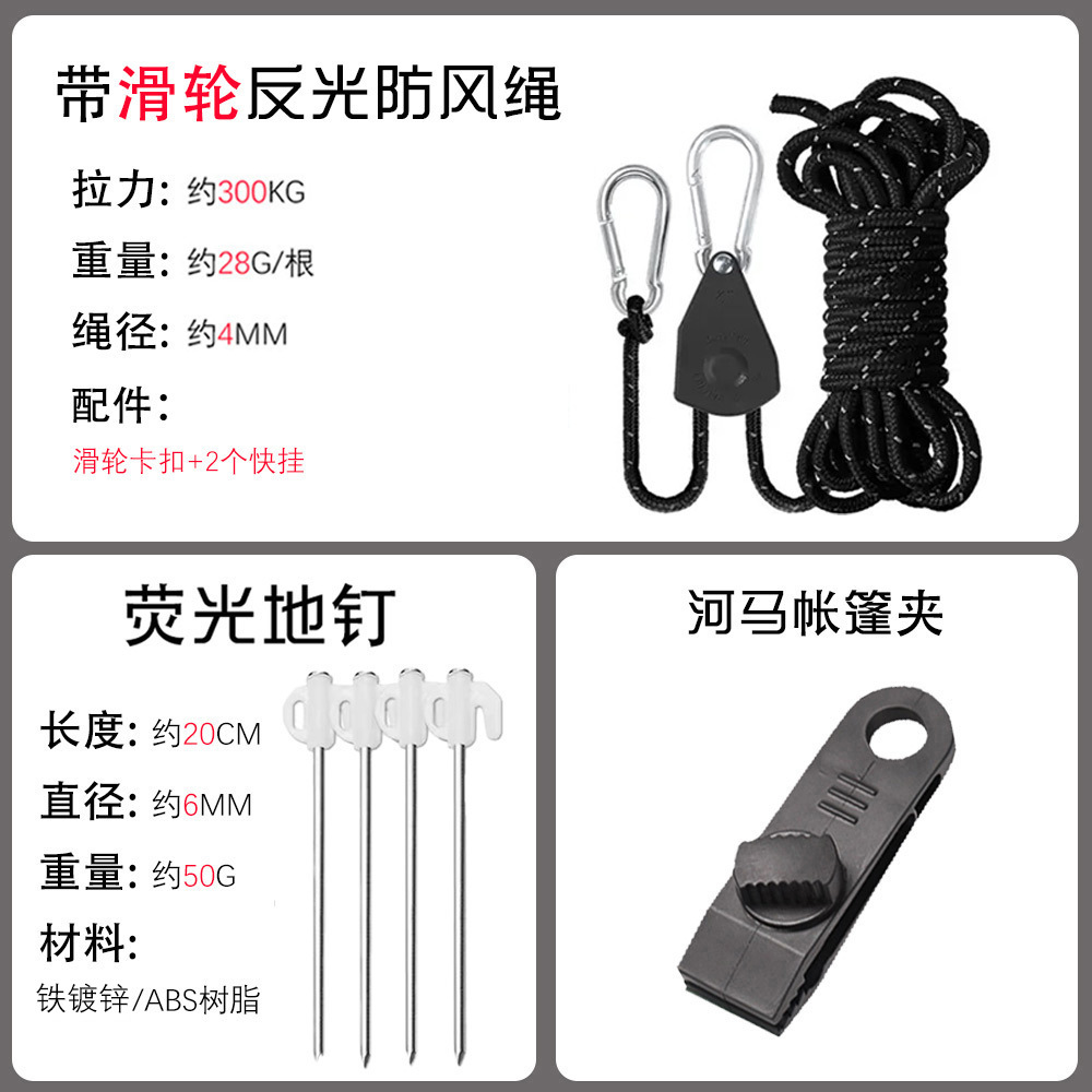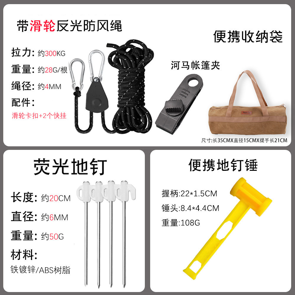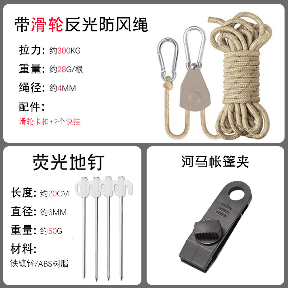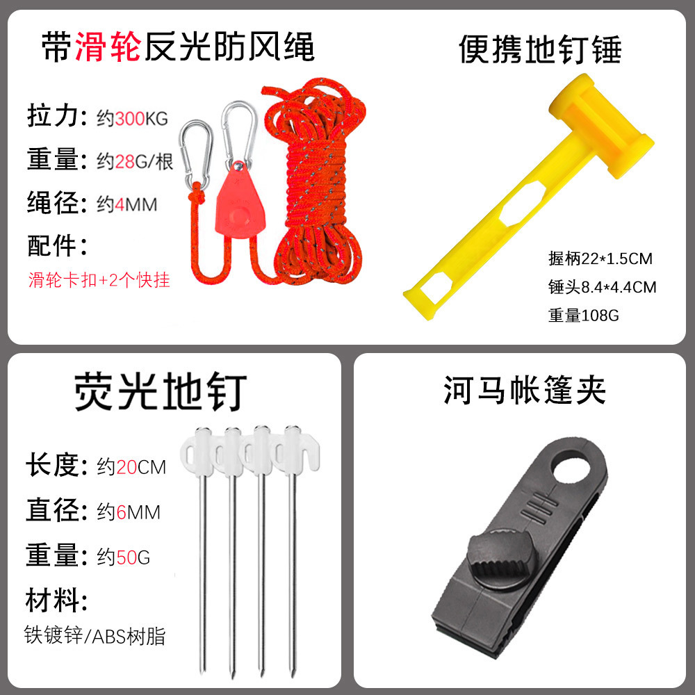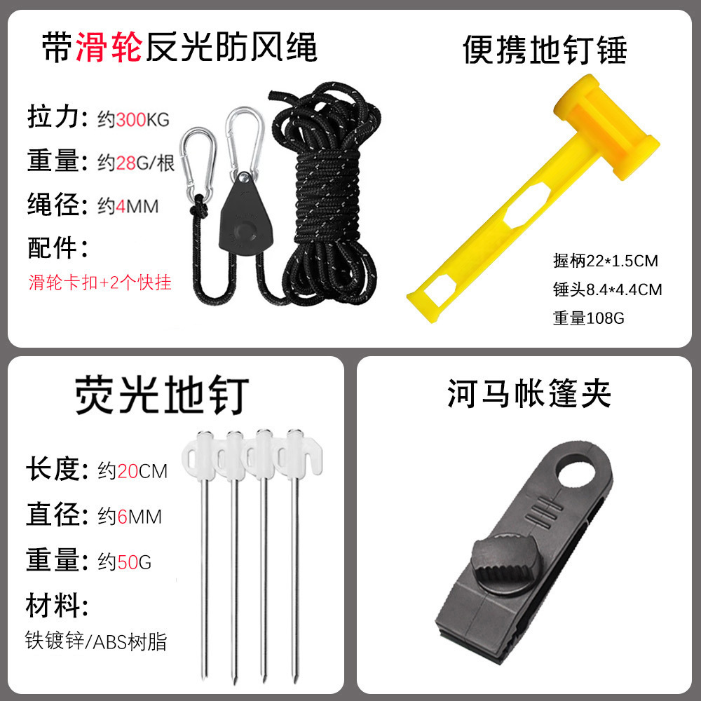 • 빨간색 롤러 스케이트 반사 방풍 로프 4개 + 접지 못 4개 + 클립 4개 + 망치 + 카키색 보관 가방