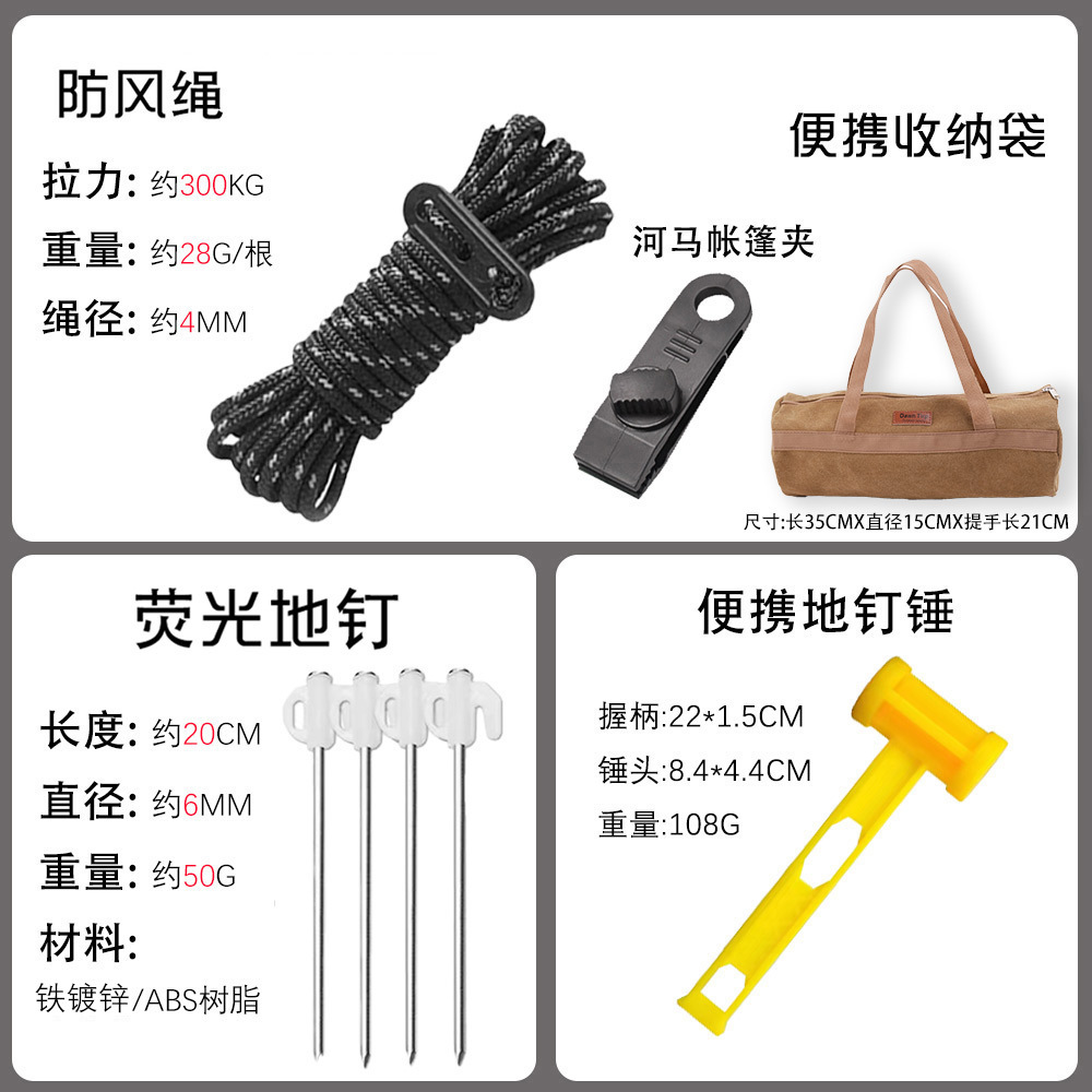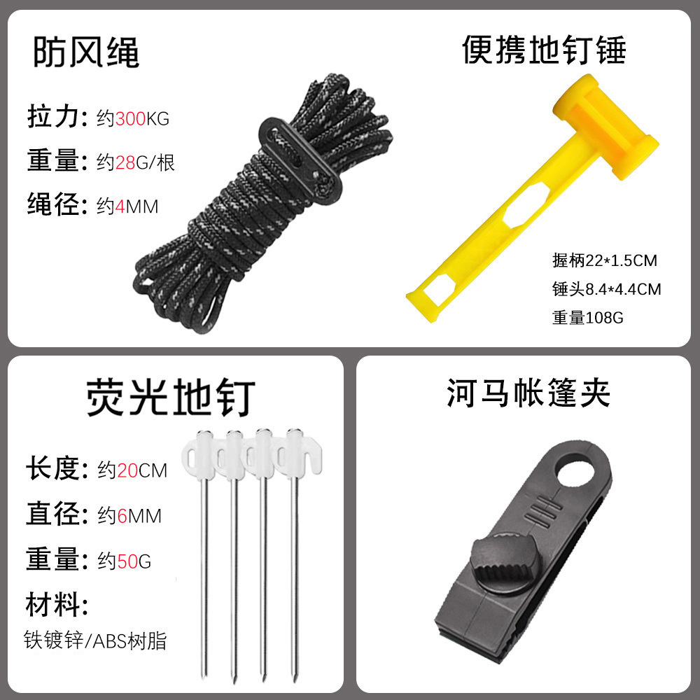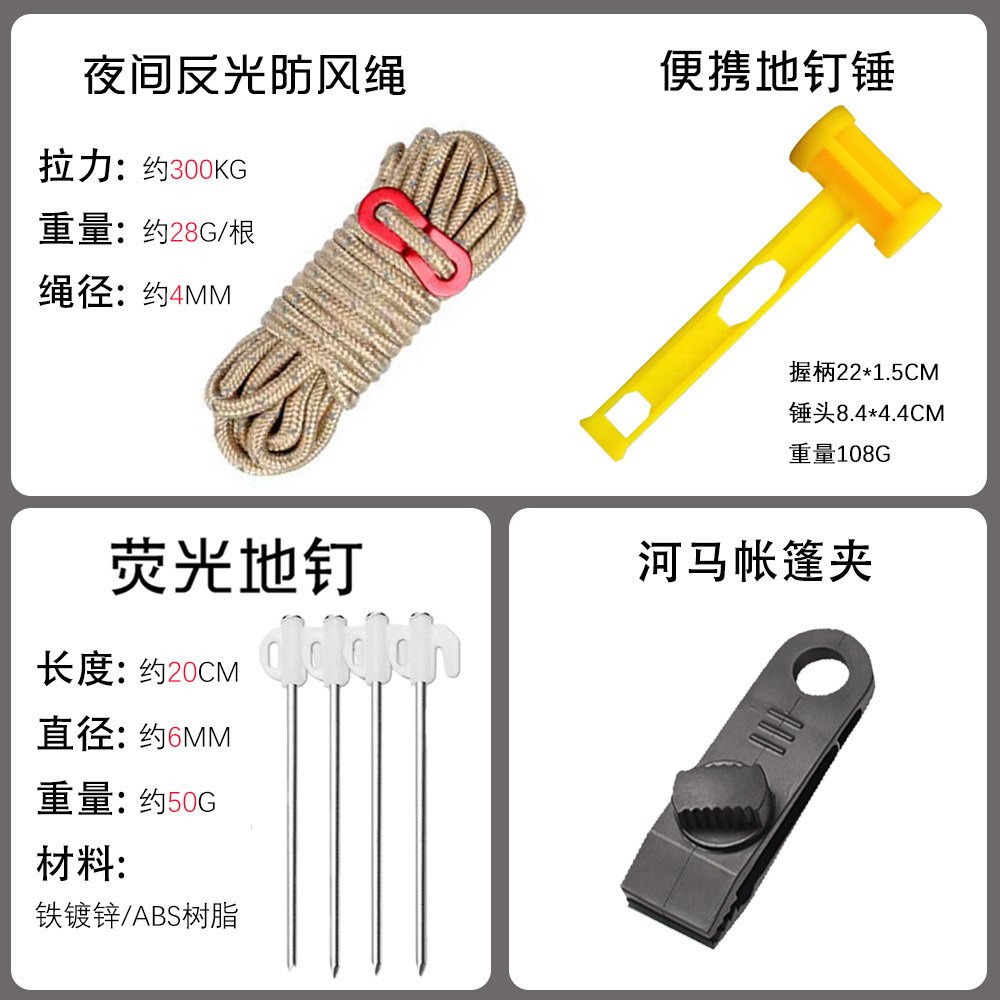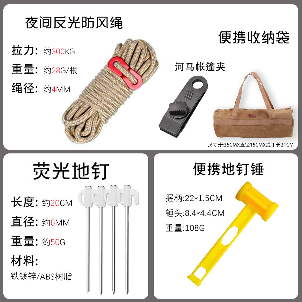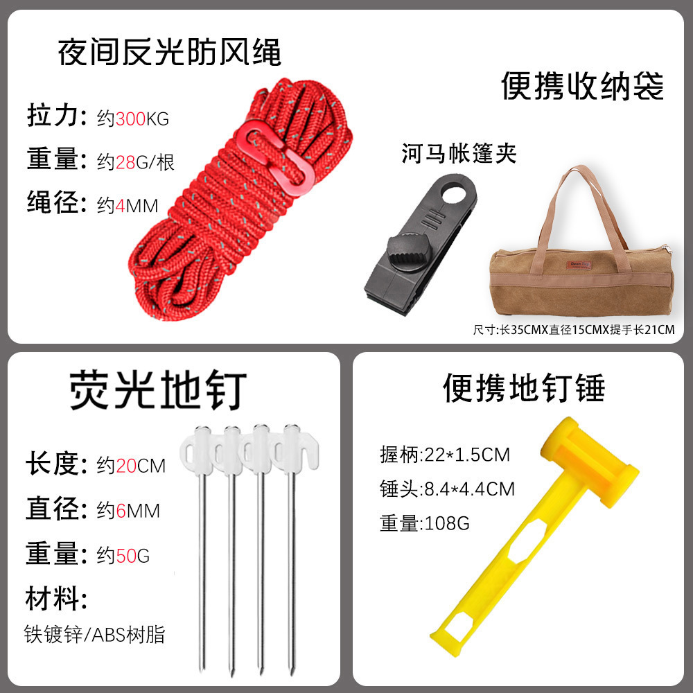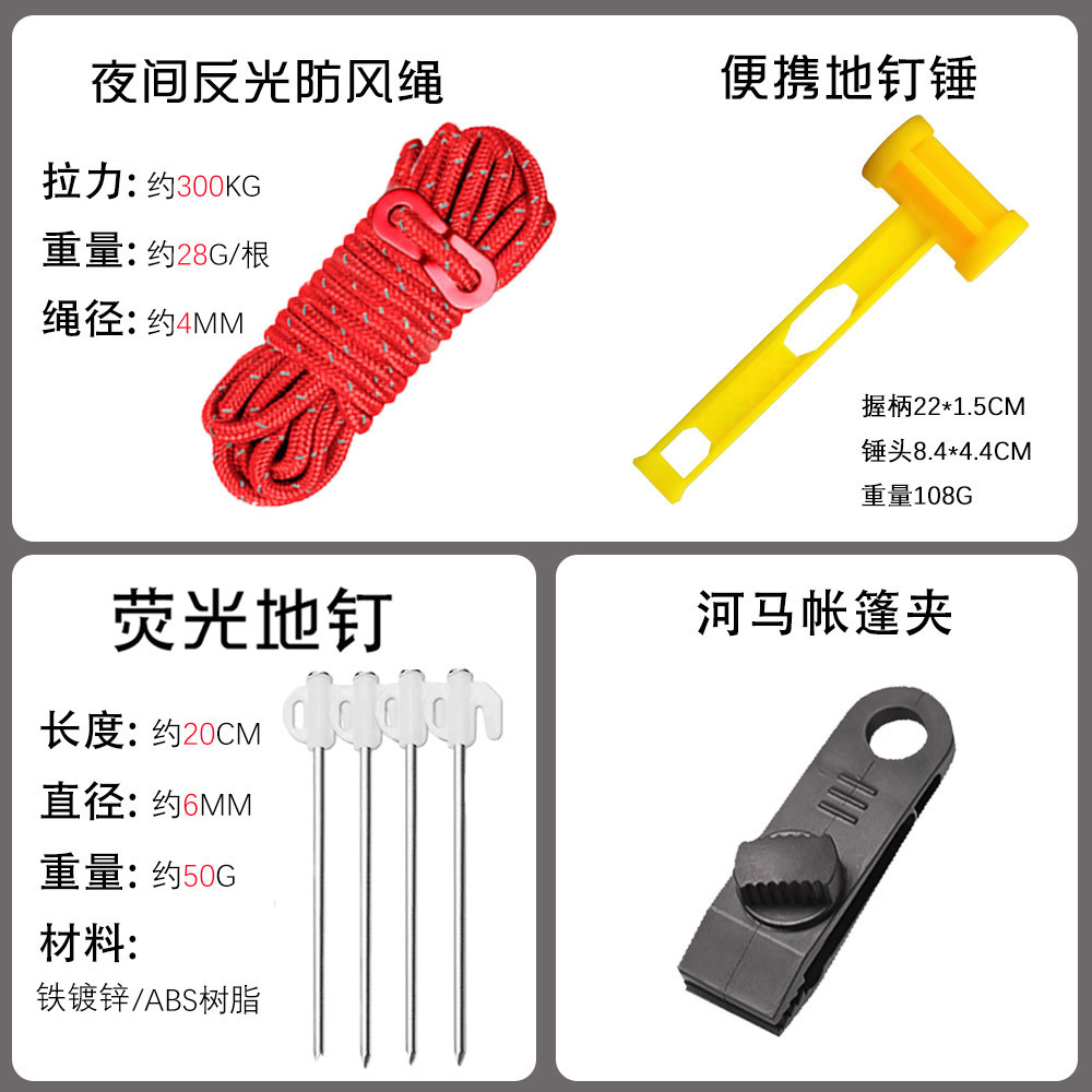 • 빨간색 반사 방풍 로프 4개 + 접지 못 4개 + 클립 4개 + 망치 + 카키색 보관 가방