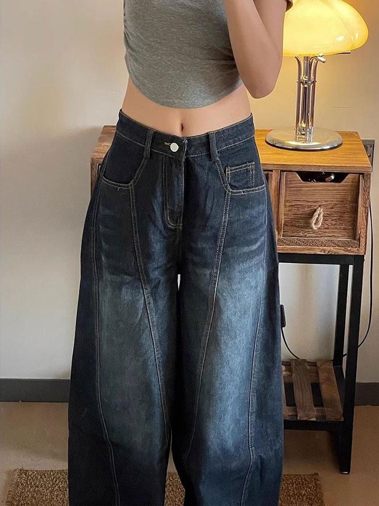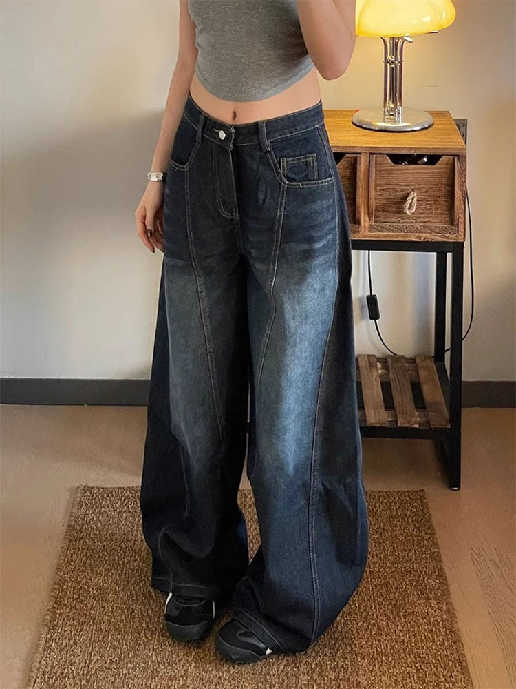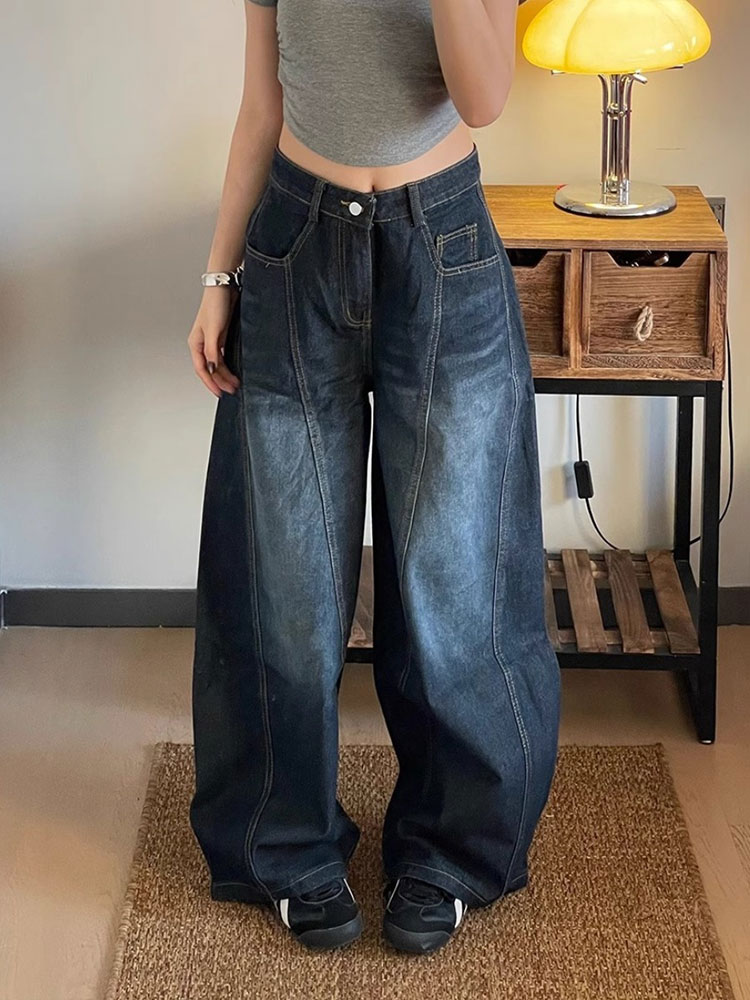 아메리칸 스타일 하이 스트리트 빈티지 씻어 마 체테 청바지 여성 핫 걸 디자인 와이드 레그 캐주얼 슬림 룩 오래 된 걸레 바지스토어 가기