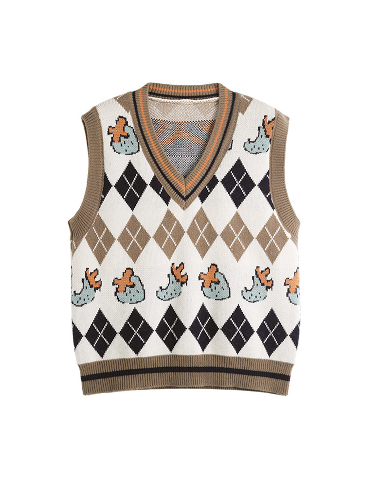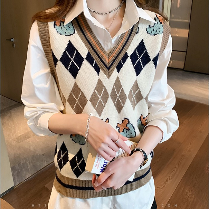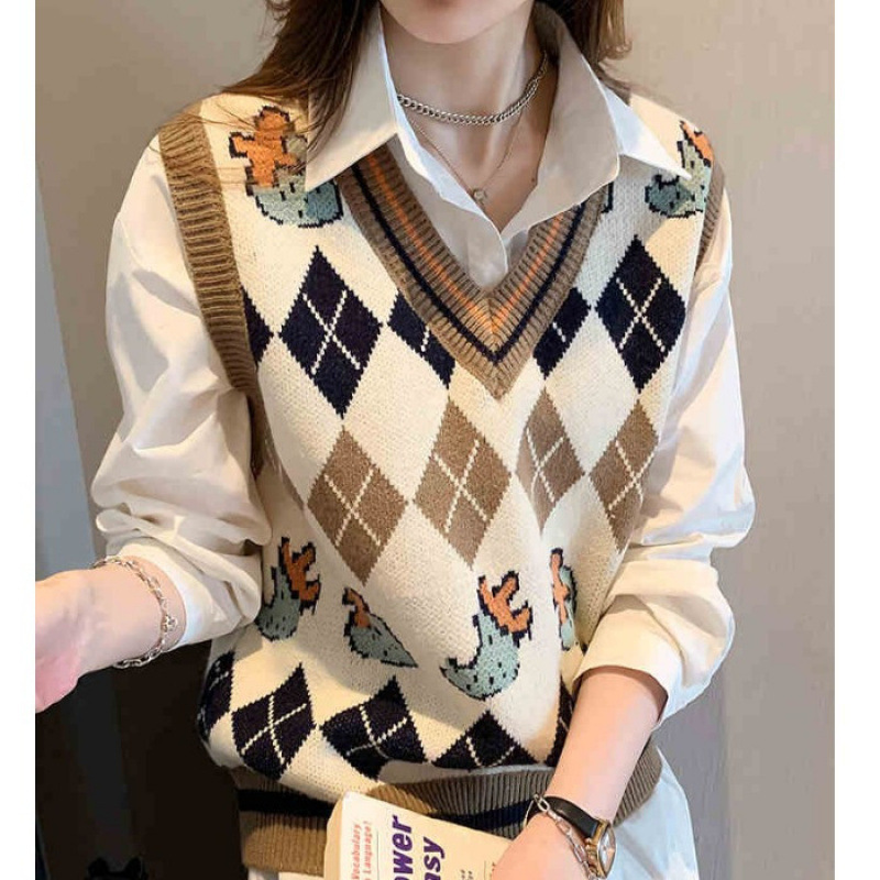 패션 프린팅 니트웨어 조끼 여성 가을 및 겨울 루즈 스택 민소매 웨이스트 코트 V 넥 트렌디 여성 스웨터