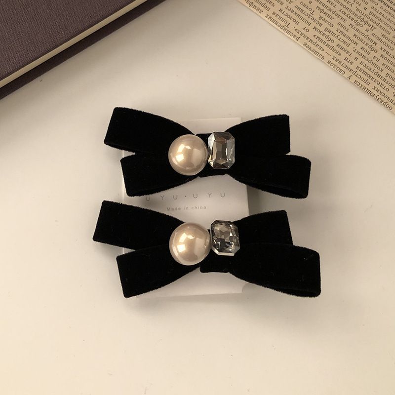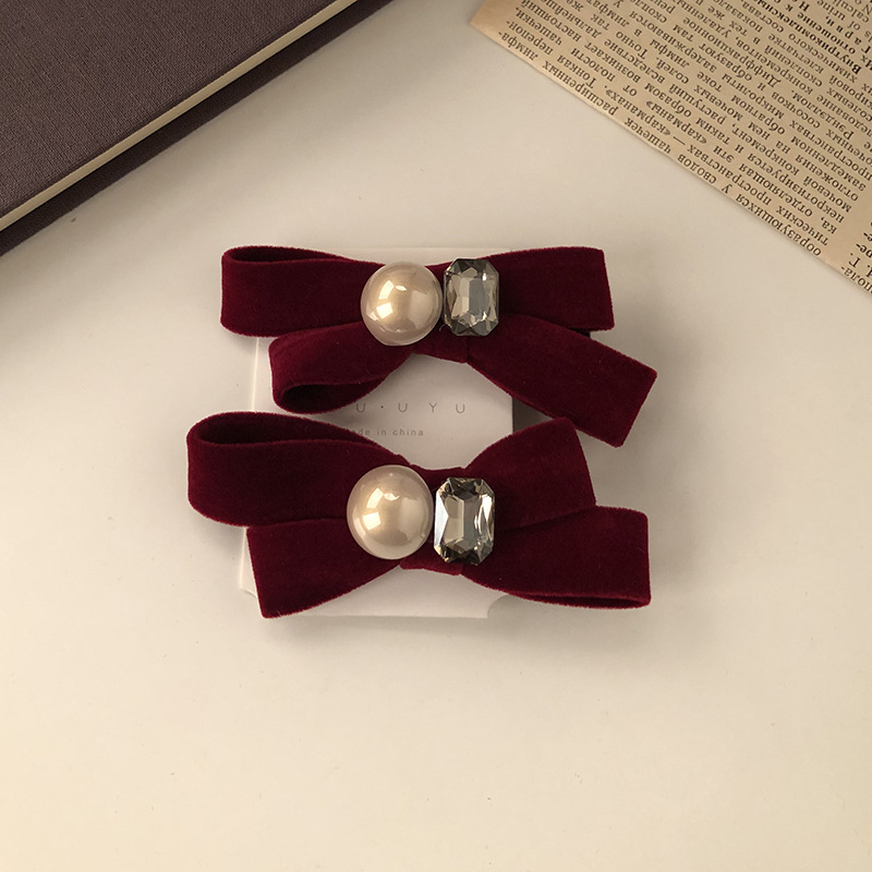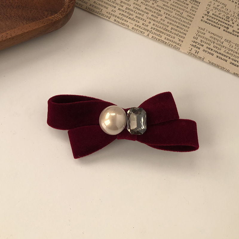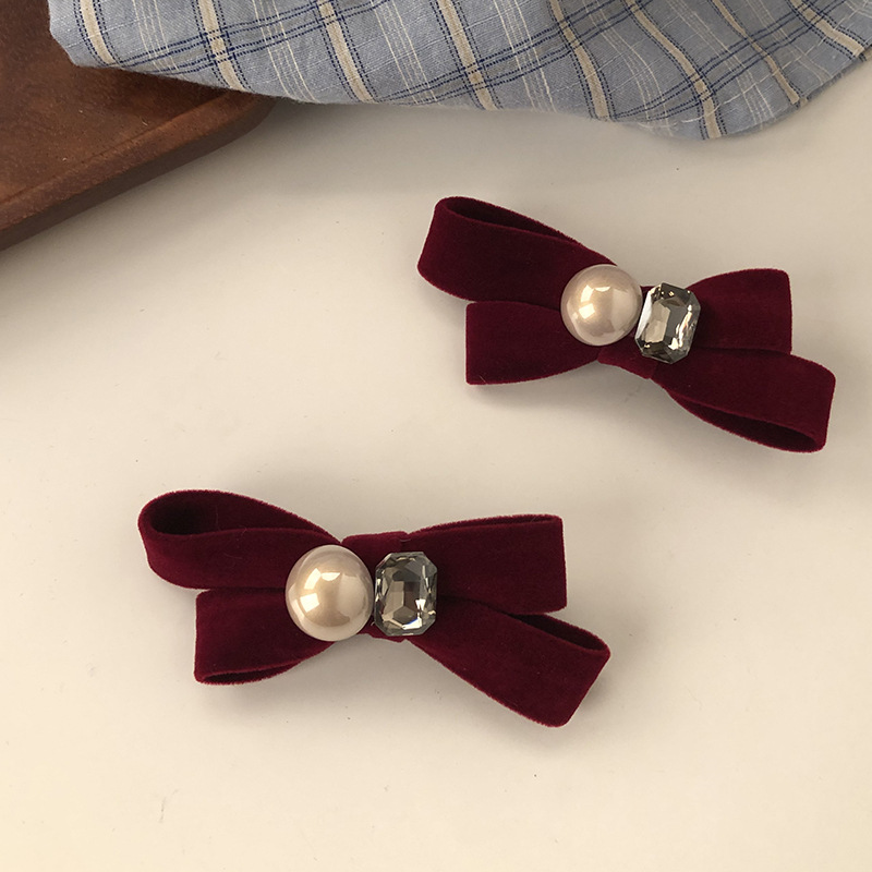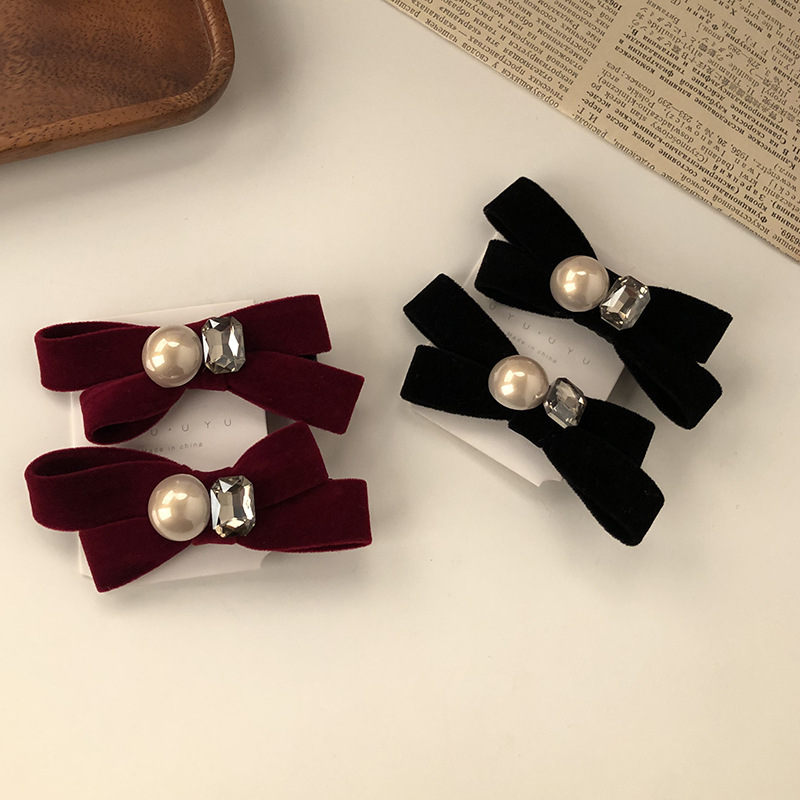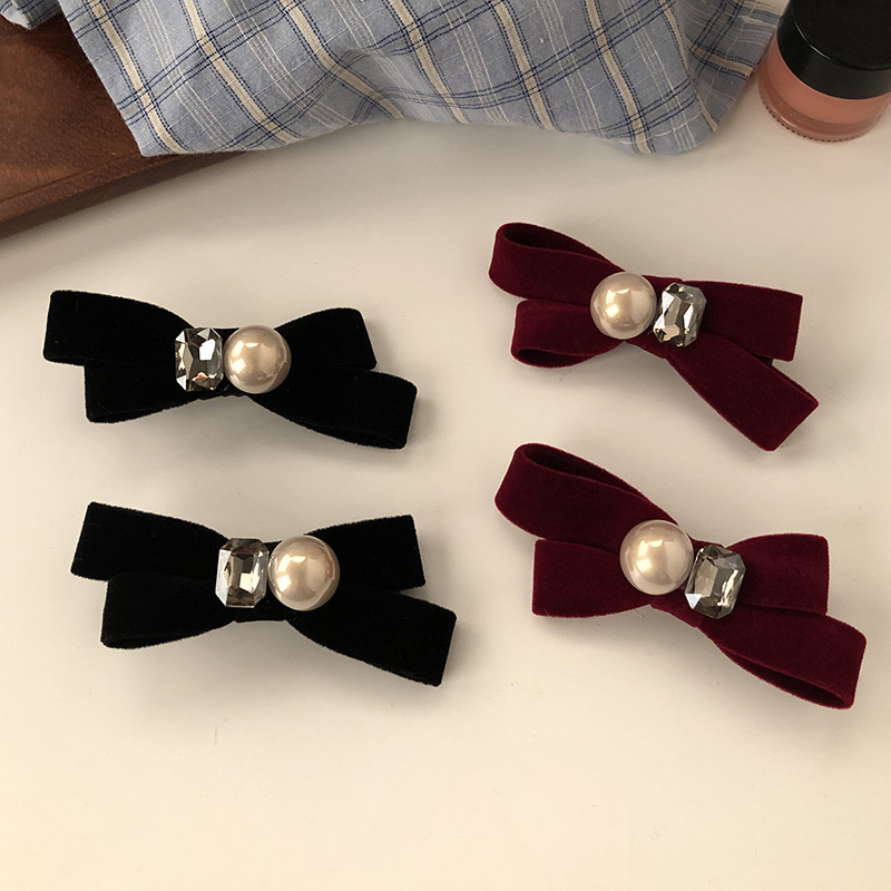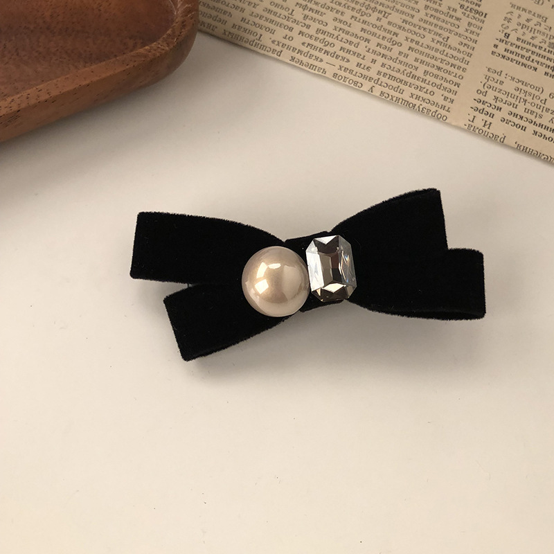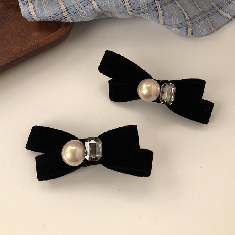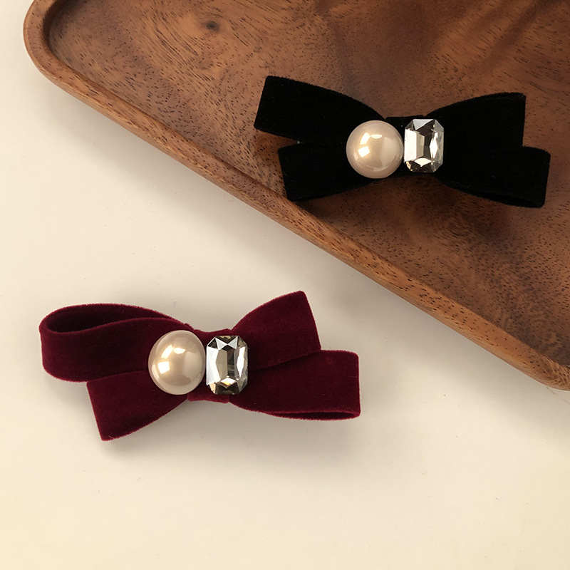 라인스톤 펄 벨벳 활 머리핀 여성용 빈티지 우아한 덕빌 클립 프론트 사이드 뱅 헤어핀 헤드웨어