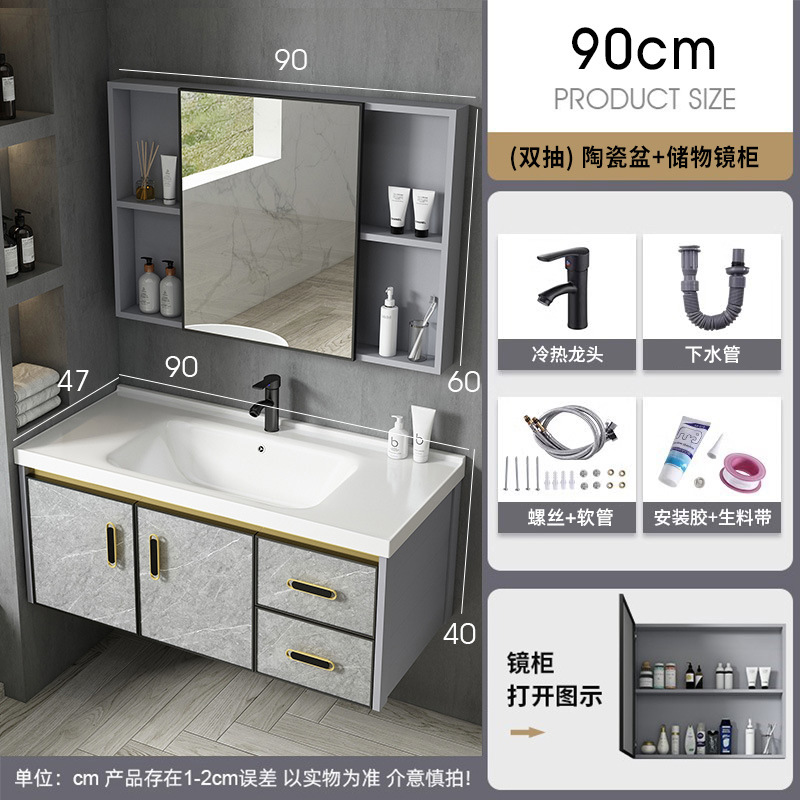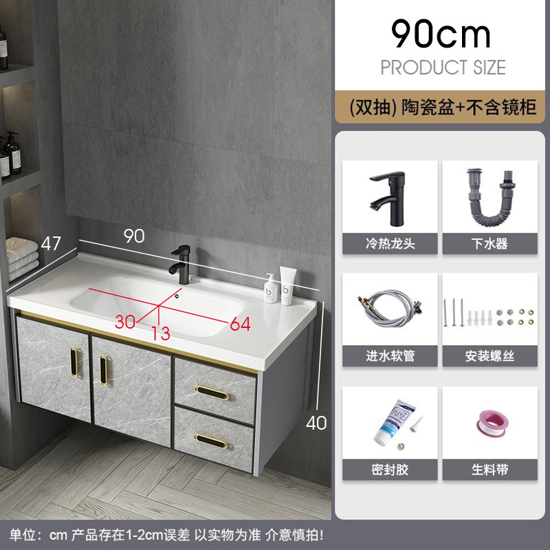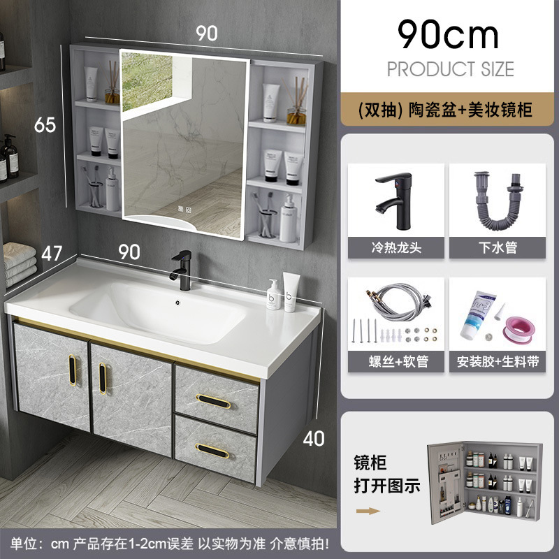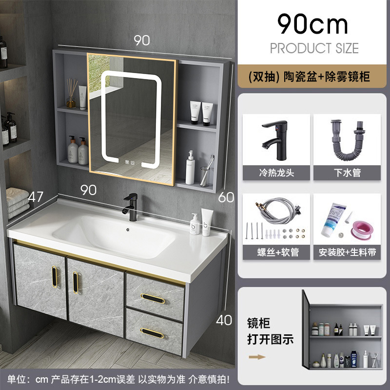 • 90 그레이 더블 펌프 - 플랫 세면대 캐비닛 + 수도꼭지 + 김서림 방지 야광 거울 캐비닛