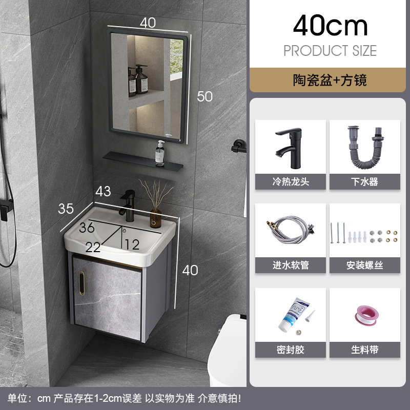 • 40 회색 단일 도어 세면대 캐비닛 + 수도꼭지 + 사각 거울