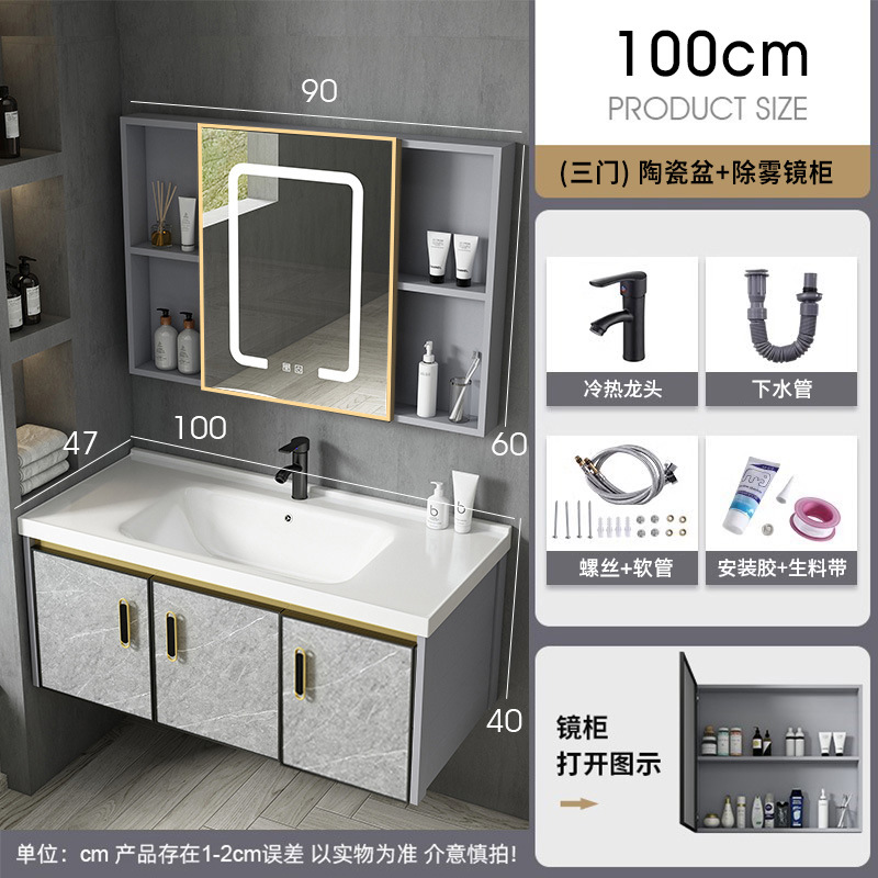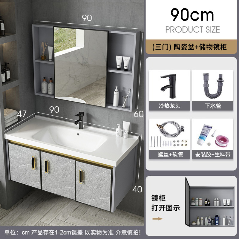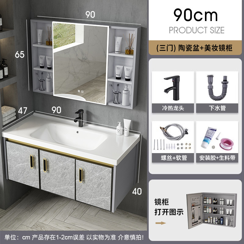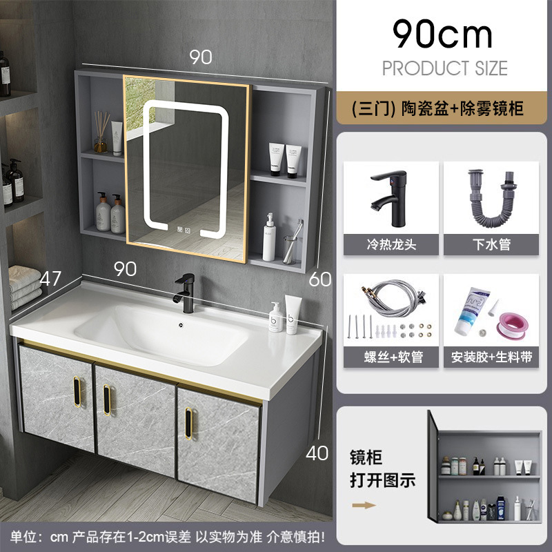 • 90 그레이 3도어 평면 세면대 캐비닛 + 수도꼭지 + 김서림 방지 야광 거울 캐비닛