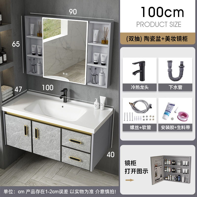 • 100 그레이 더블 펌프 - 플랫 세면대 캐비닛 + 수도꼭지 + 김서림 방지 야광 거울 캐비닛