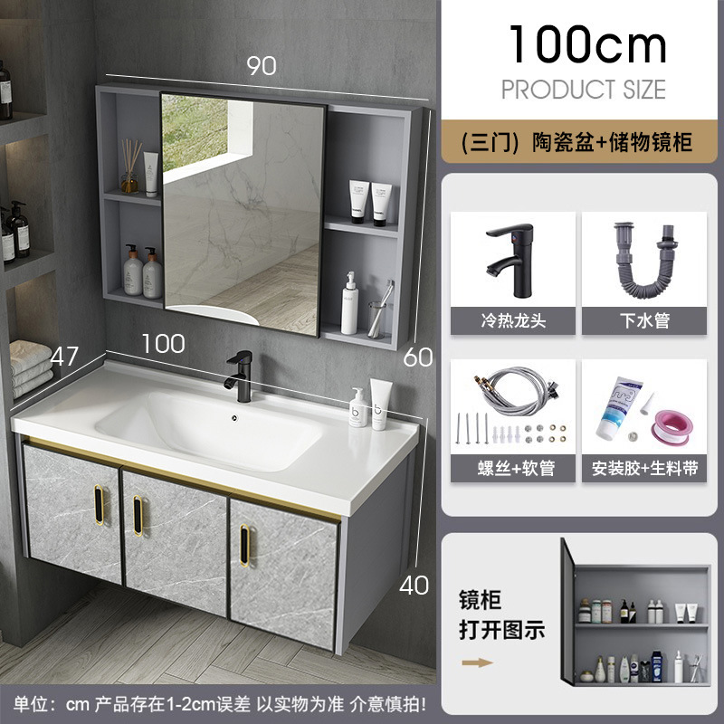 • 100 그레이 3도어 평면 세면대 캐비닛 + 수도꼭지 + 수납 거울 캐비닛